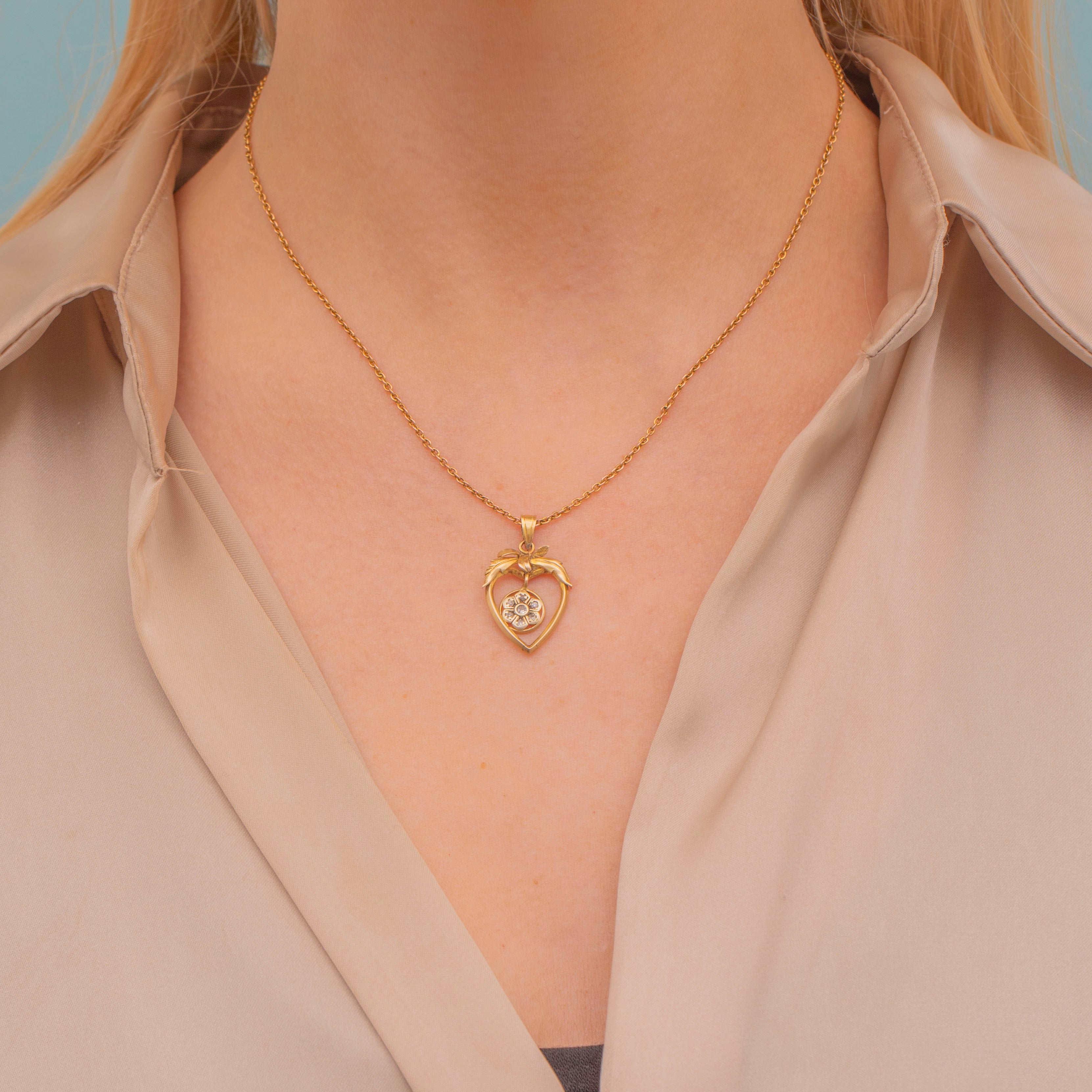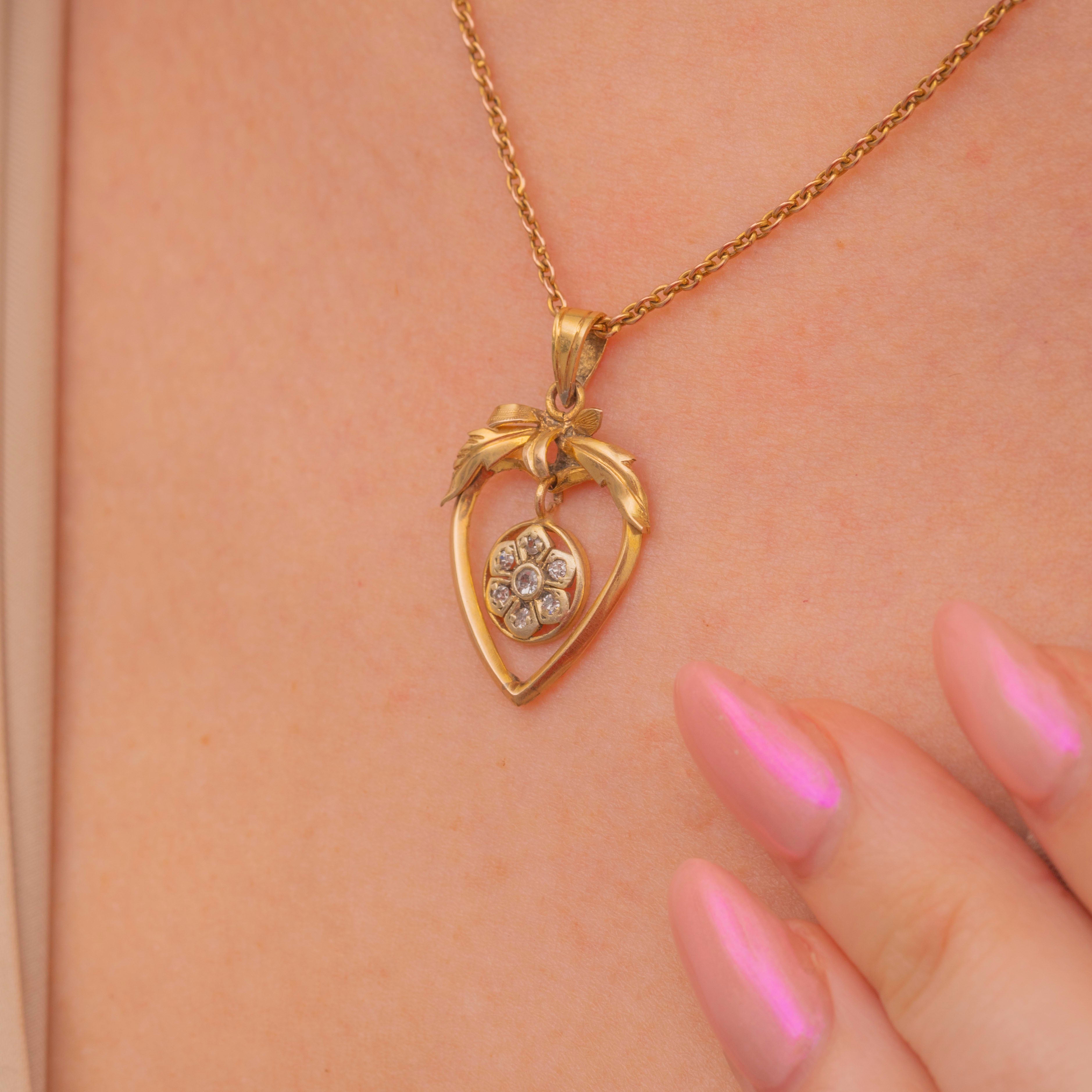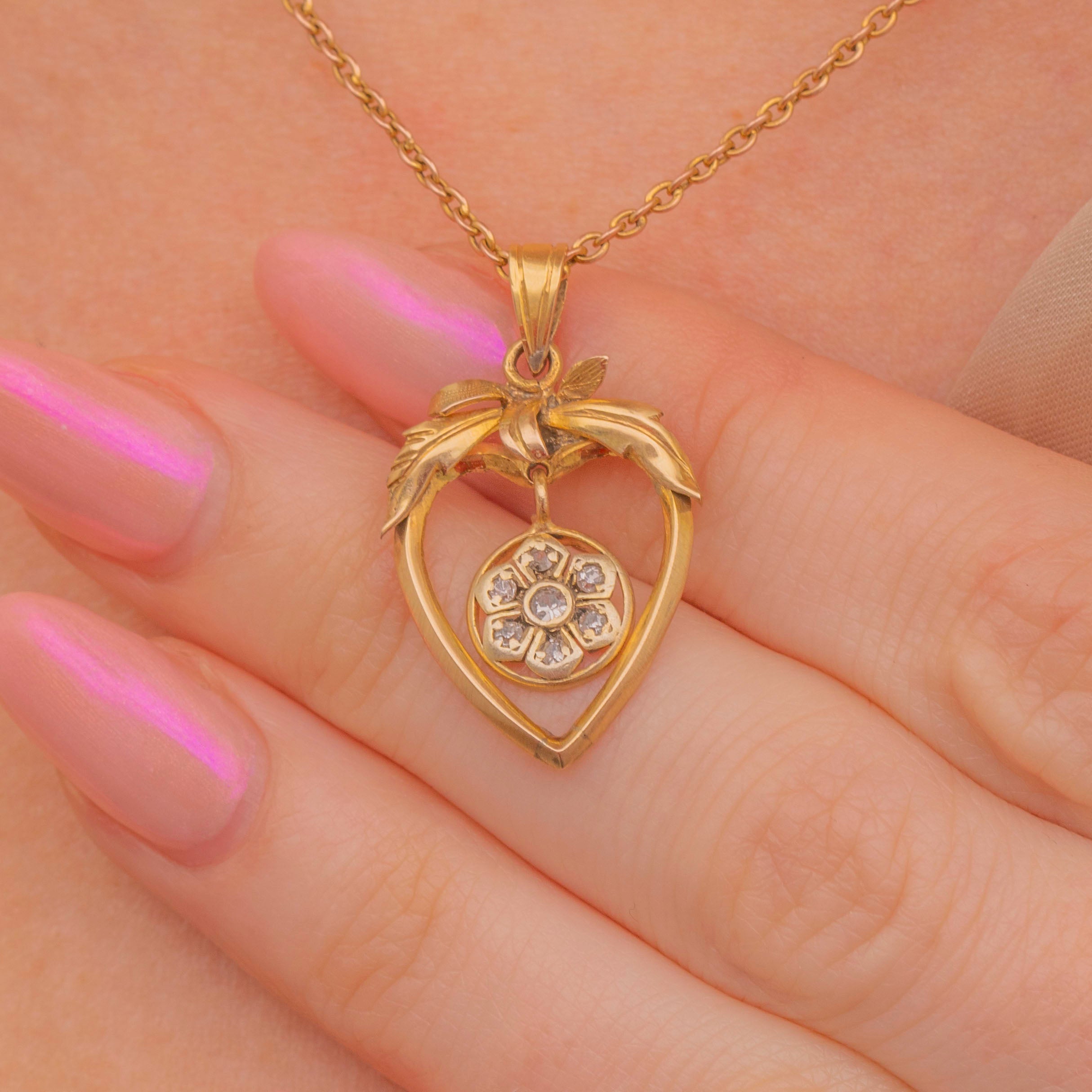 This Edwardian 9ct Gold pendant has been meticulously crafted in a heart shaped design, adorned by ribbon foliage and features a Diamond floral drop in her centre. Each twinkling old antique cut Diamond catches the light wonderfully, securely set within their petal settings.