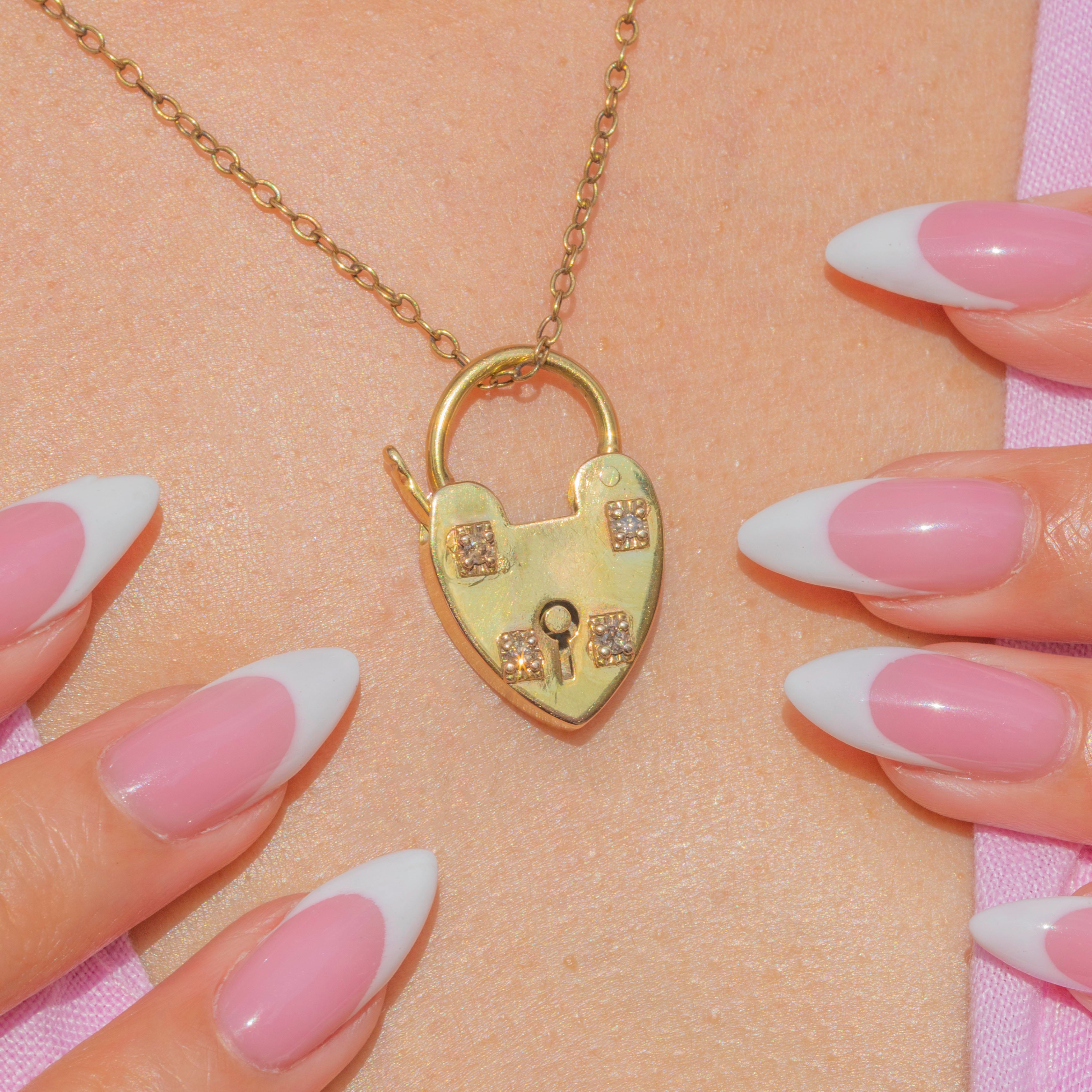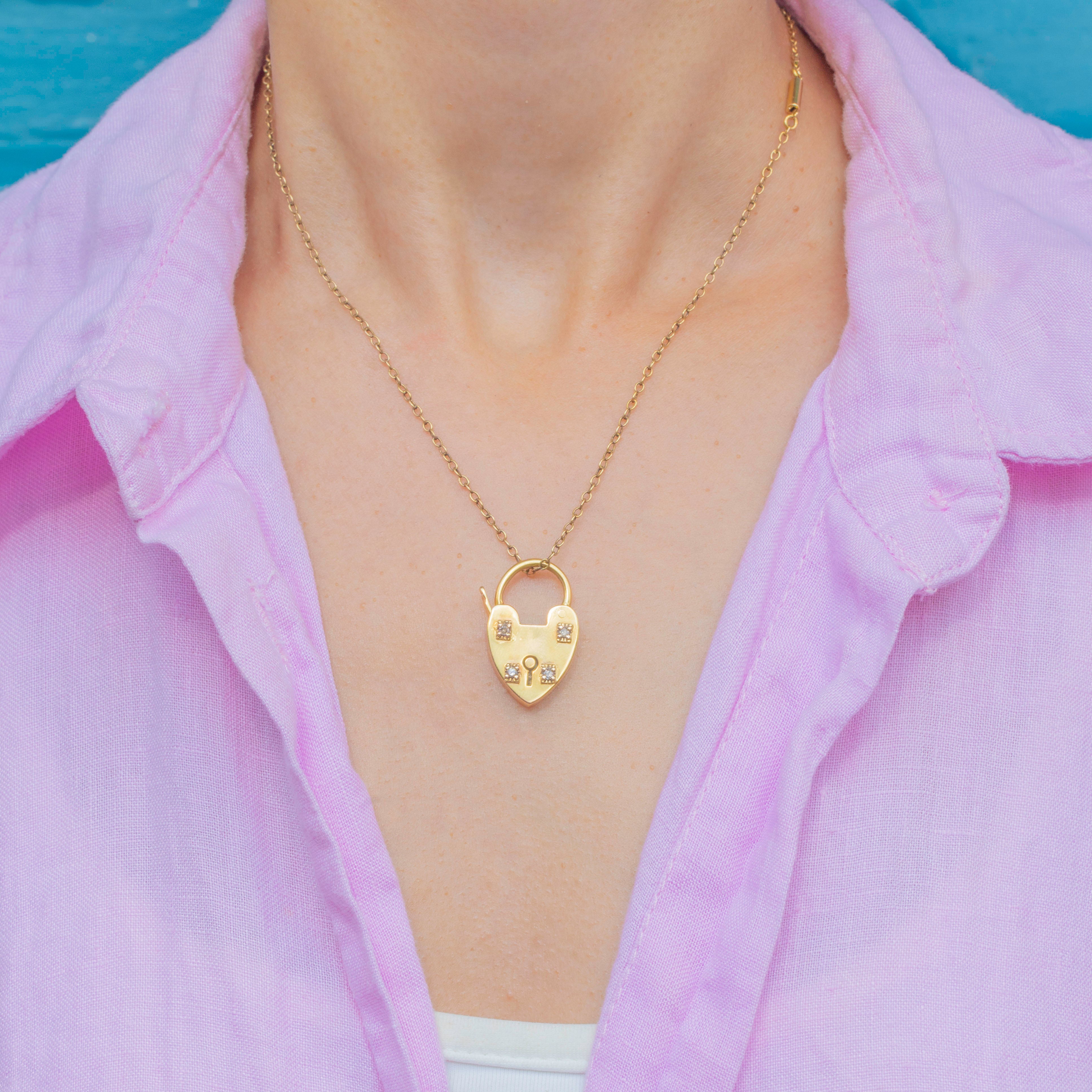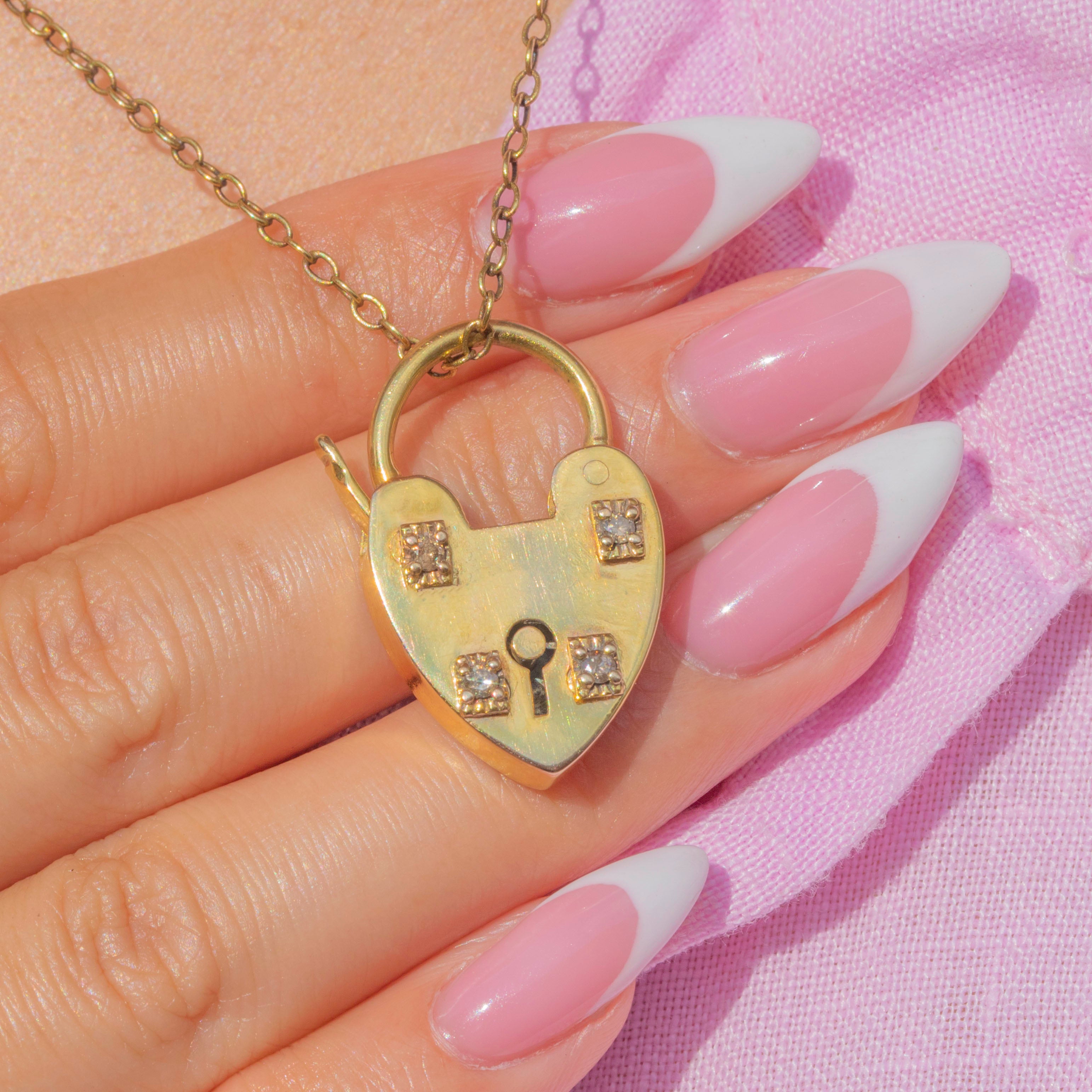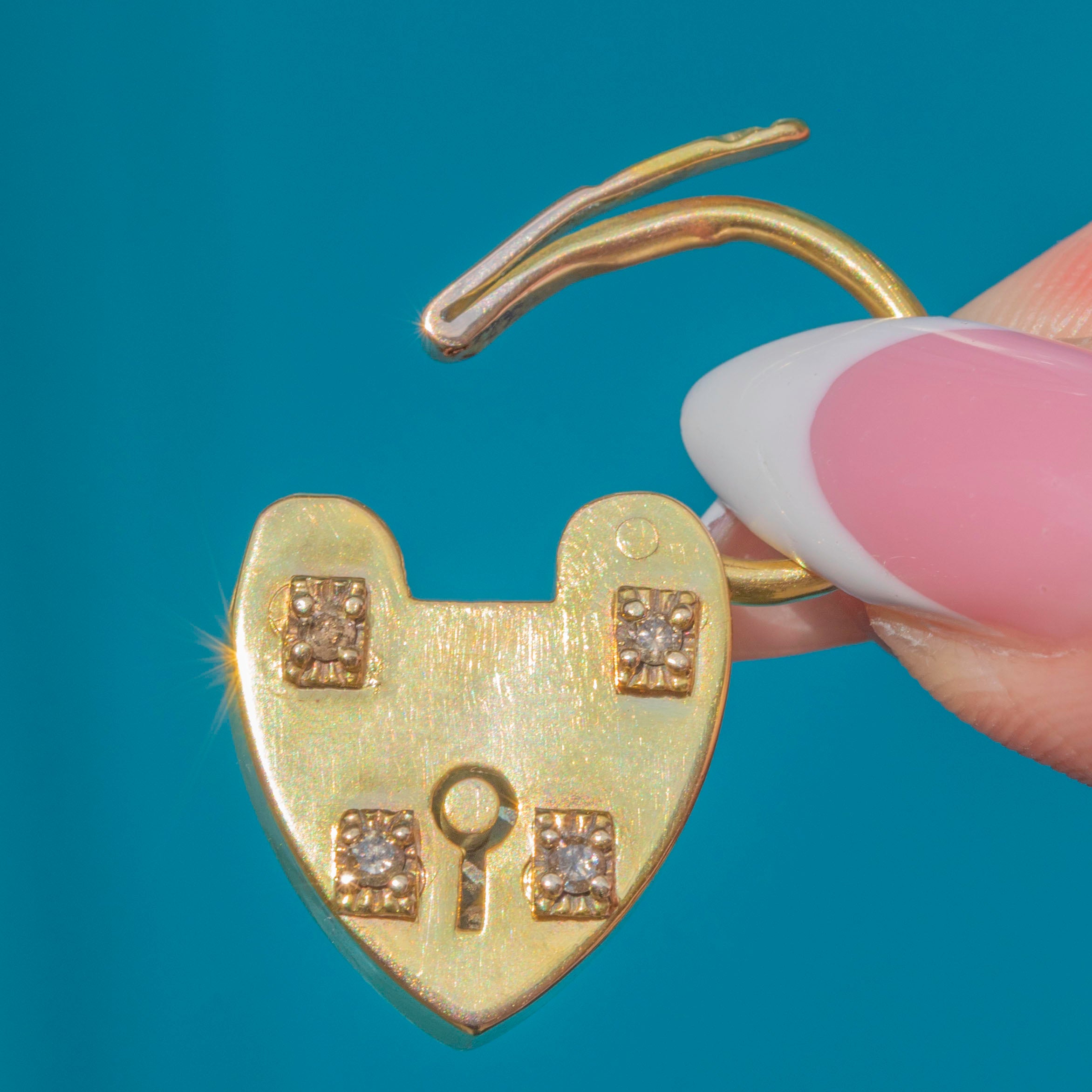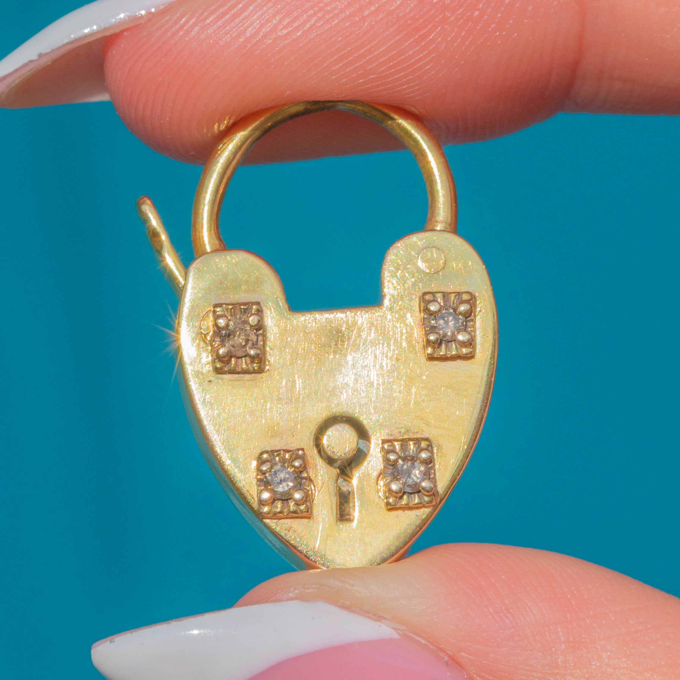 EXCELLENT: The Gold is bright and buttery, with little signs of surface wear despite its age. Each of the Diamonds is securely set and with a functioning lever, this antique heart padlock can be worn with utmost confidence.