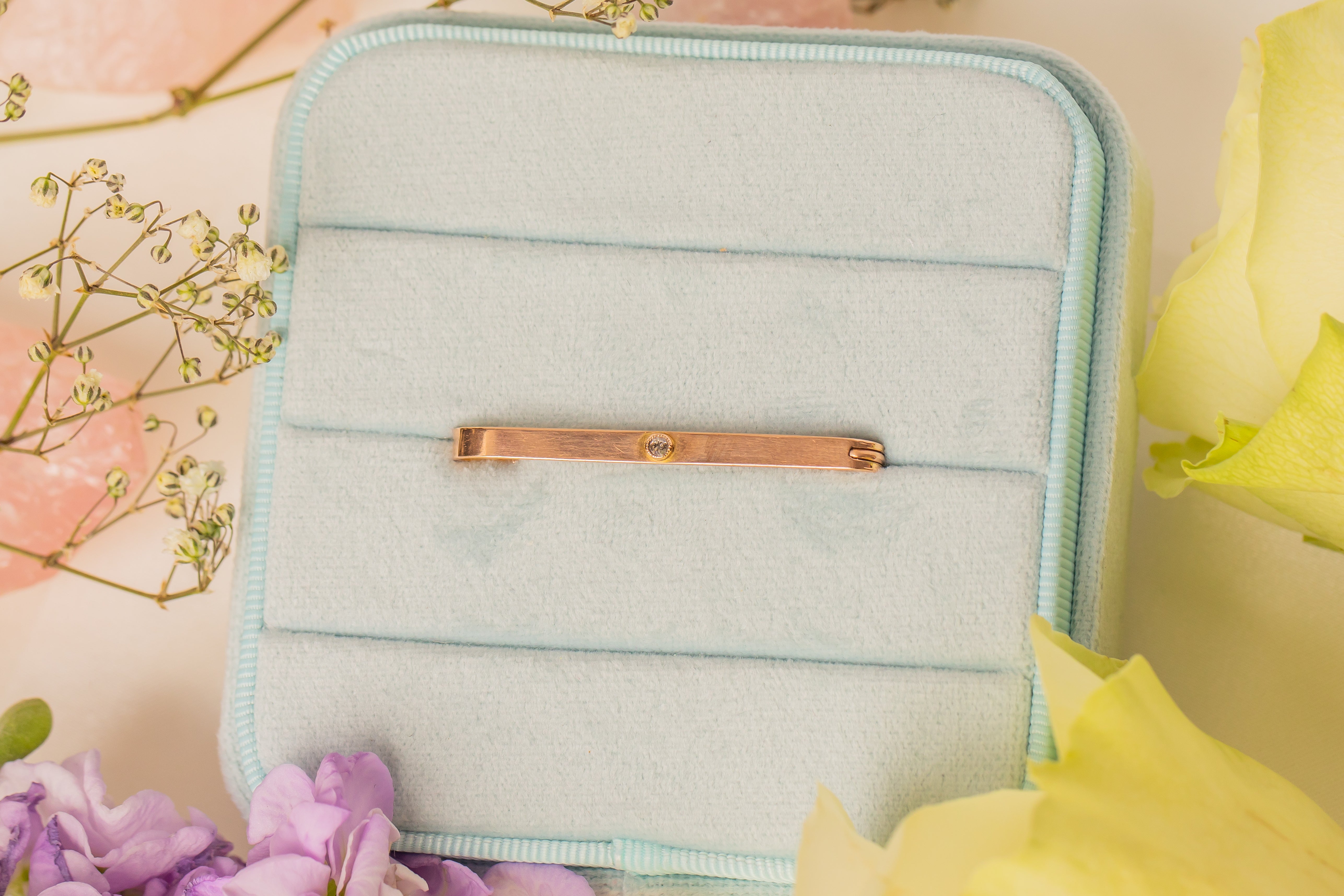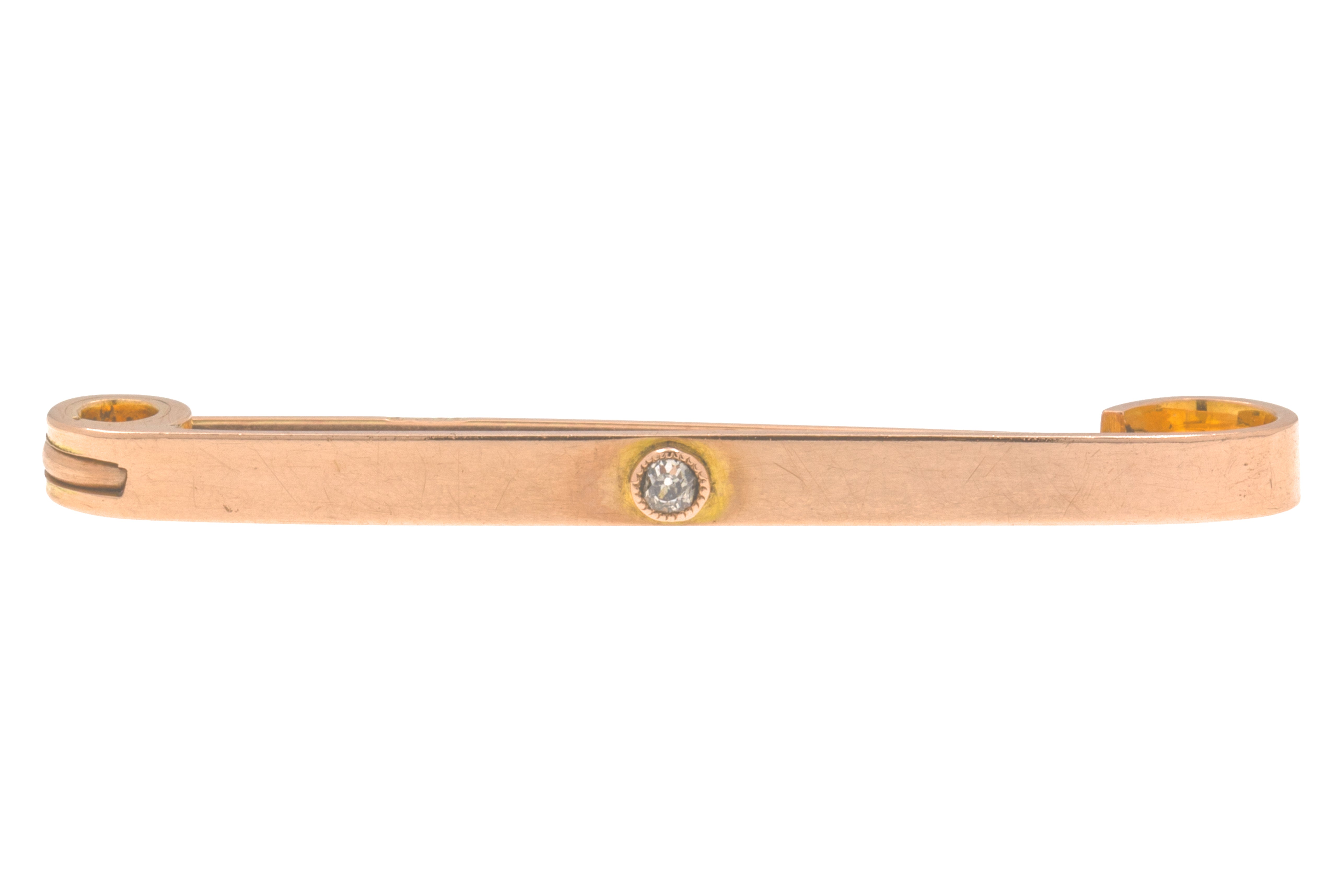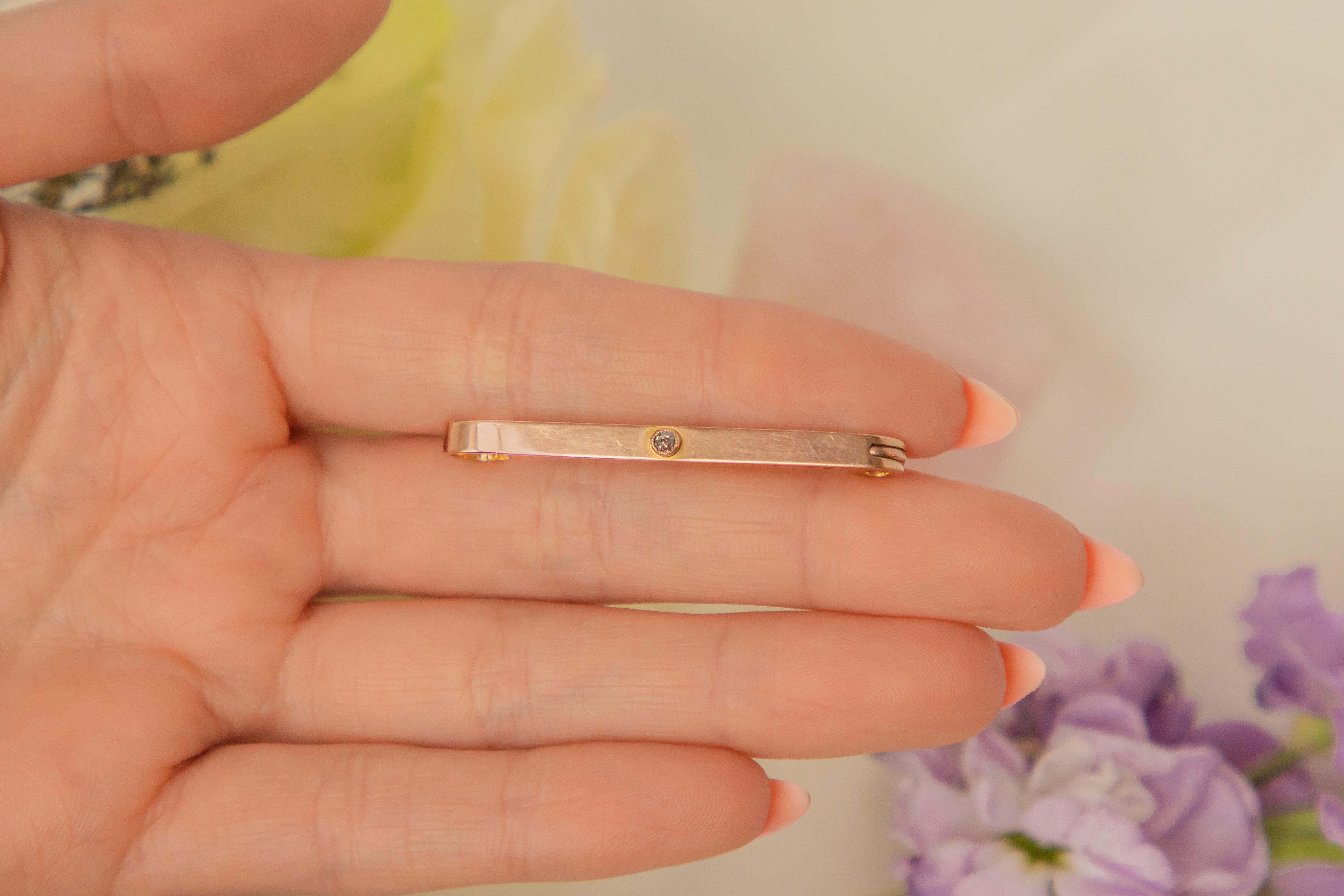 EXCELLENT. This antique 9ct Rose Gold Diamond bar brooch is in excellent condition. This treasure has a lovely little Diamond at its centre, which is free from any fleabites and securely set. The pin has a gorgeous hue and is in perfect working order, promising you decades of wear!