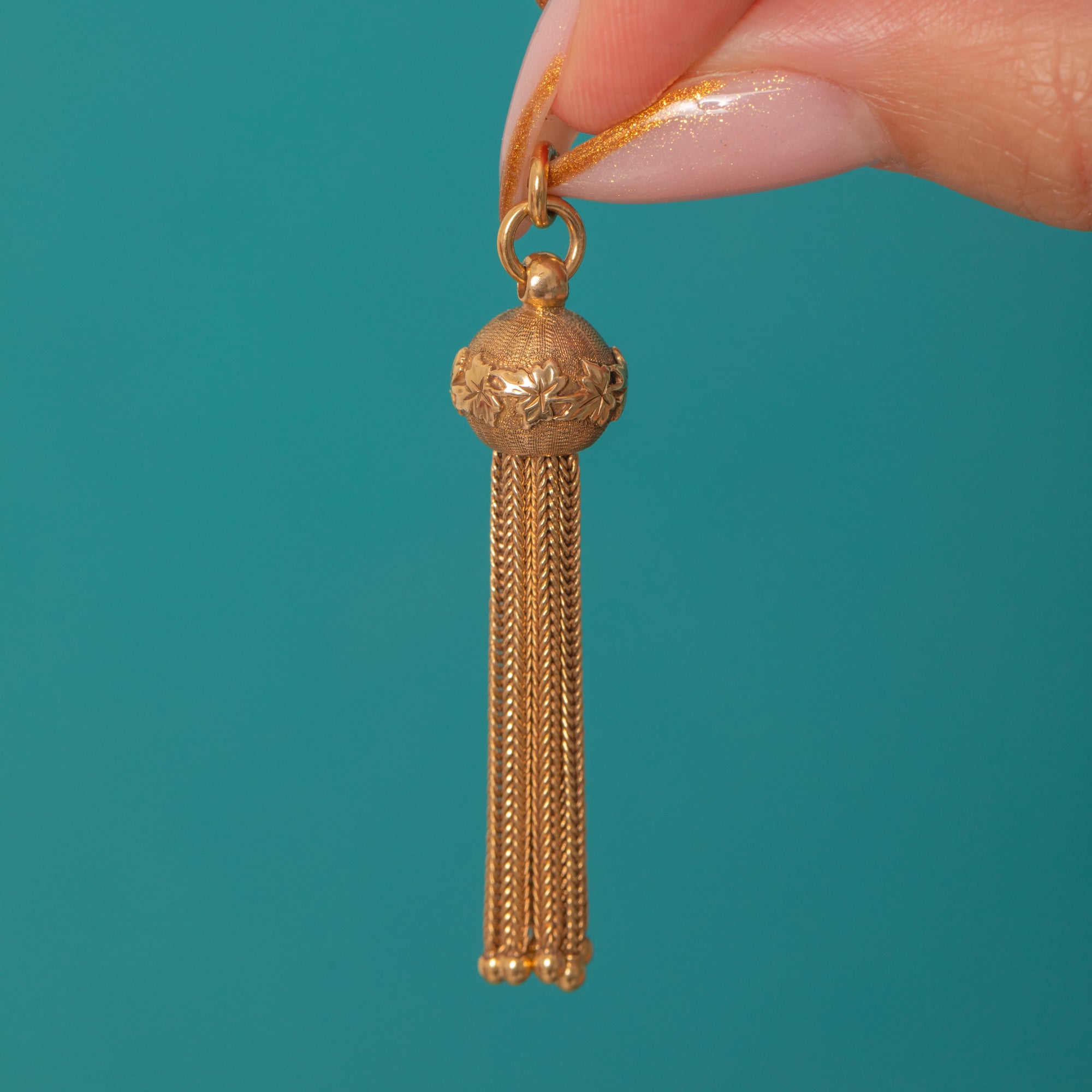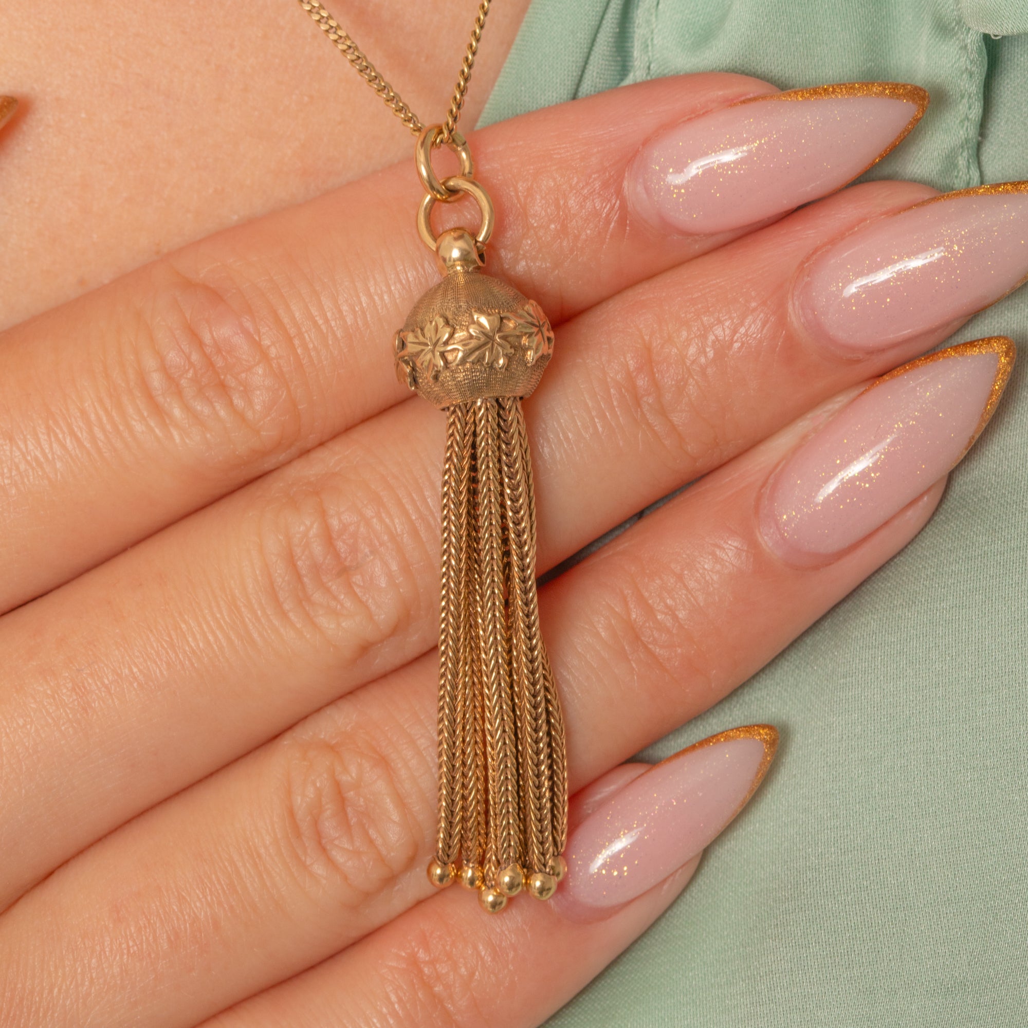 This wonderful Victorian tassel charm is richly detailed with fig and ivy leaf motifs, a lovely domed cap, and fully articulated fox-tail tassels that sway beautifully with every movement. Crafted in warm 9ct Gold, it has that perfect antique texture—crisp beading, deeply chased leaves and a soft aged glow that only true Victorian pieces develop over time.