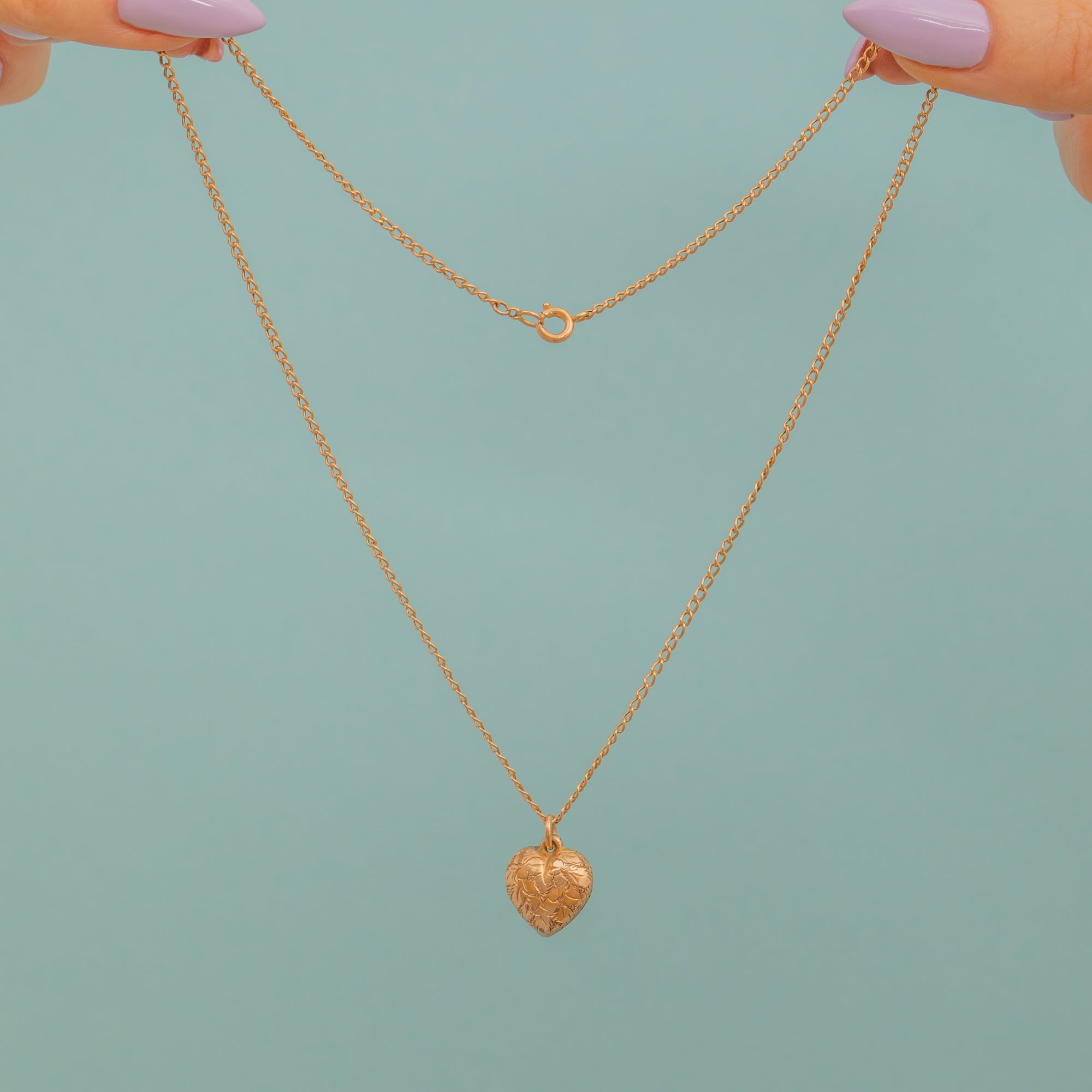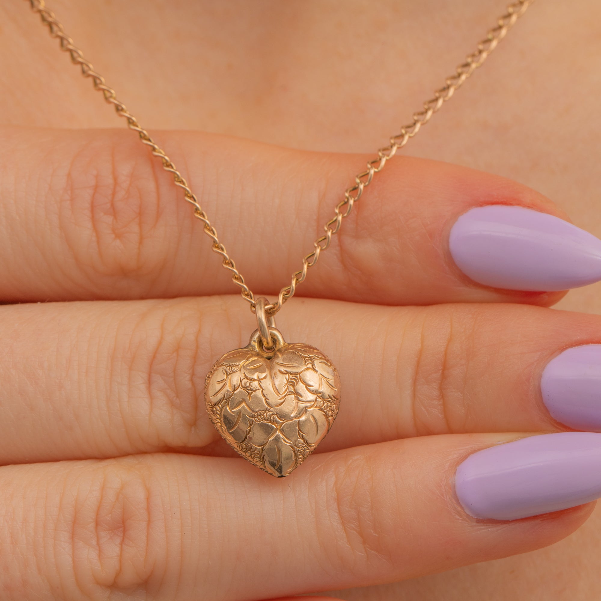 Crafted from buttery 9ct Gold, this Victorian heart pendant exudes a lovely warmth and has a satisfying sleek, and elegant finish. The puffy heart form is intricately engraved, and comes complete with a 16" curb chain, making this piece ready to wear!