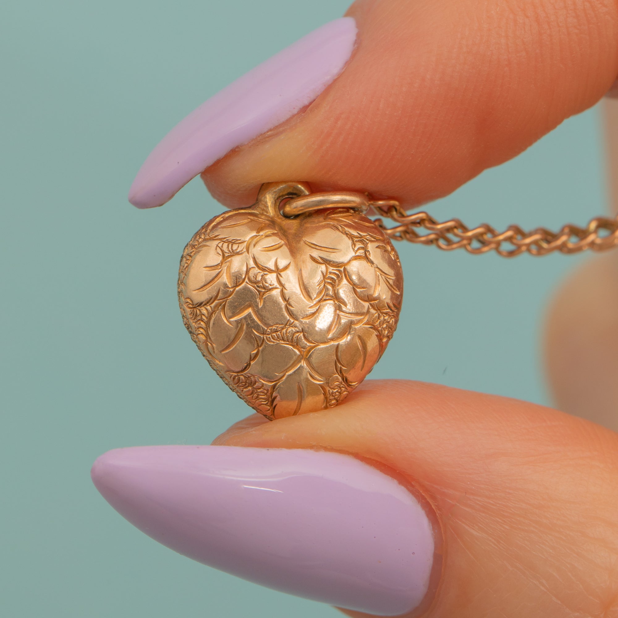 EXCELLENT. This antique 9ct Gold engraved puffy heart charm is in fantastic condition. The Gold is saturated and the heart form is free from dings with the engraved details remaining crisp. The curb chain has securely connected links and a fully functioning bolt ring allowing you to wear her with absolute confidence!