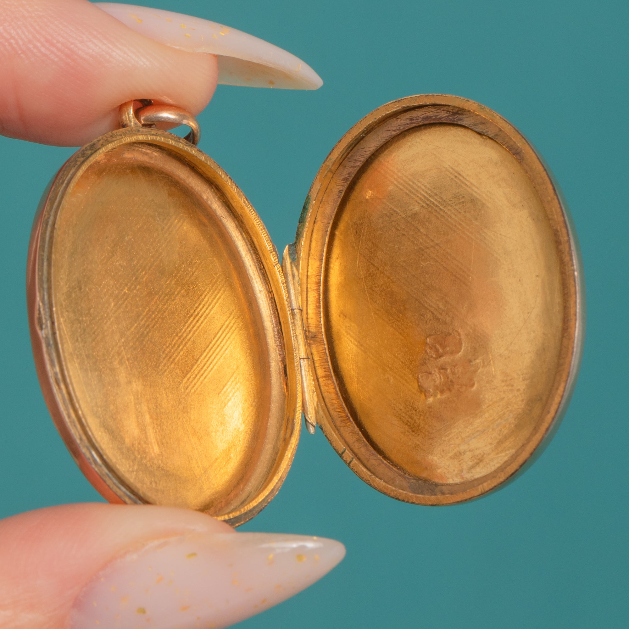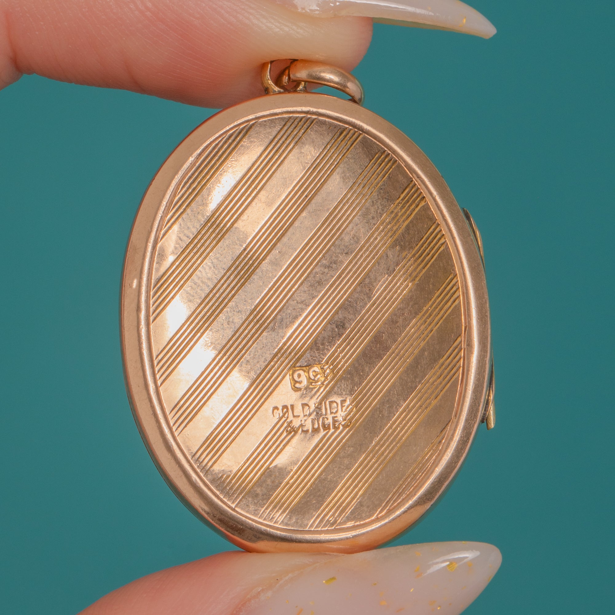 Refined and beautifully wearable, this Edwardian oval locket is crafted in 9ct Gold with a warm yellow-rosy glow. Both faces are adorned with crisp engine-turned diagonal stripes, anchored by a blank scroll cartouche ready for a personal engraving—classic, elegant and forever chic.