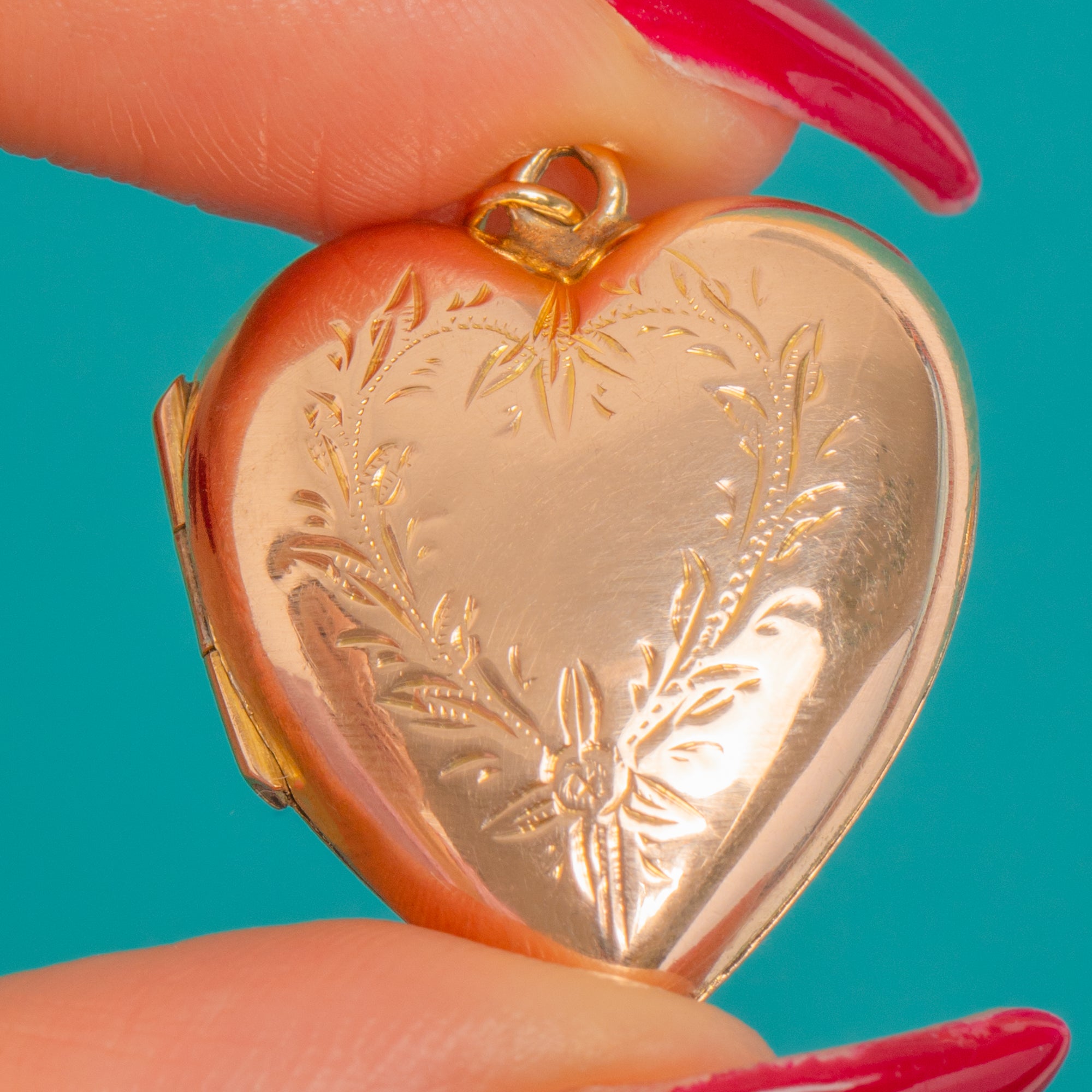 Romance in miniature, this Victorian puffy heart locket is beautifully domed and engraved with a delicate foliate wreath that frames a plain cartouche—perfect for a tiny monogram if you wish. Its glossy 9ct Gold back & front construction gives a warm glow and timeless elegance, while the smooth polished reverse makes it a dream to wear every day.