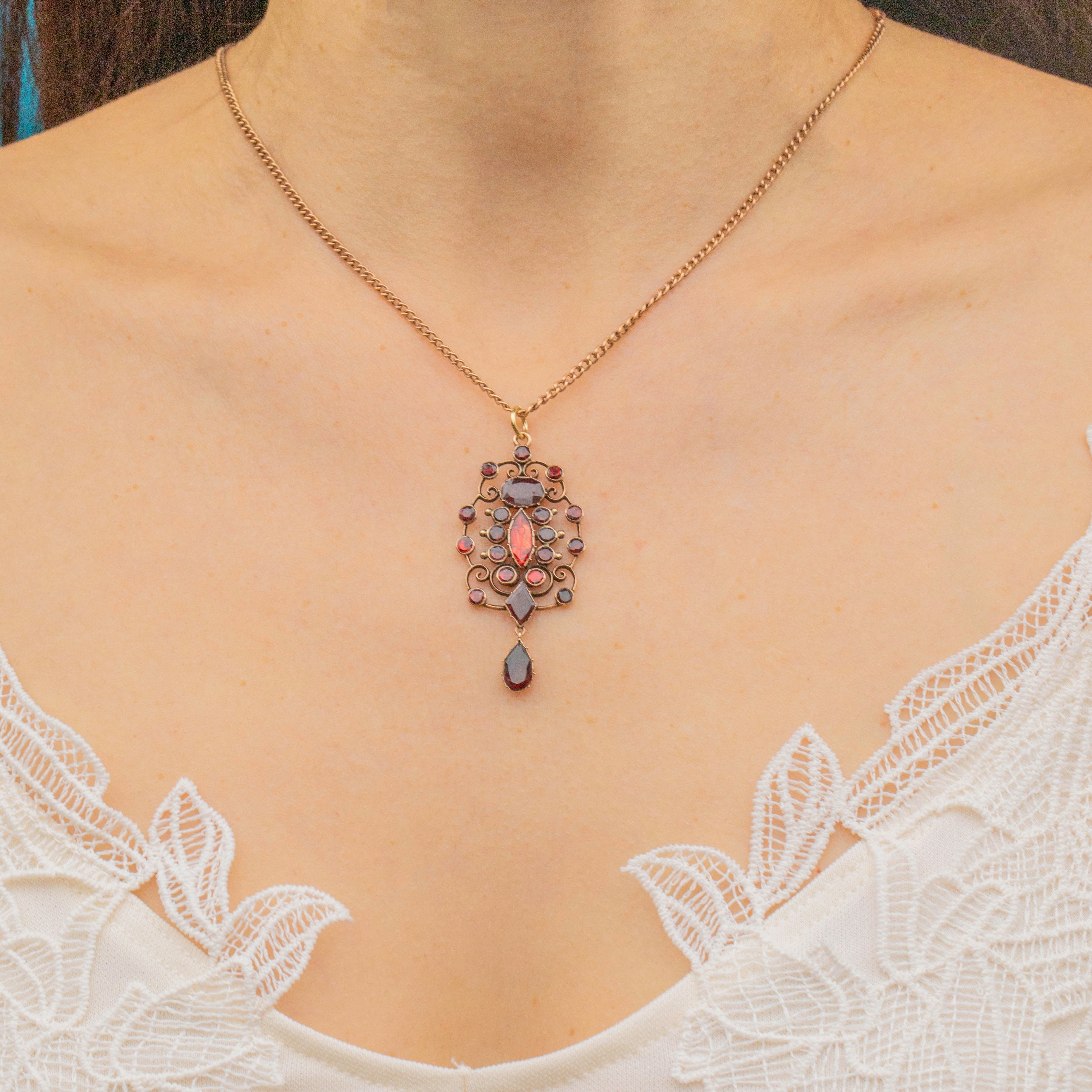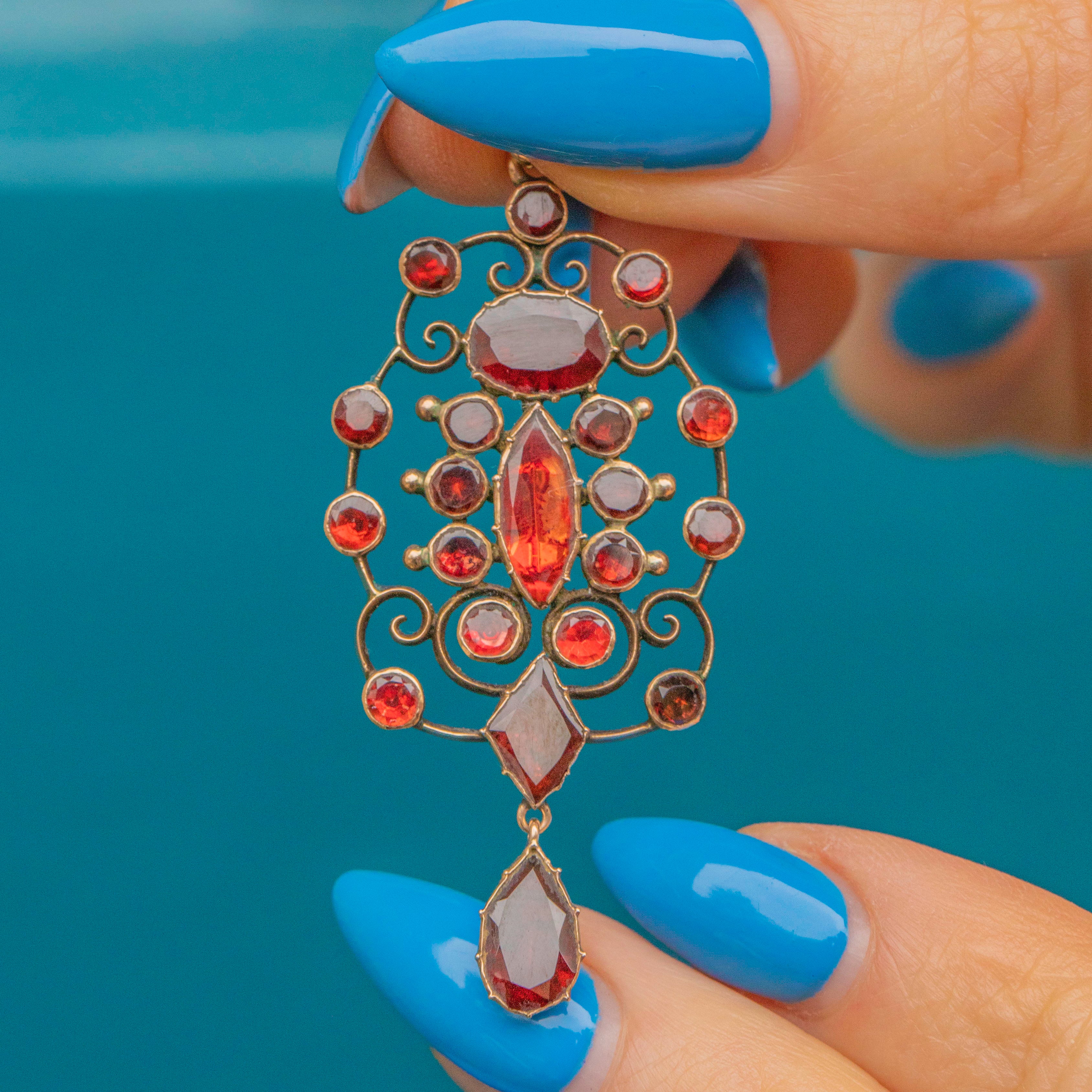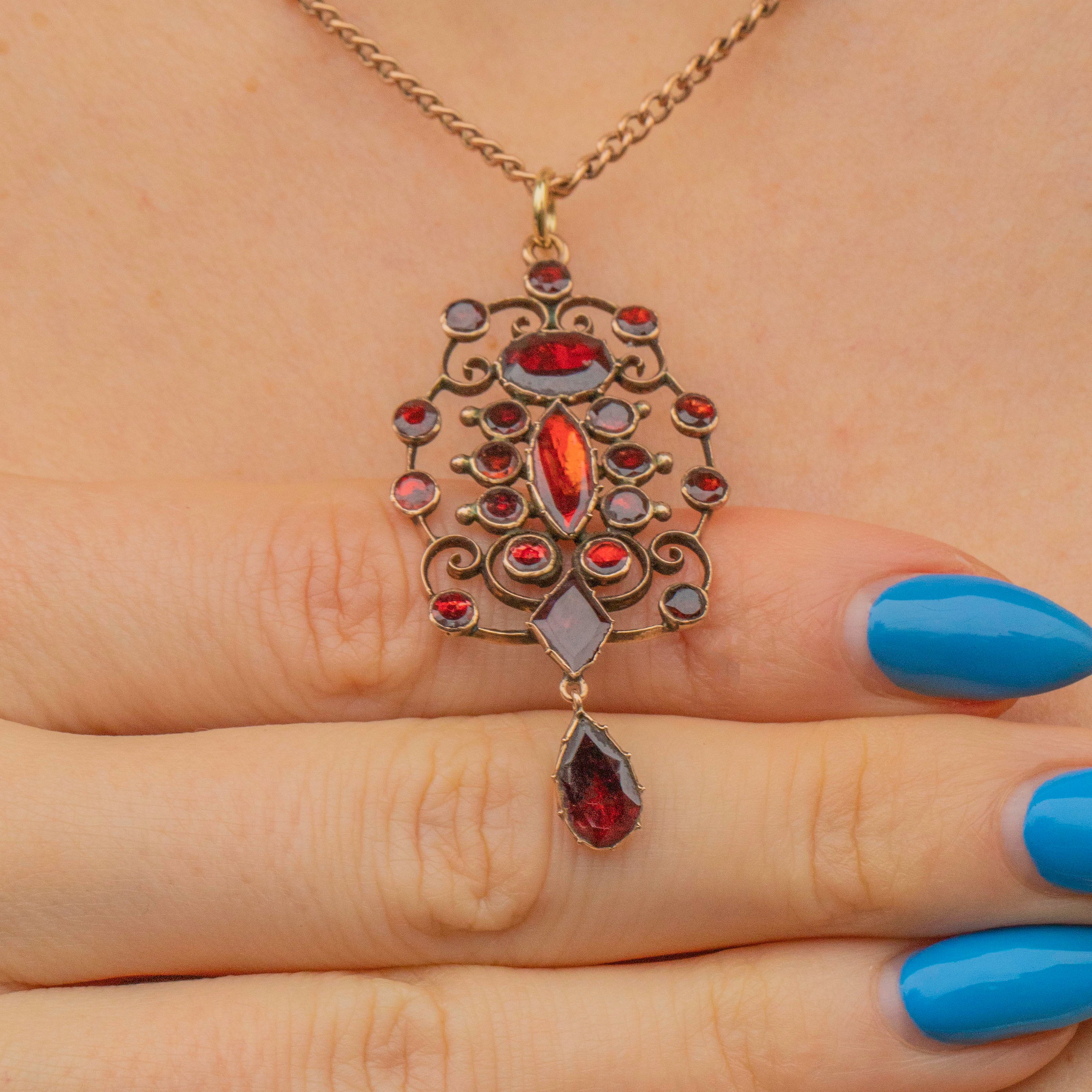 Add a touch of regal sophistication to your collection with this antique 9ct Gold flat-cut Garnet drop pendant!