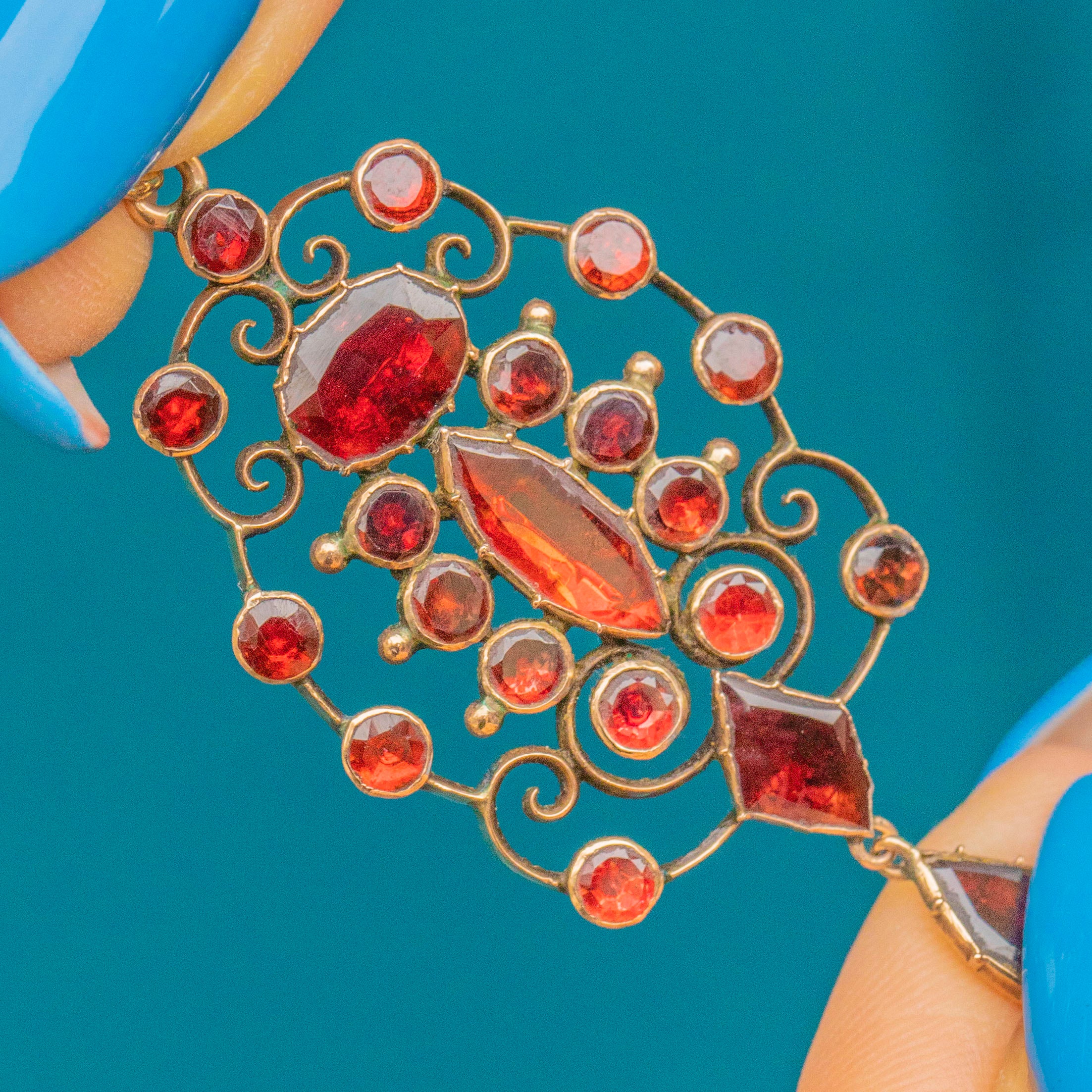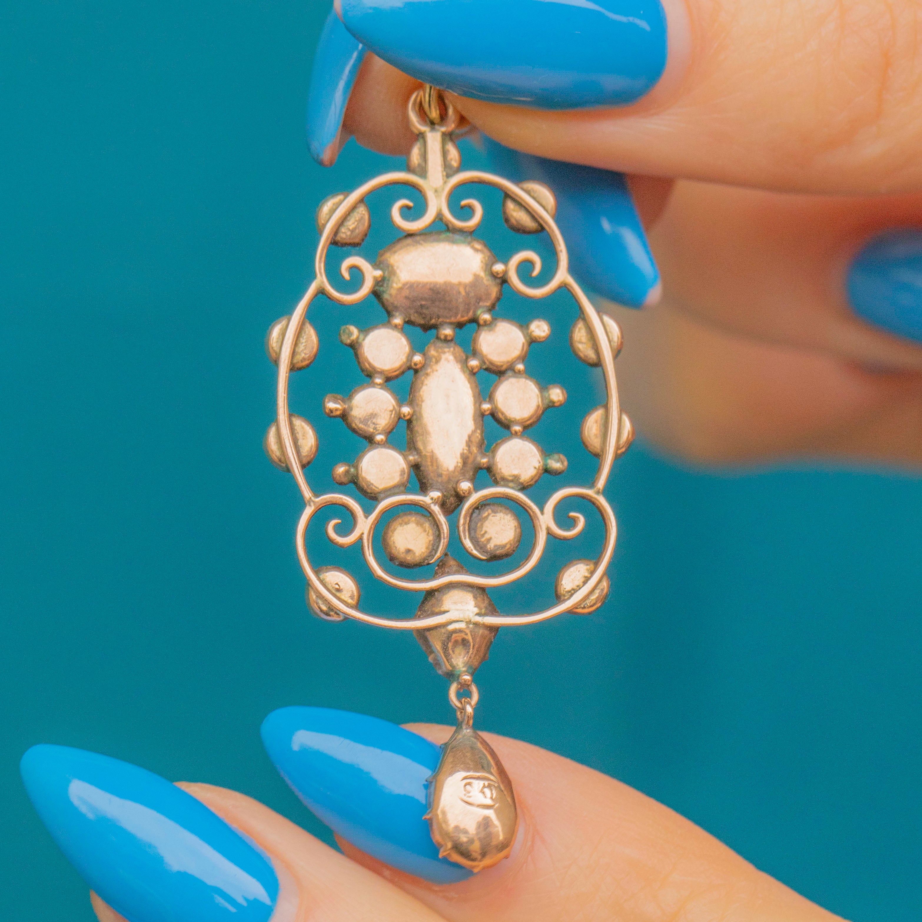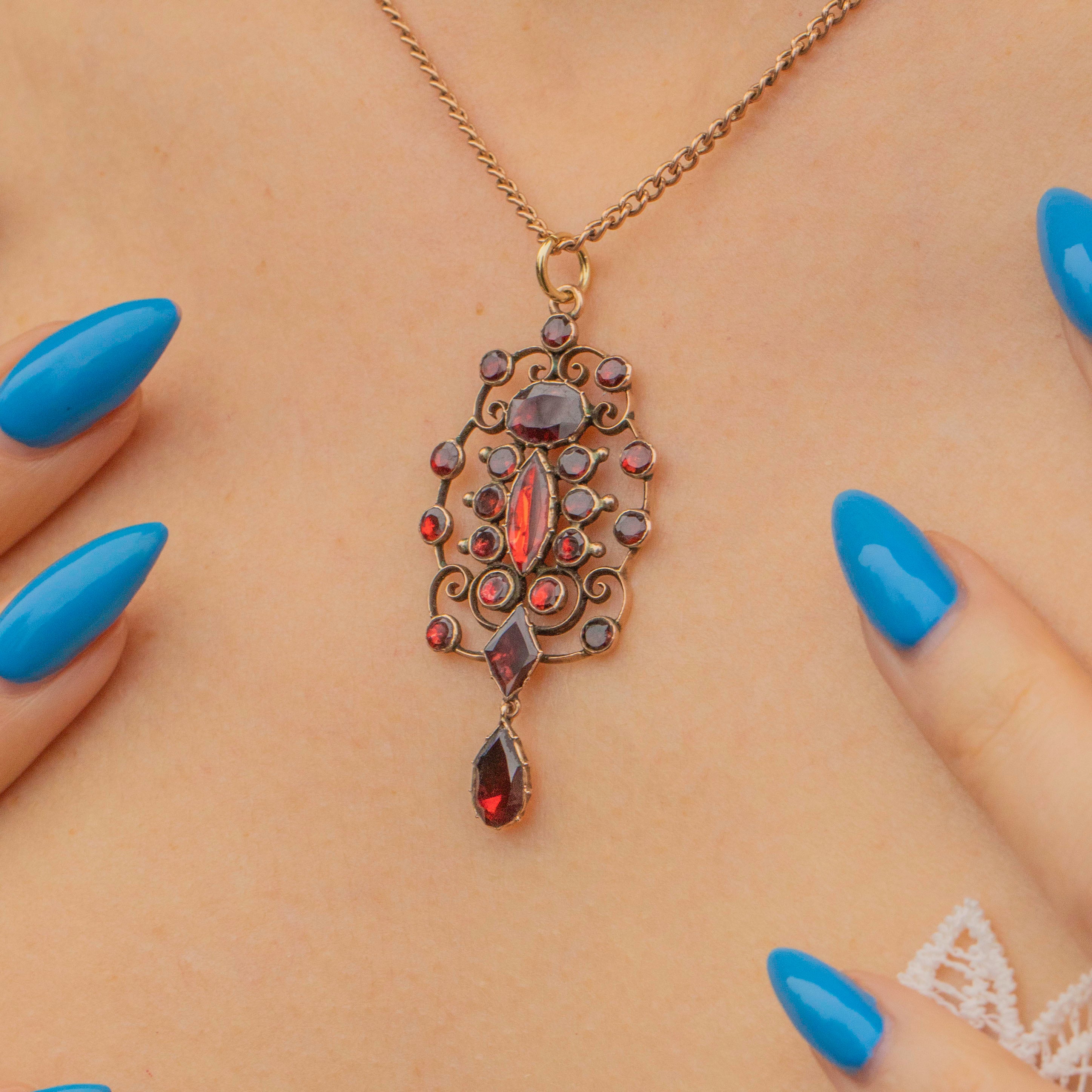 Add a touch of regal sophistication to your collection with this antique 9ct Gold flat-cut Garnet drop pendant!