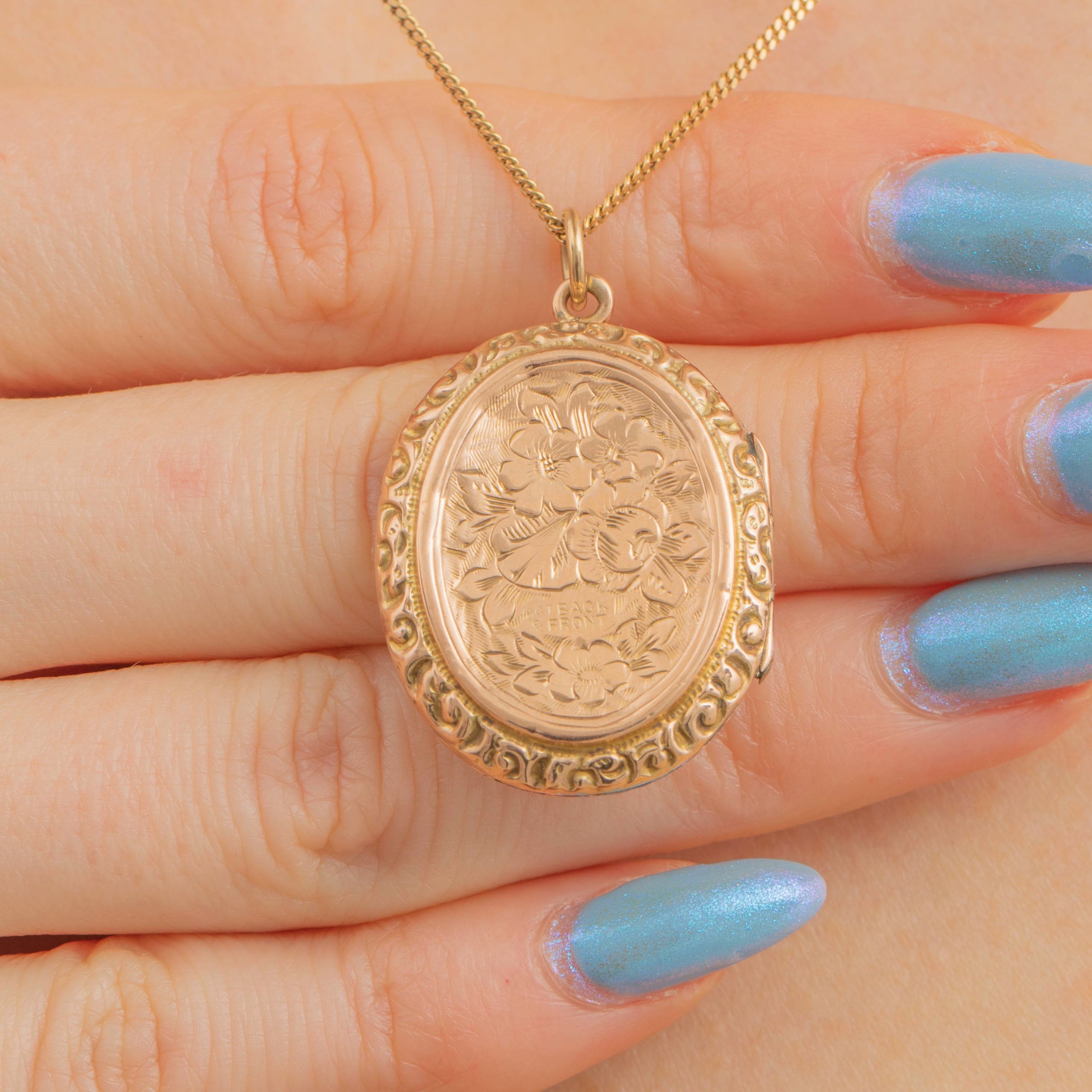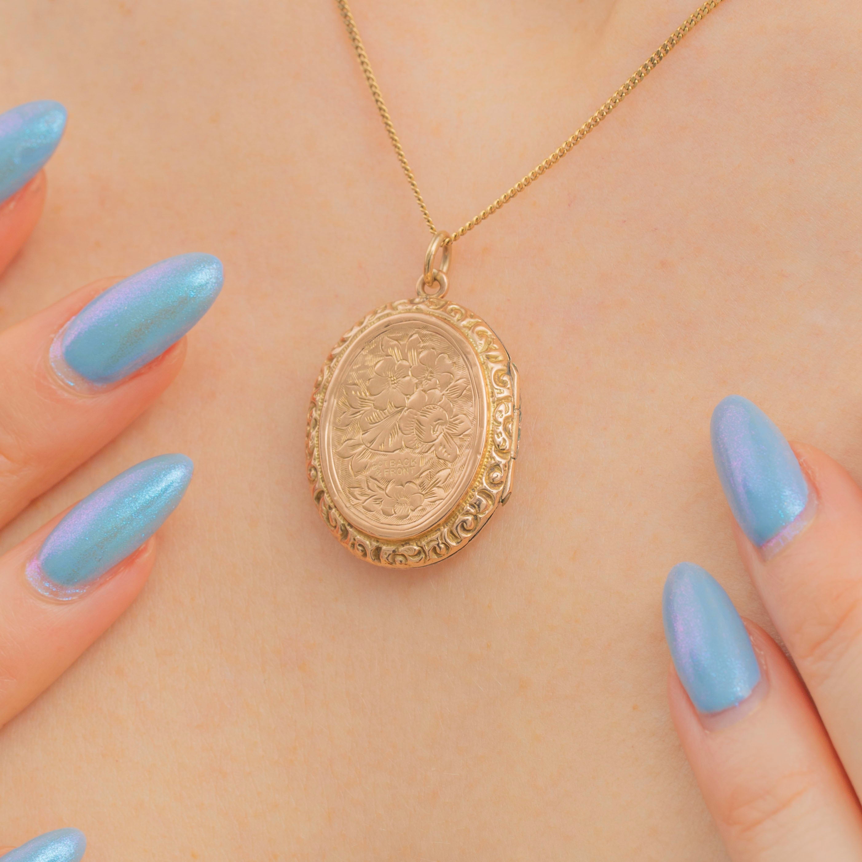 Antique 9ct Gold Forget-Me-Not Engraved Oval Locket