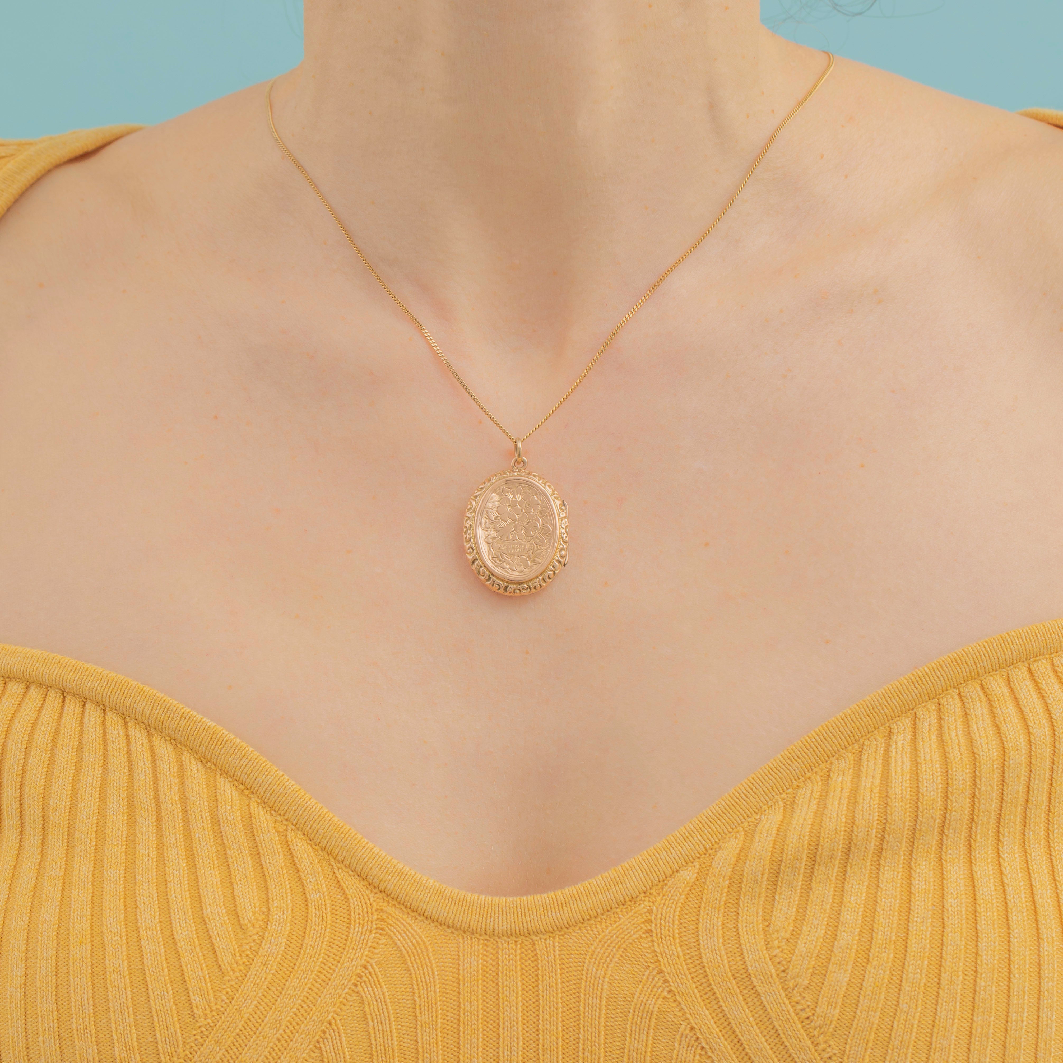 Bursting with romantic sentiment, this antique 9ct Gold forget-me-not engraved oval locket would make a lovely gift! Symbolising everlasting love, the finely engraved forget-me-nots span both sides of the locket with a blank cartouche on one side, to which you could add a personal engraving, framed by an embossed border for a decorative finish.