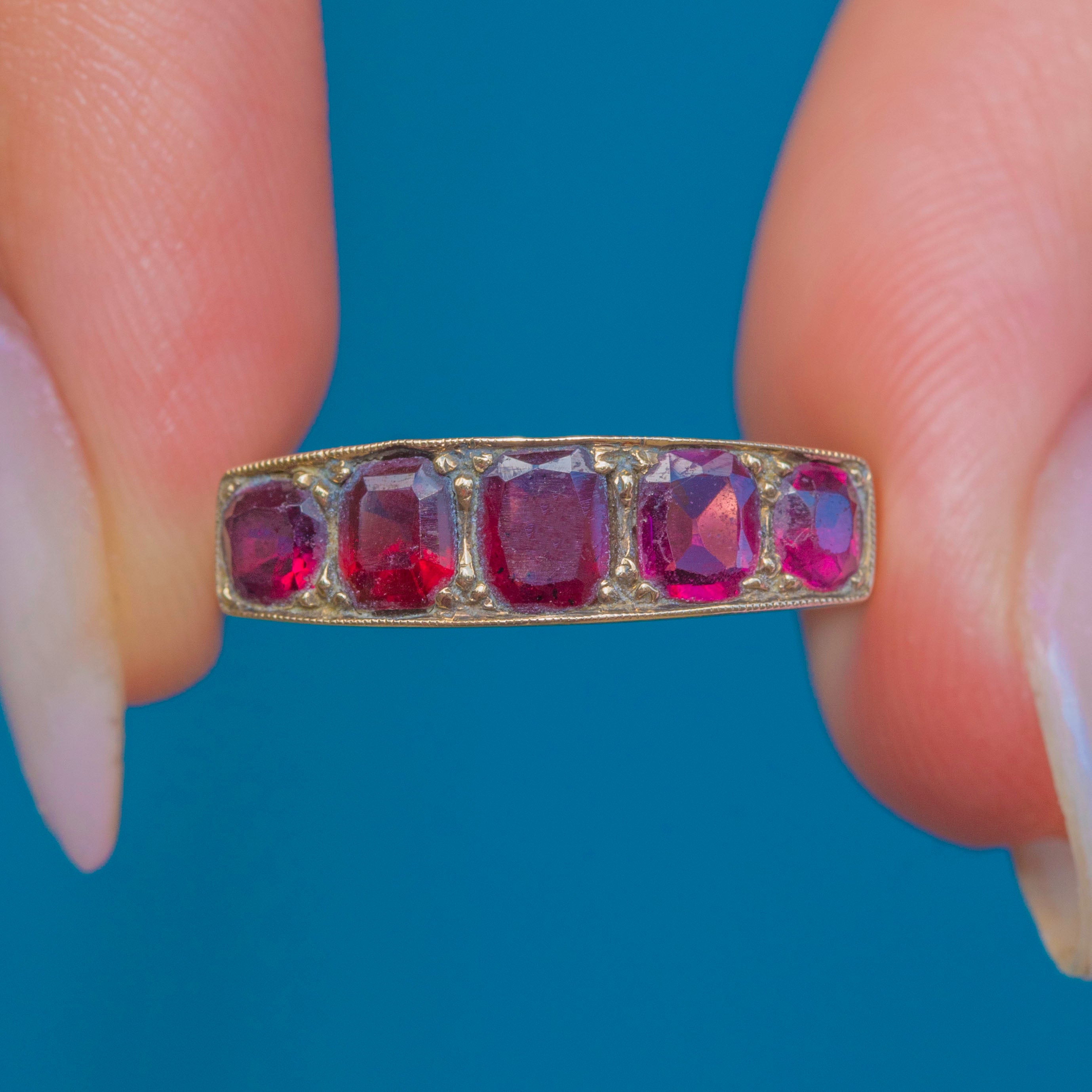 We love this Victorian five stone Garnet ring! Boasting 1.75 carats combined, the Garnets project a seductive crimson hue, set in a 9ct Gold panel that spreads the width of the finger, providing wonderful coverage.