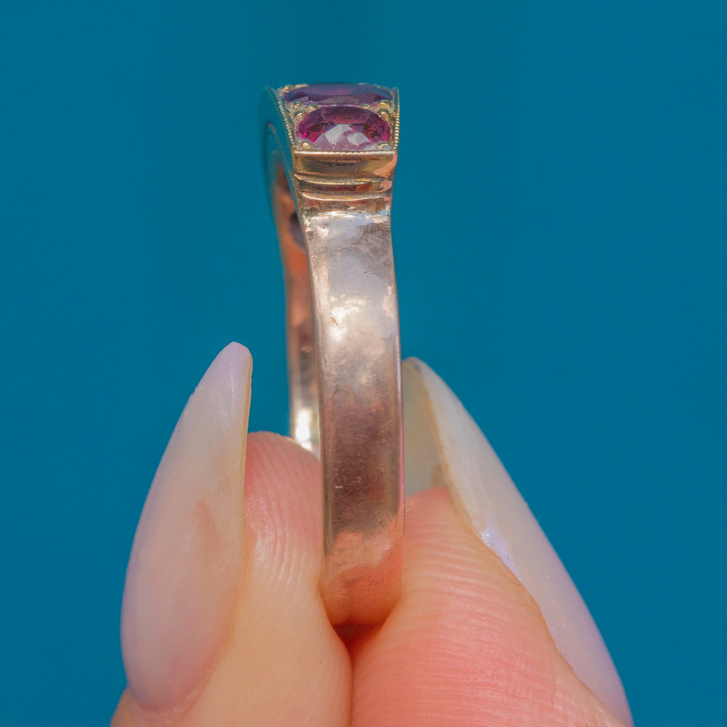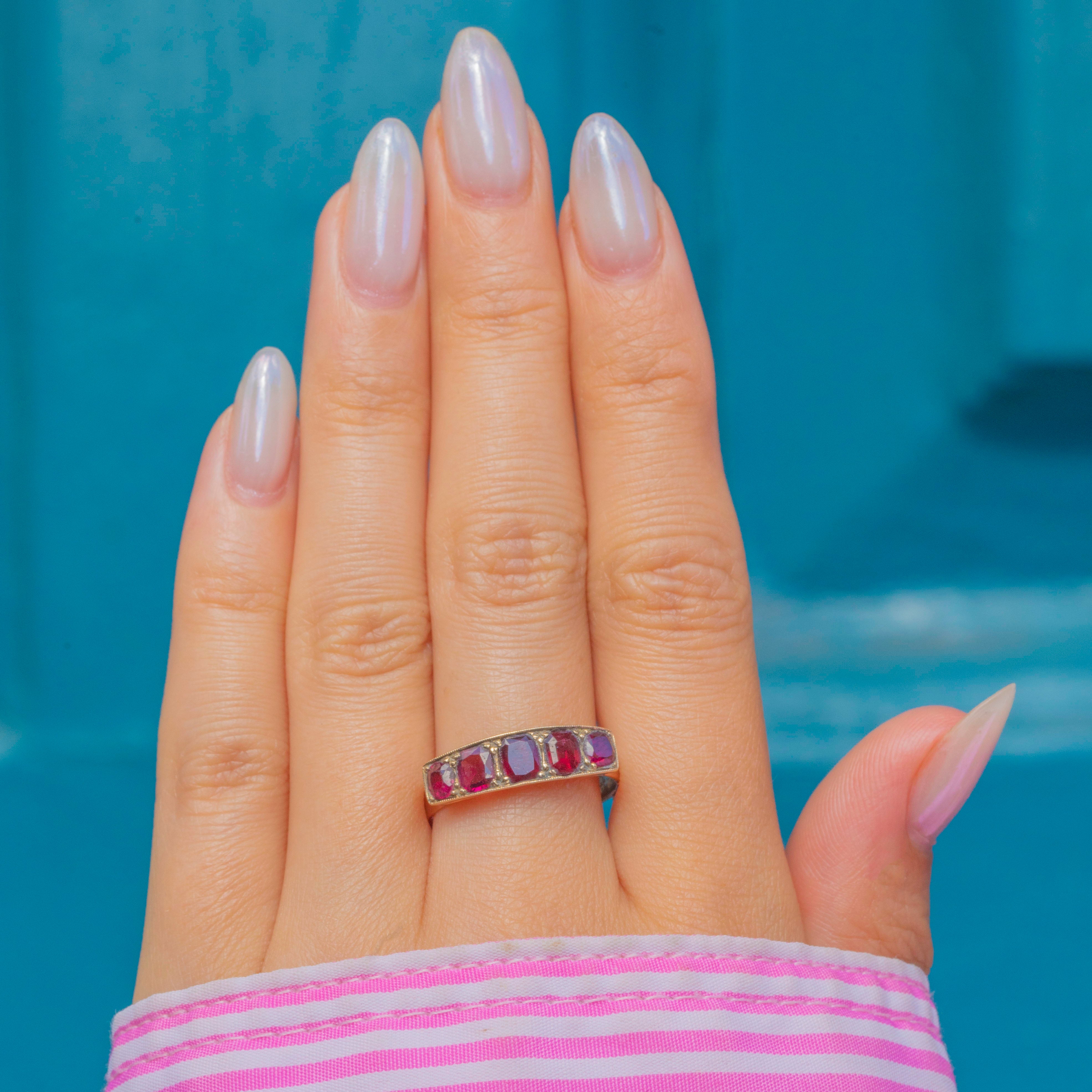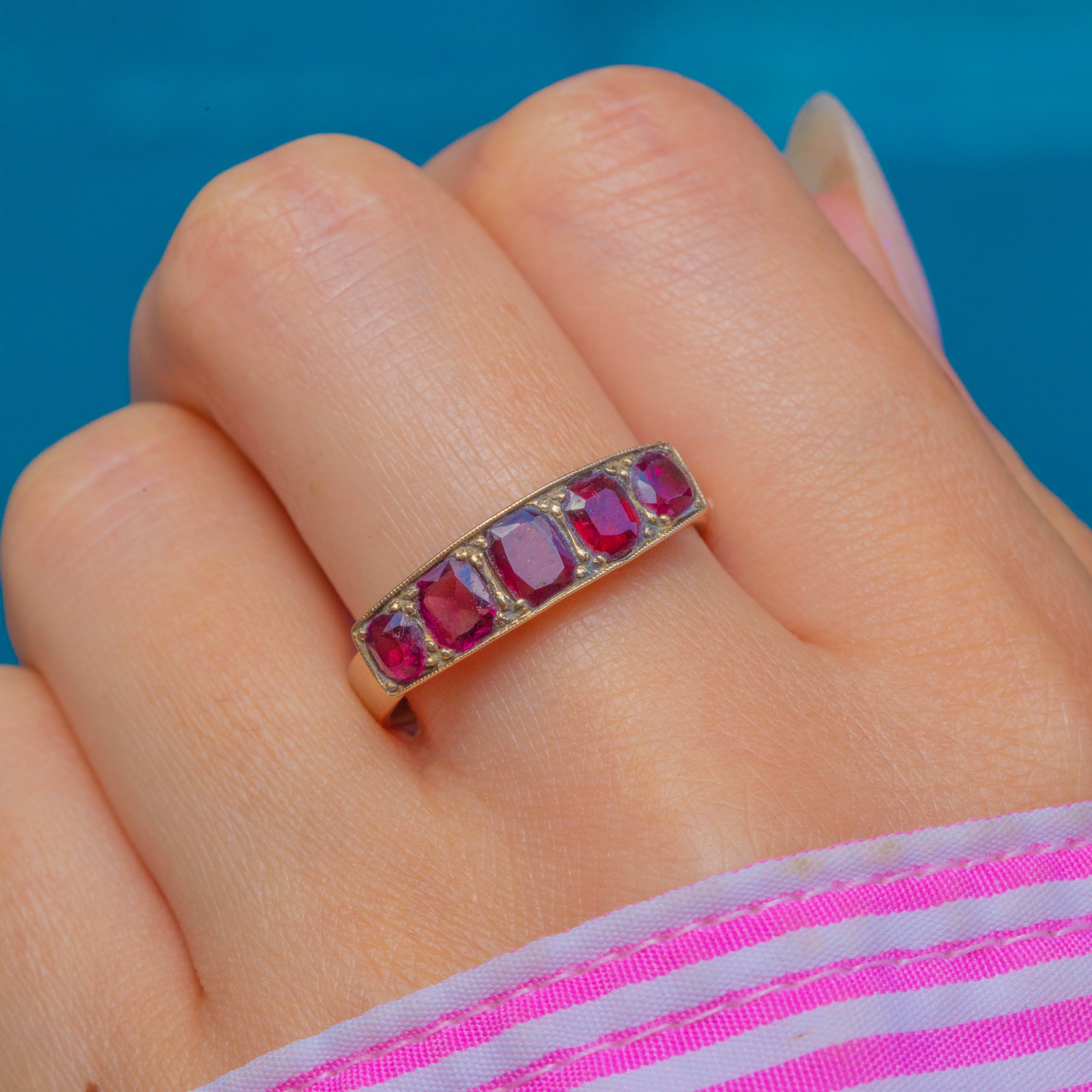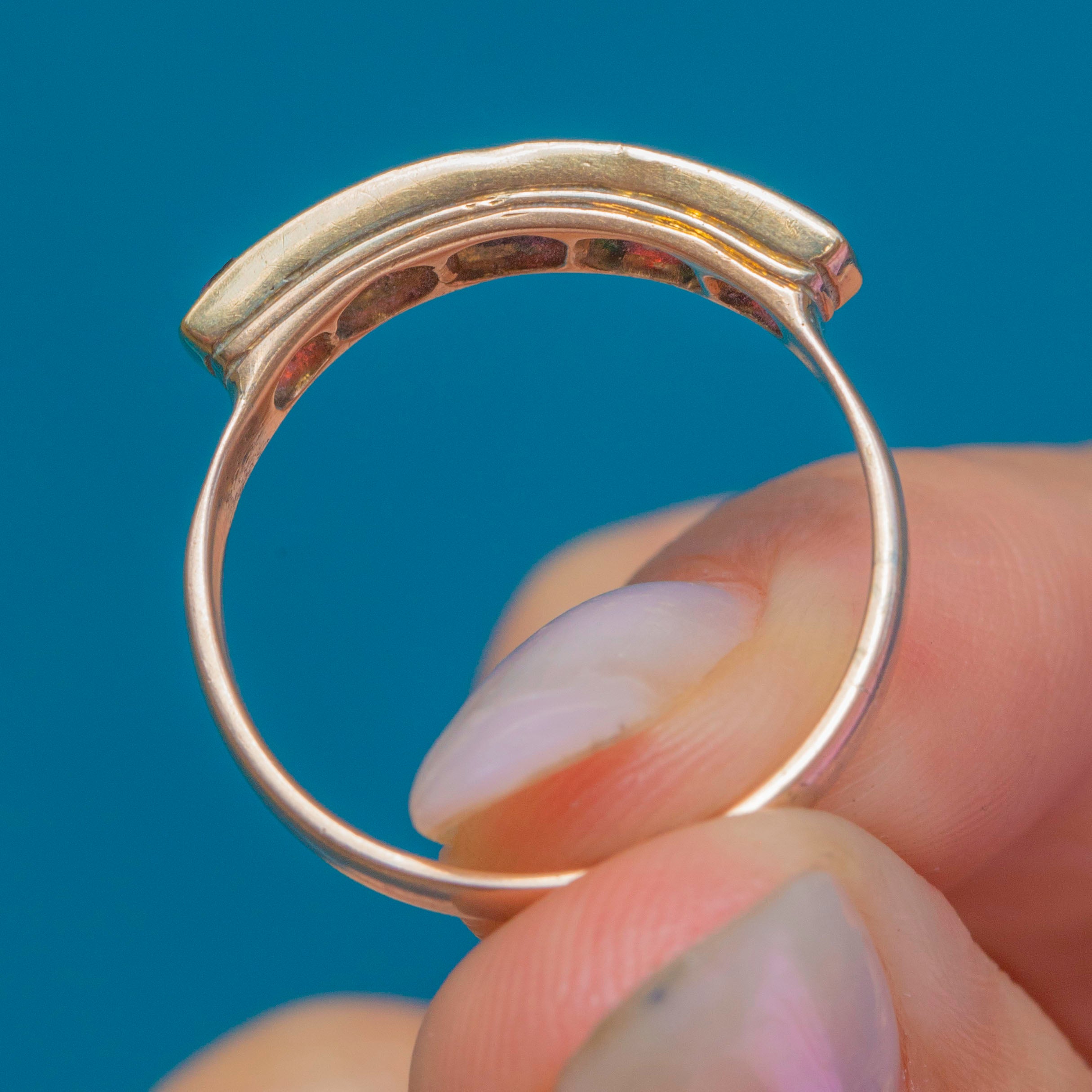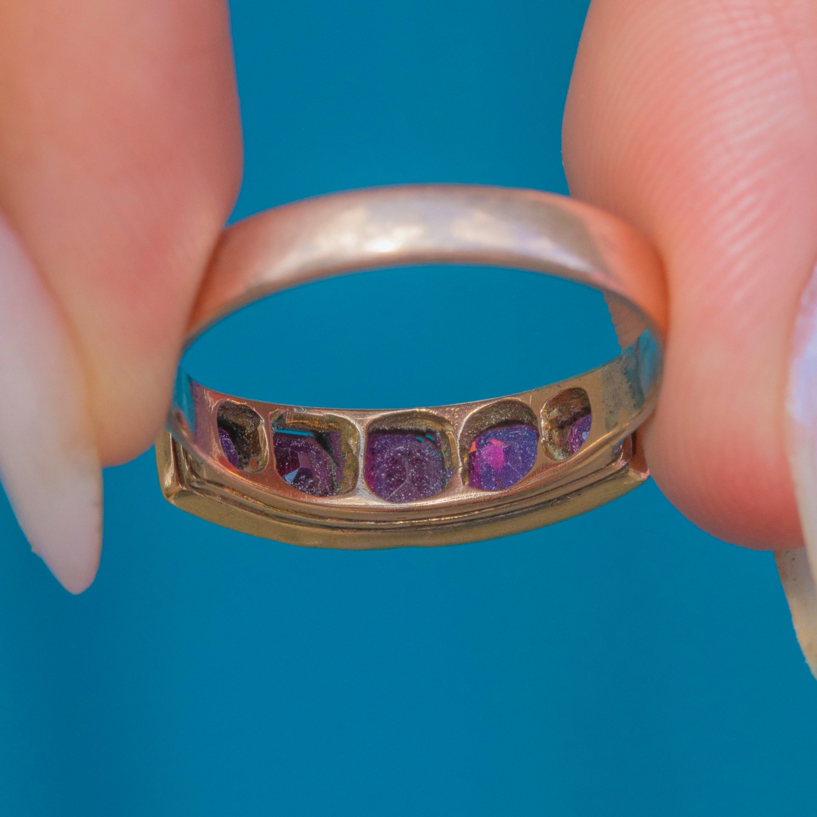 VERY GOOD: The Garnets are securely set, radiating deep berry hues, with only minimal surface marks noticeable under close inspection. There is some wear to the inside of the band from where it has once been resized, but this is not visible during wear. The Gold is buttery, and the band is smooth and feels comfortable to wear.