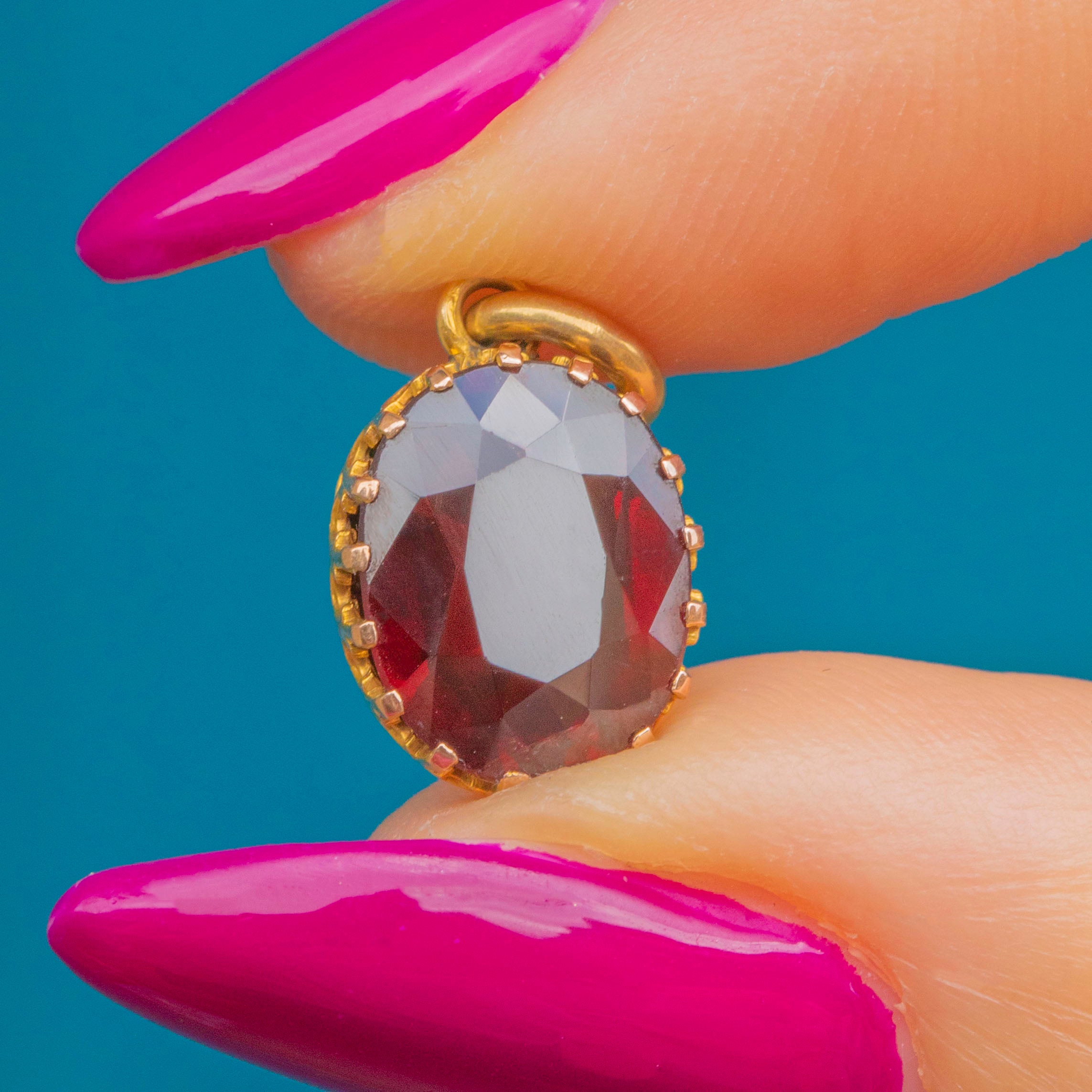 Crafted from warm 9ct Gold, this Victorian charm boasts a crisply faceted 1.75ct Garnet, shimmering with sangria red hues as it catches the light.