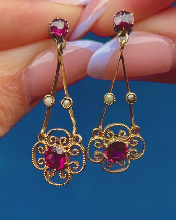 These stunning antique 9ct Gold Garnet Pearl floral drop earrings feature rich and bright berry-toned Garnets surrounded by delicate Seed Pearls in a charming floral cluster design. Edwardian era and crafted in 9ct Gold, their elegant drop style adds graceful movement and timeless appeal.
