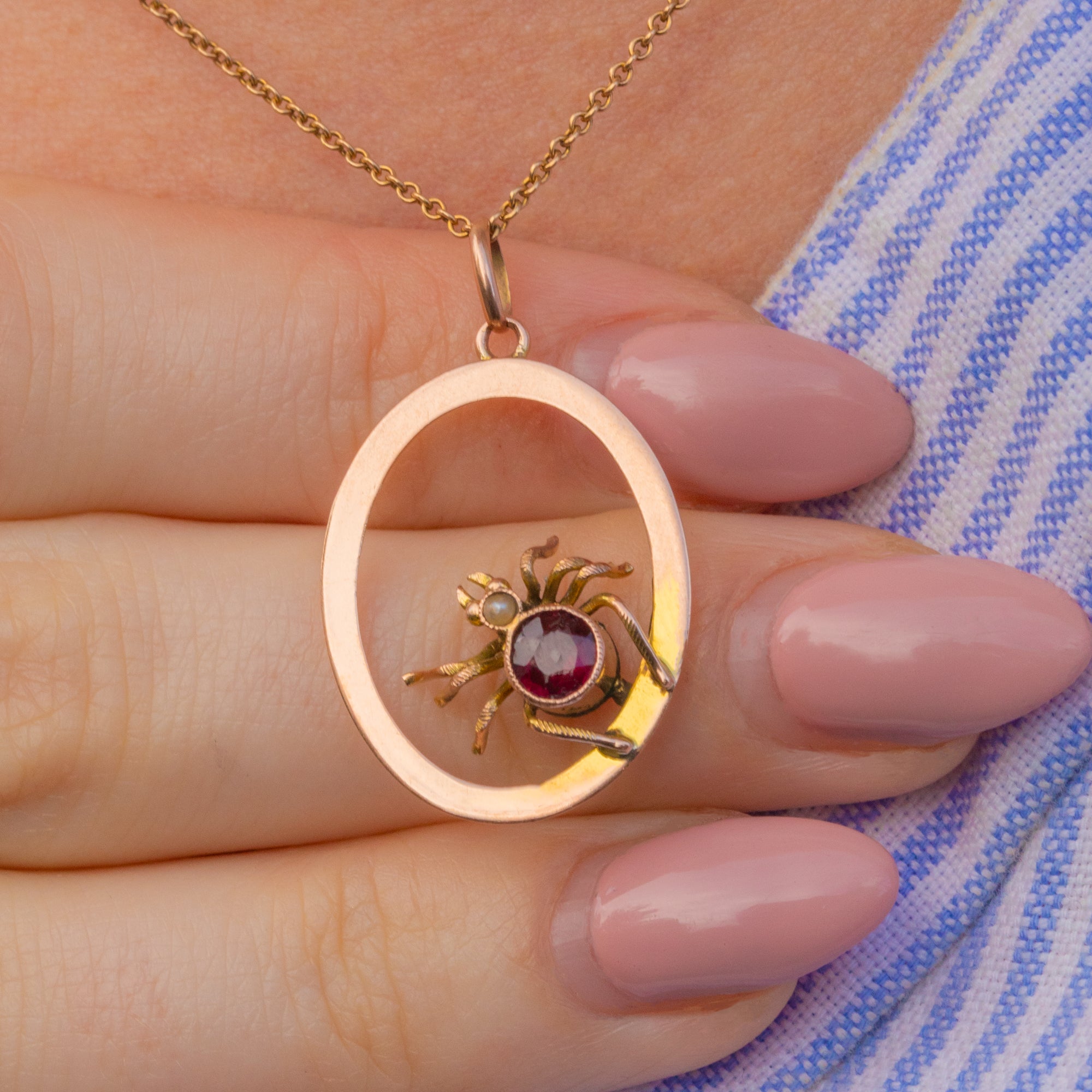 Exuding sangria red hues, her Garnet magically twinkles in the light. Such a wearable size, this Edwardian spider pendant will charm its way into becoming your new favourite piece. Who knew that spiders could look so desirable?!