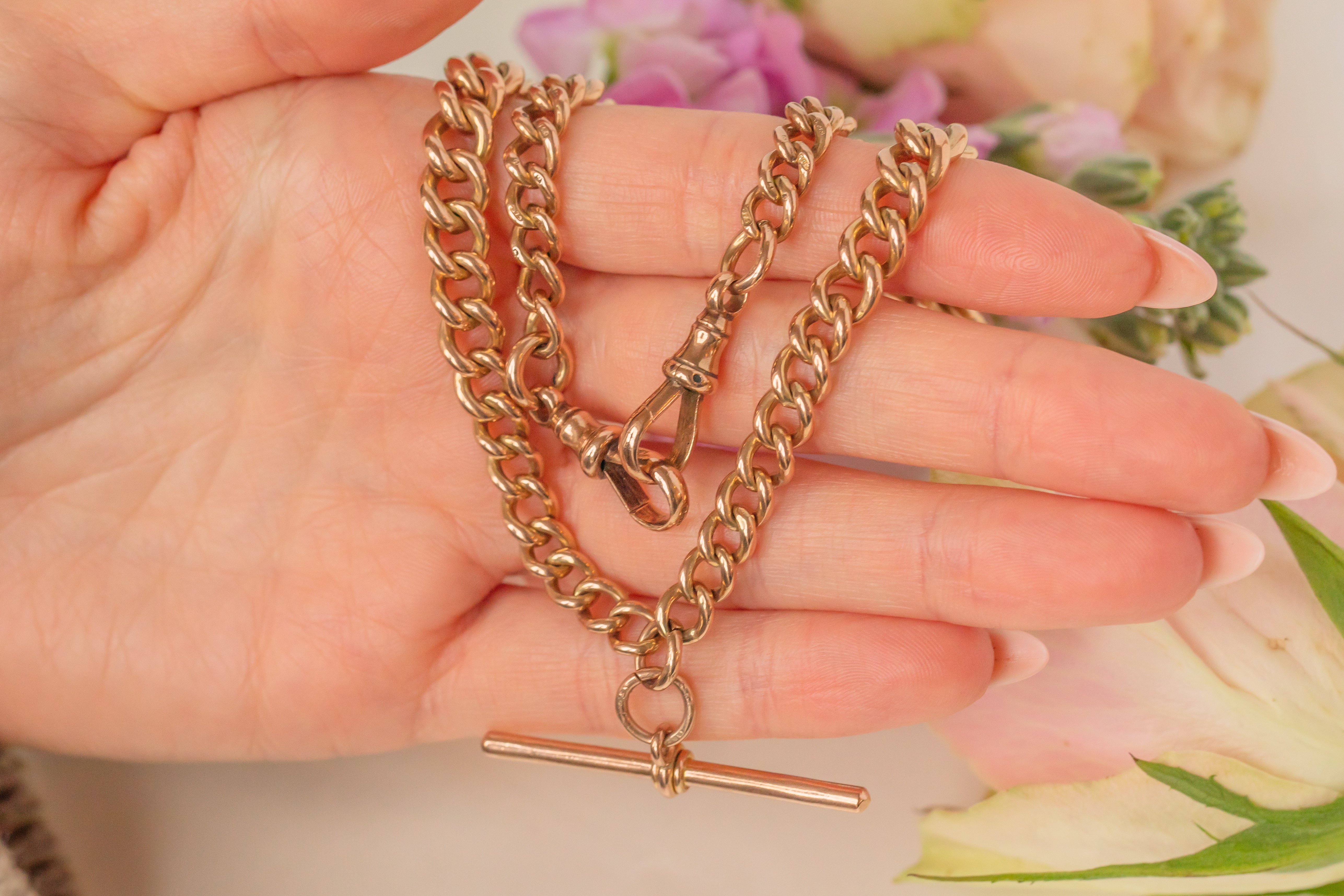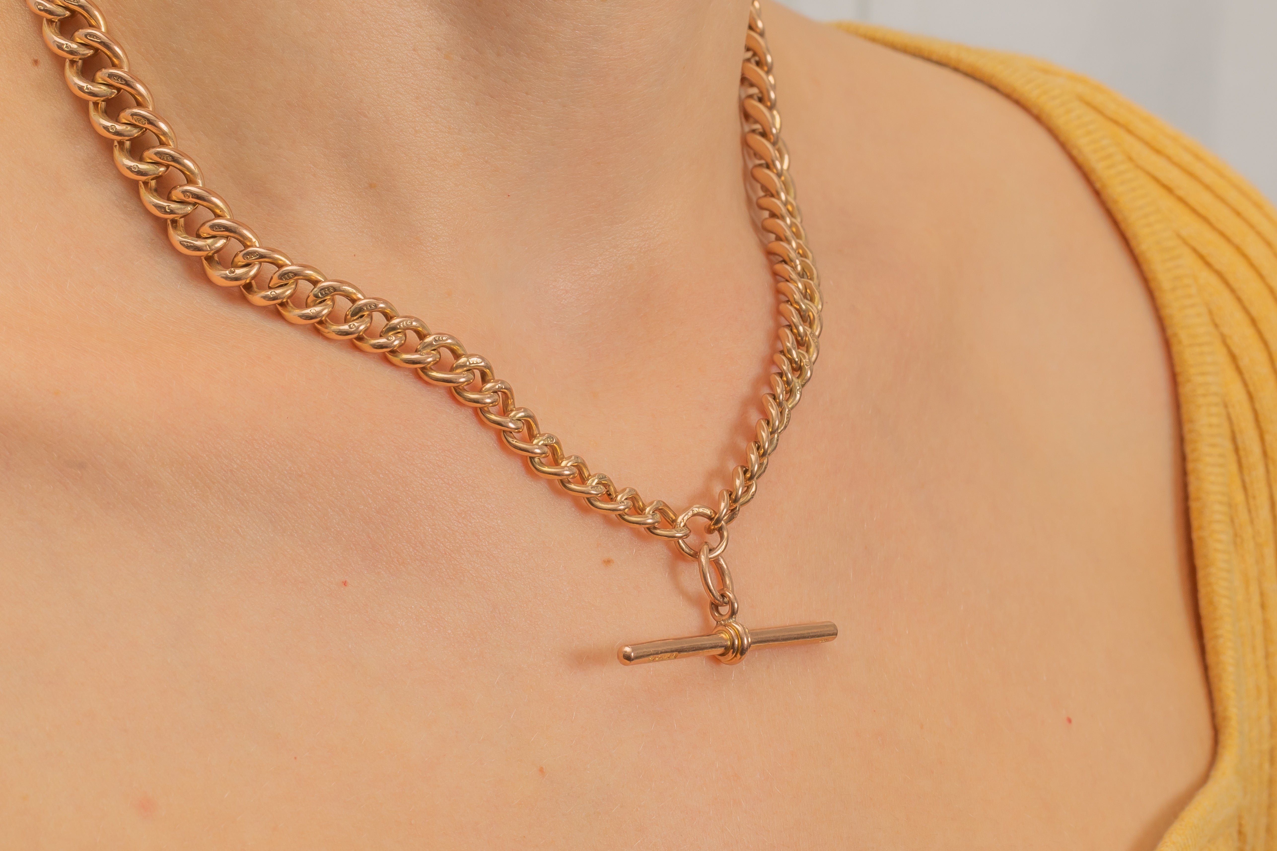 Nothing says statement like this antique 9ct Gold graduating Albert chain, featuring a solid Gold T-Bar. Composed of 52 grams of blushed 9ct Gold, her heartwarming tones radiate across your décolletage as her 16-inch length falls perfectly along your collarbones.