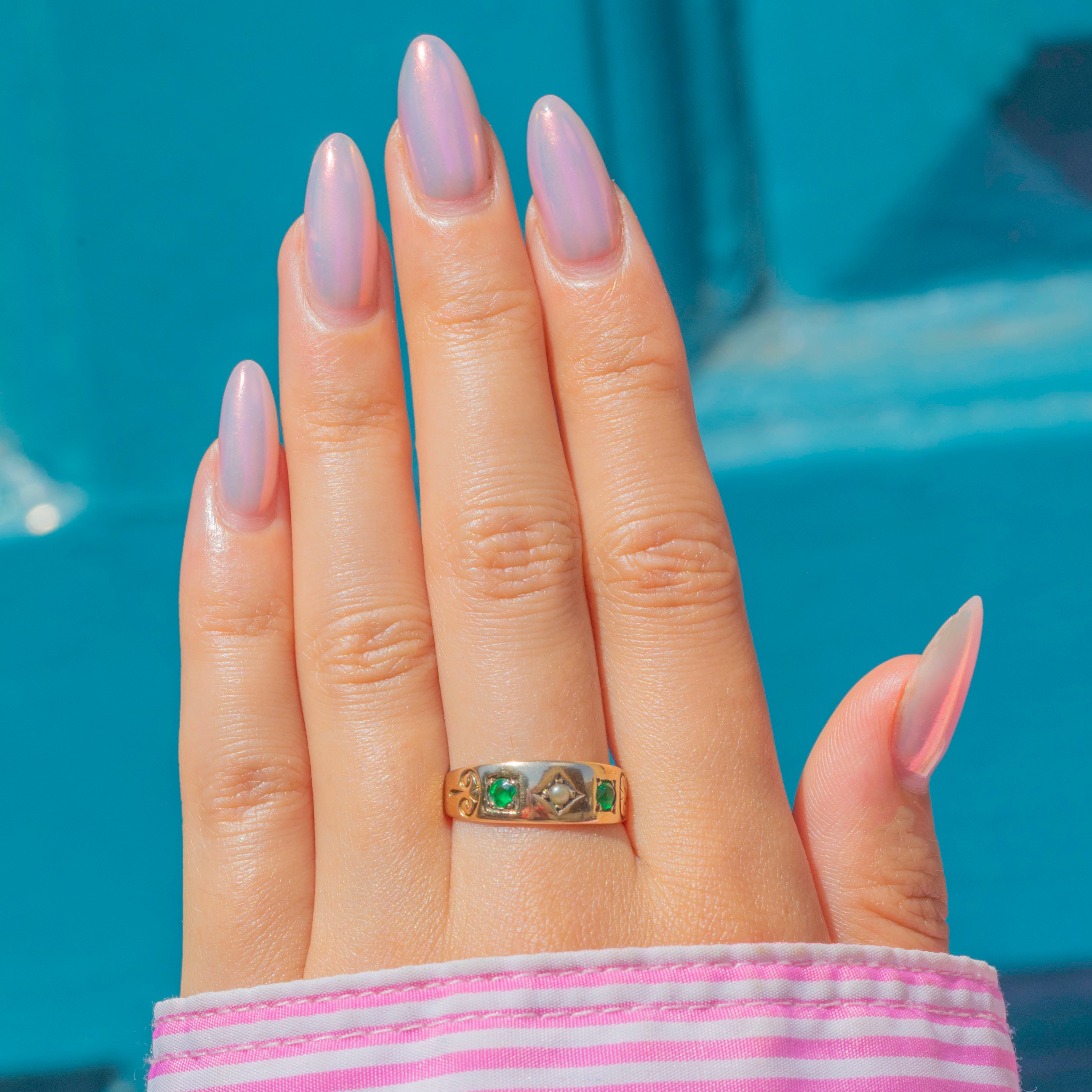 This gorgeous Victorian Gold gypsy ring, inlaid with a dainty Seed Pearl flanked by vibrant green Paste, will bring a fresh pop of colour to your curated ring stack!