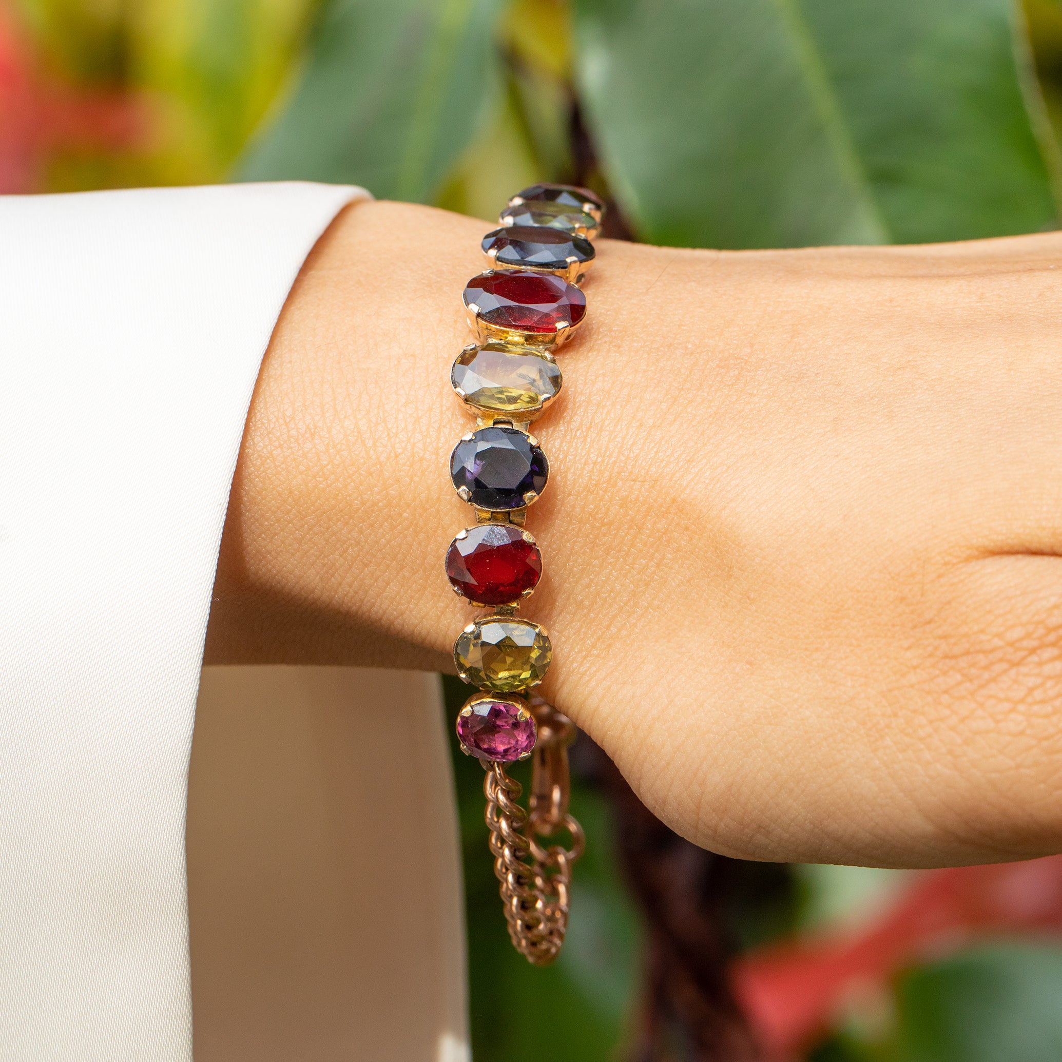 Each stone adorning this antique bracelet has been carefully selected for its unique beauty and rarity. From the antique golden Topaz shimmering with a warm, honey-like hue to the deep rich tones of Garnet and the tranquil blue of the Sapphire, each gemstone adds depth and character to the piece.