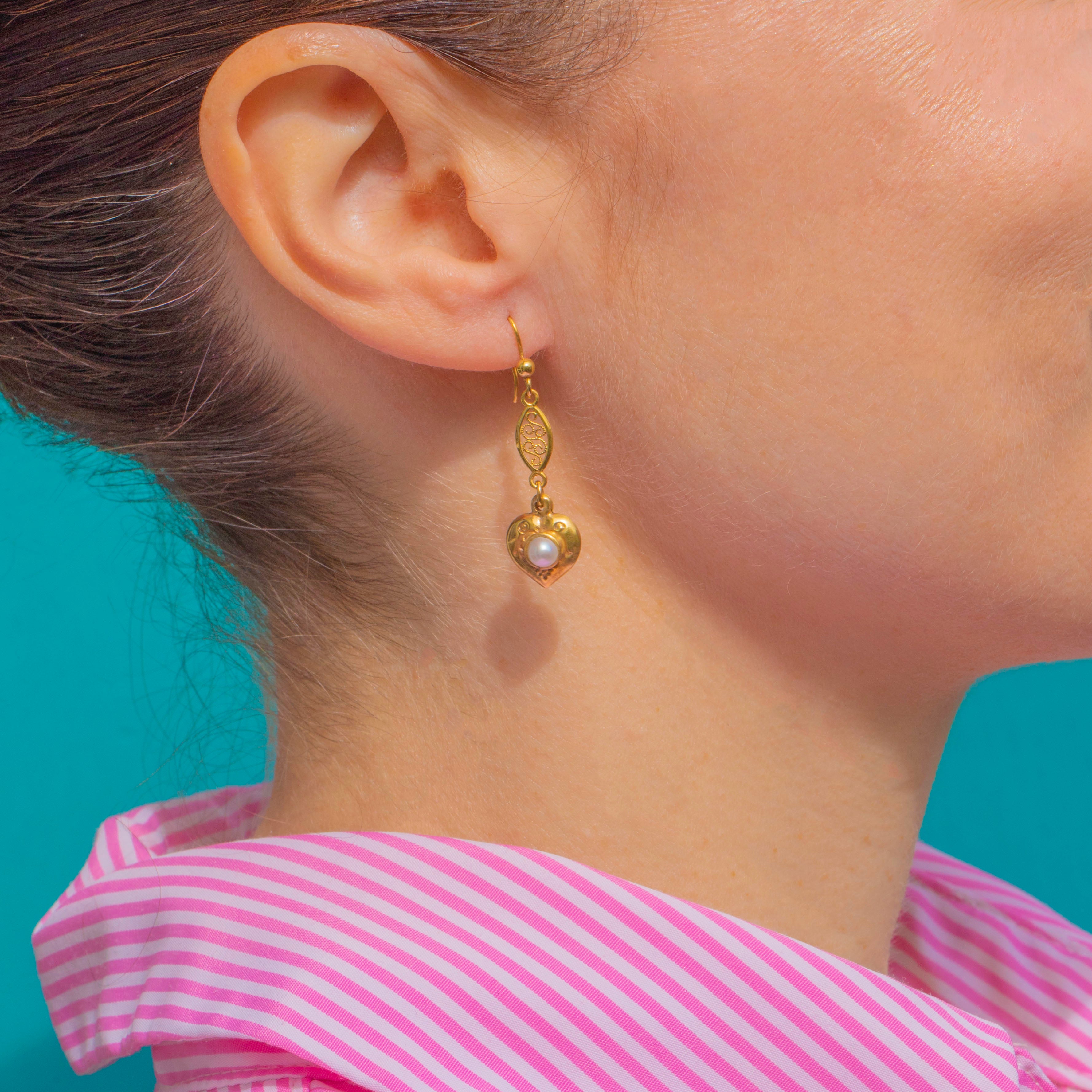 Romantic and refined, these antique Victorian drop earrings are crafted in warm 9ct Gold with heart-shaped pendants crowned by delicate navette filigree links. Each heart is beautifully ornamented with scrolling foliate detail and fine beading, centred by a luminous Pearl that glows softly against the Gold.