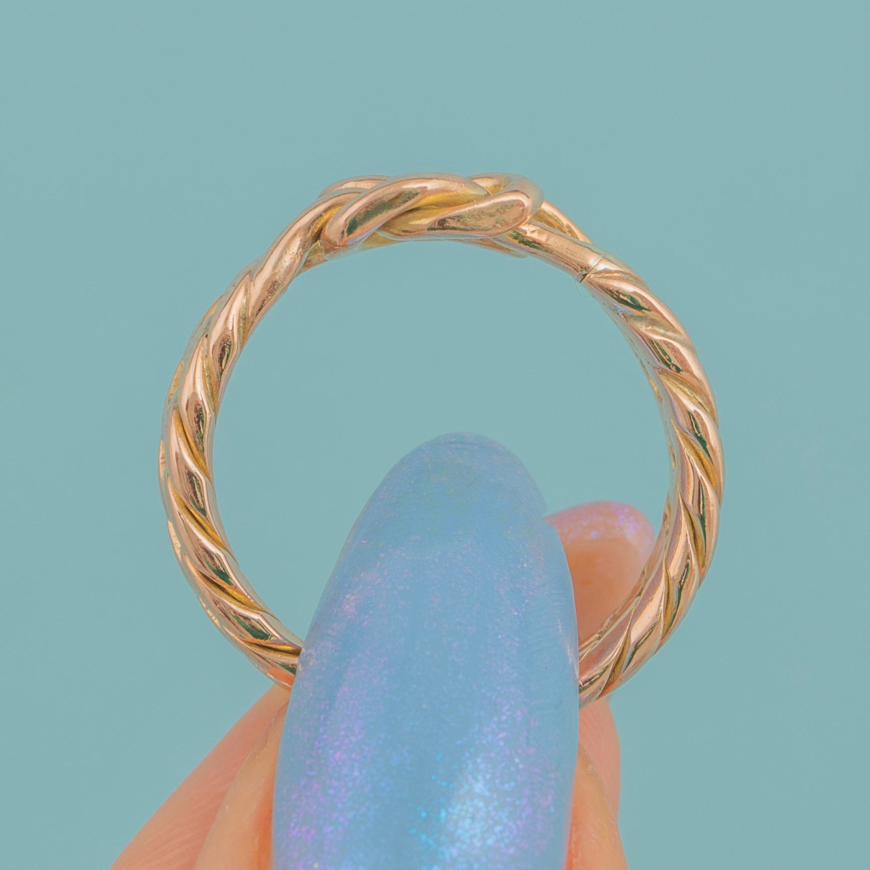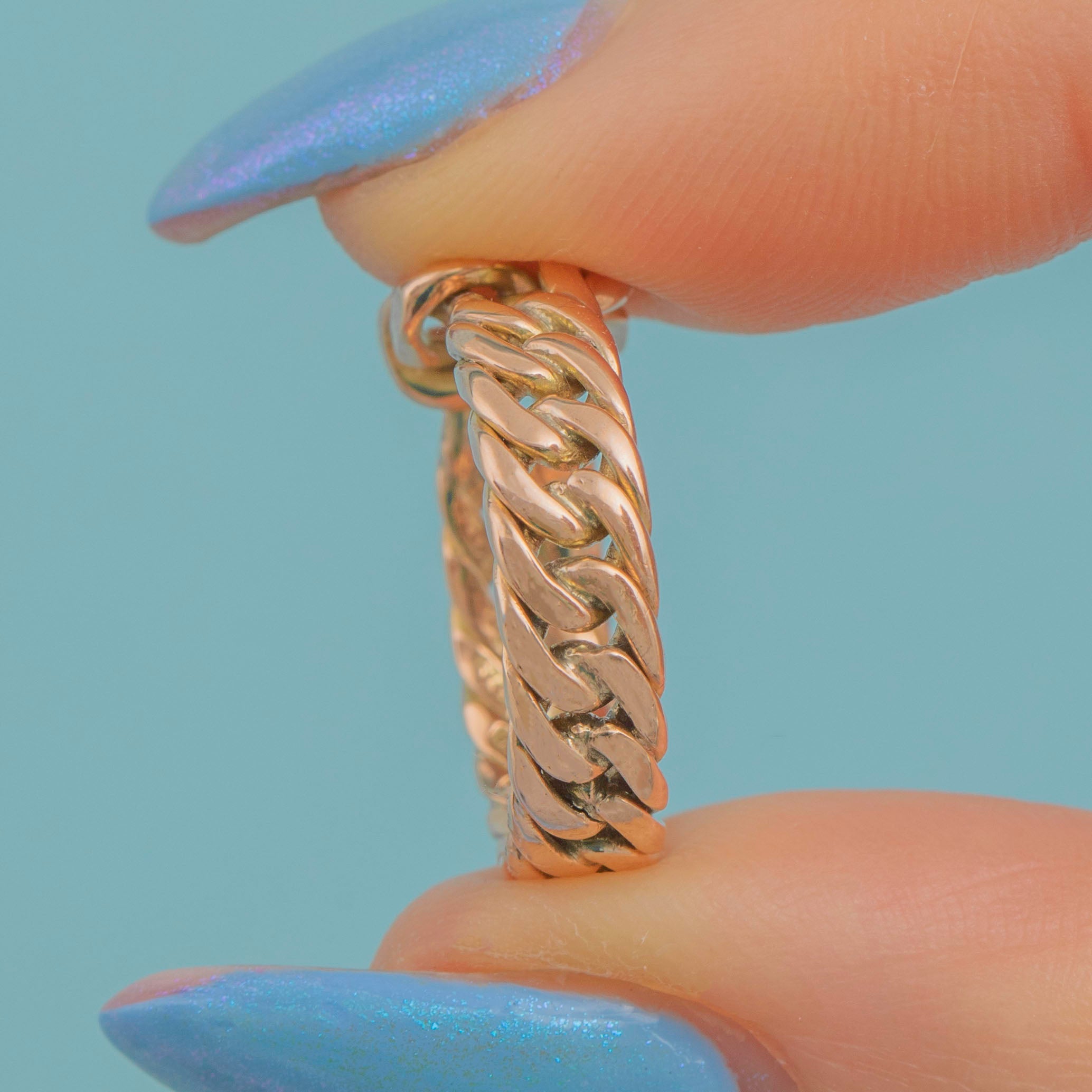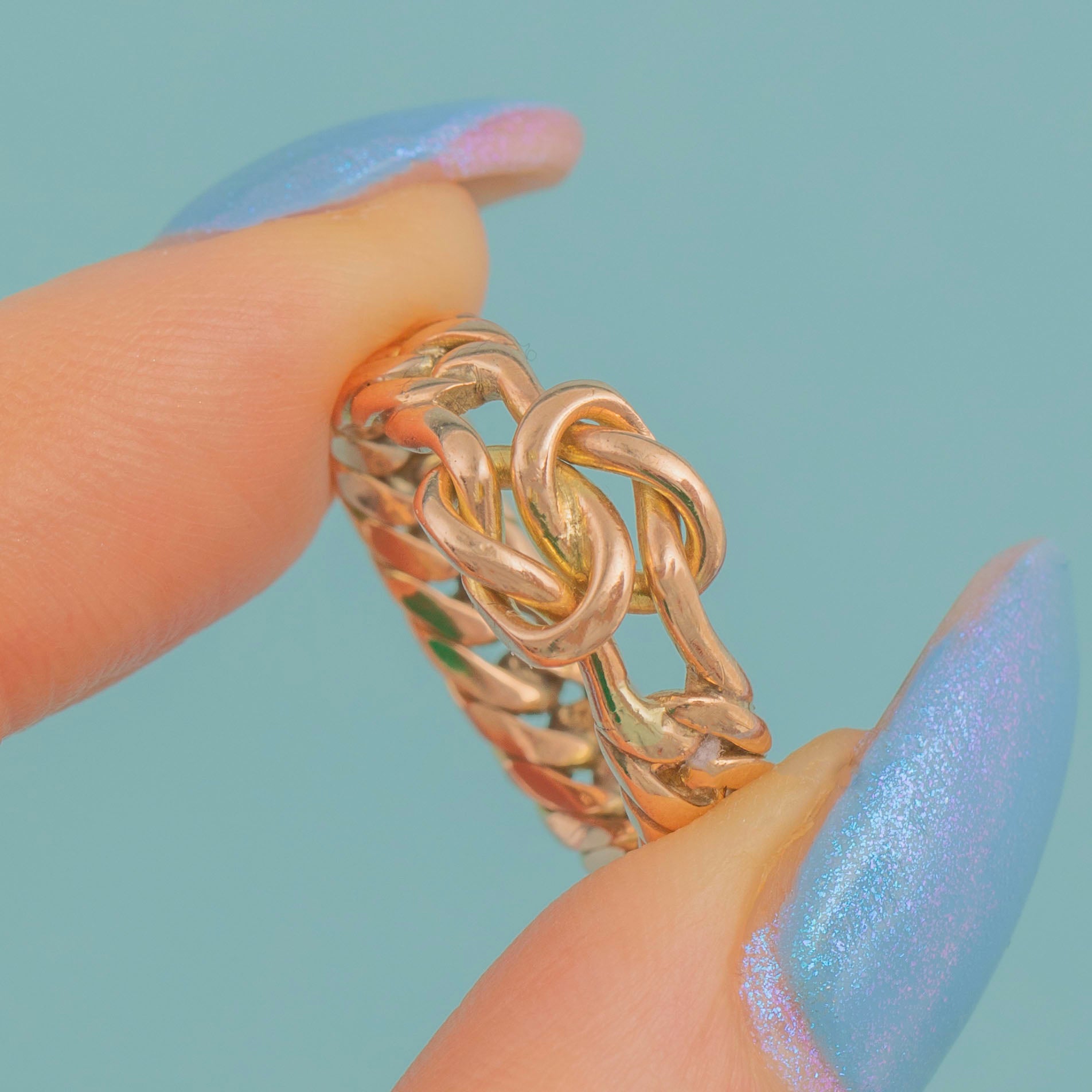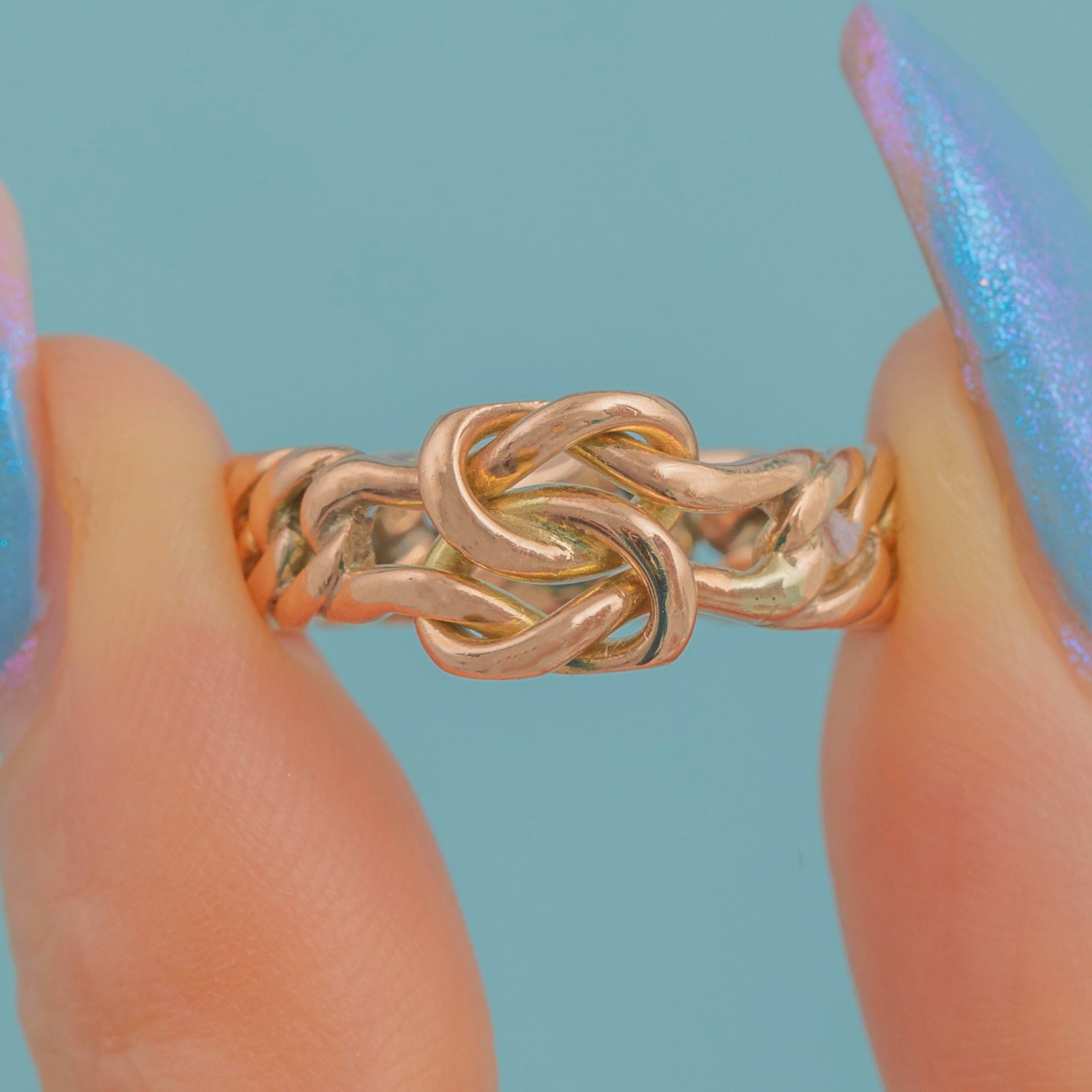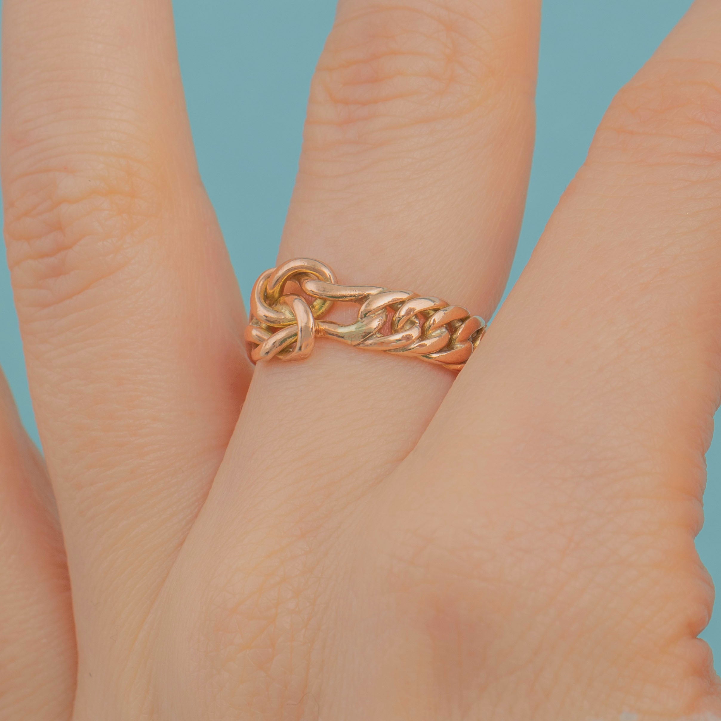 Crafted from rosy 9ct Gold, this Victorian ring is features a lover's knot in her centre, with a gorgeous woven curb link ring band to finish, providing texture and depth.