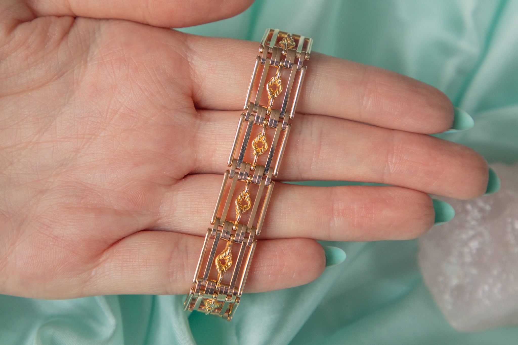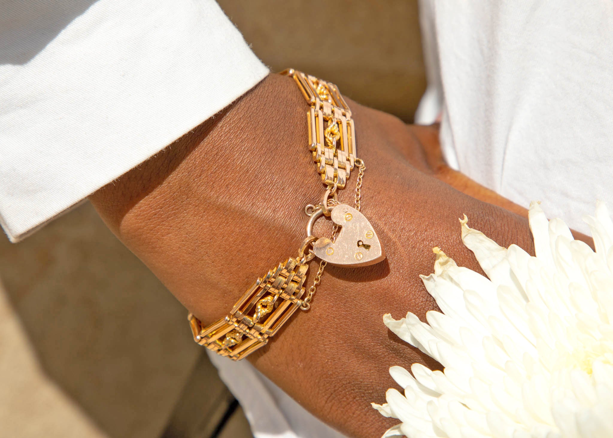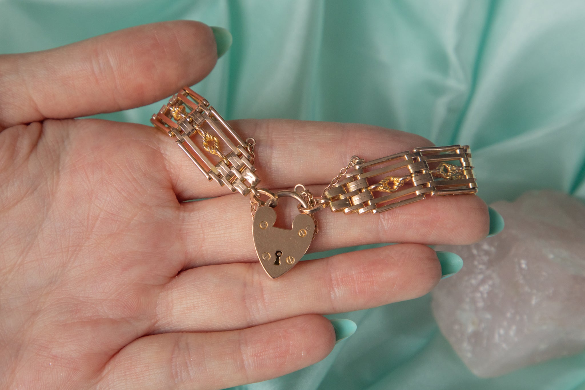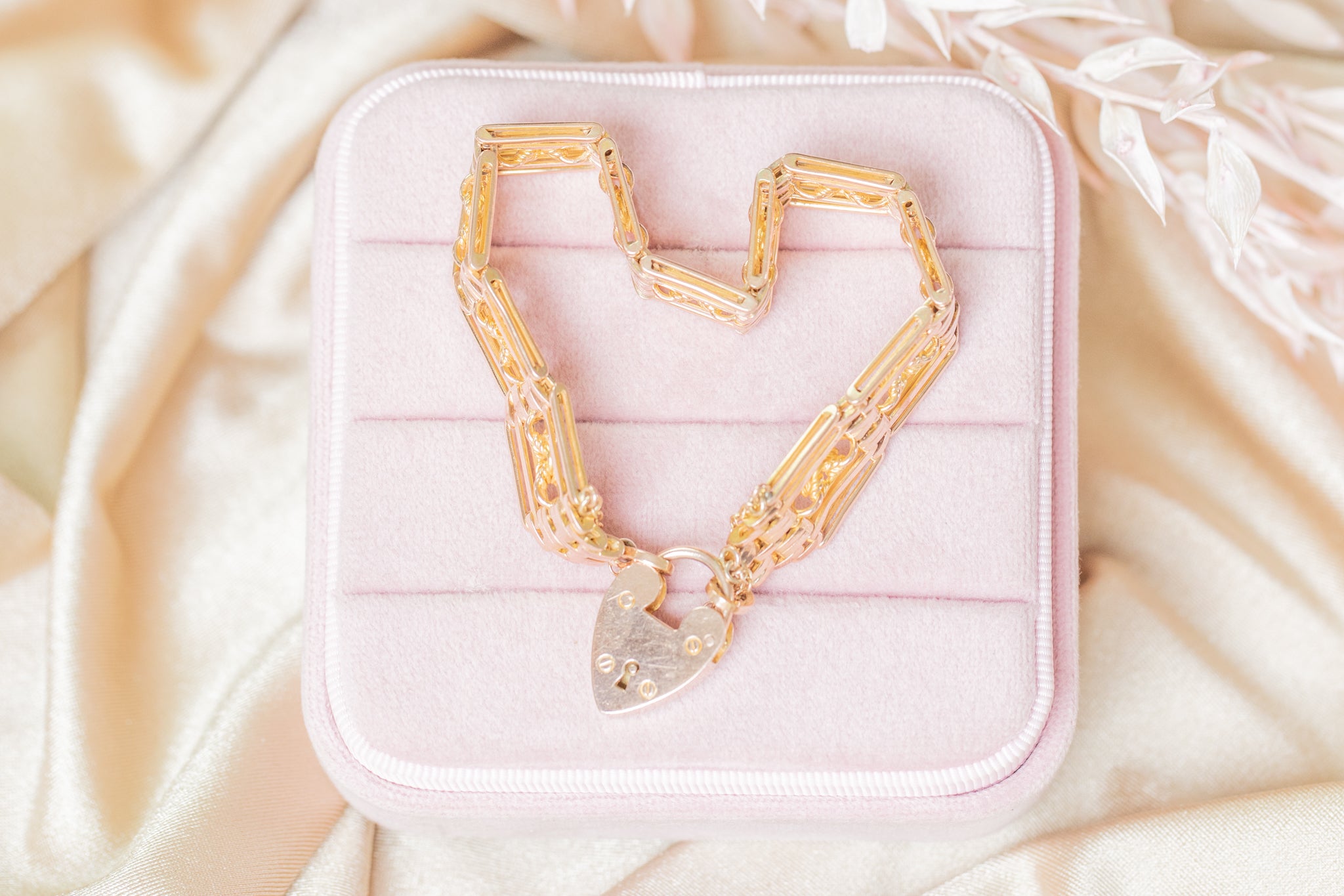A splendid antique 9ct Gold lover's knot gate bracelet, complete with an adorable heart padlock charm. From her intricate lover's knot details to her sturdy gate links, she flaunts a subtle rosé hue which will marry perfectly with all your favourite clothes!