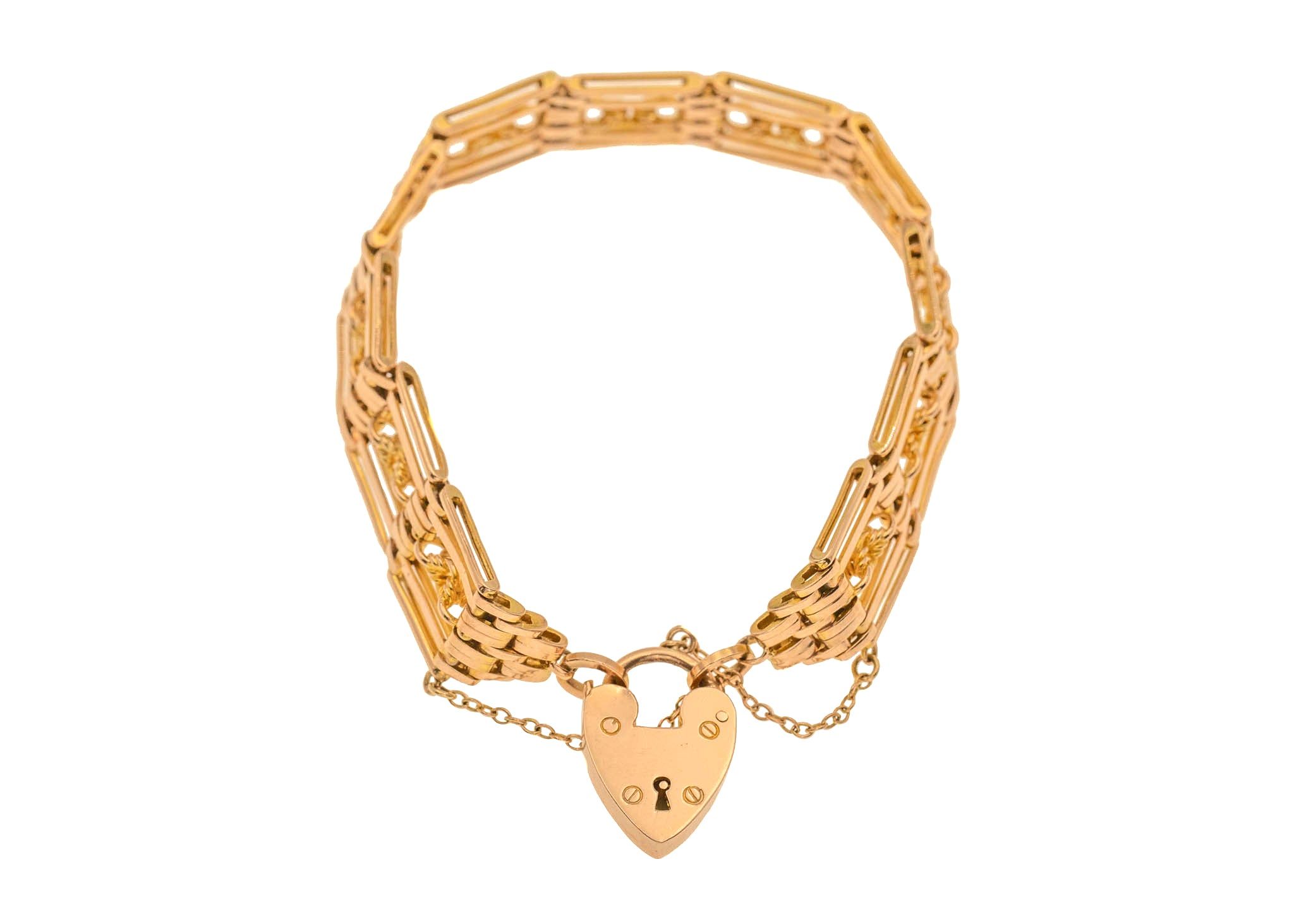 7" Antique 9ct Gold Lover's Knot Gate Bracelet with Heart Padlock, 26.4g
