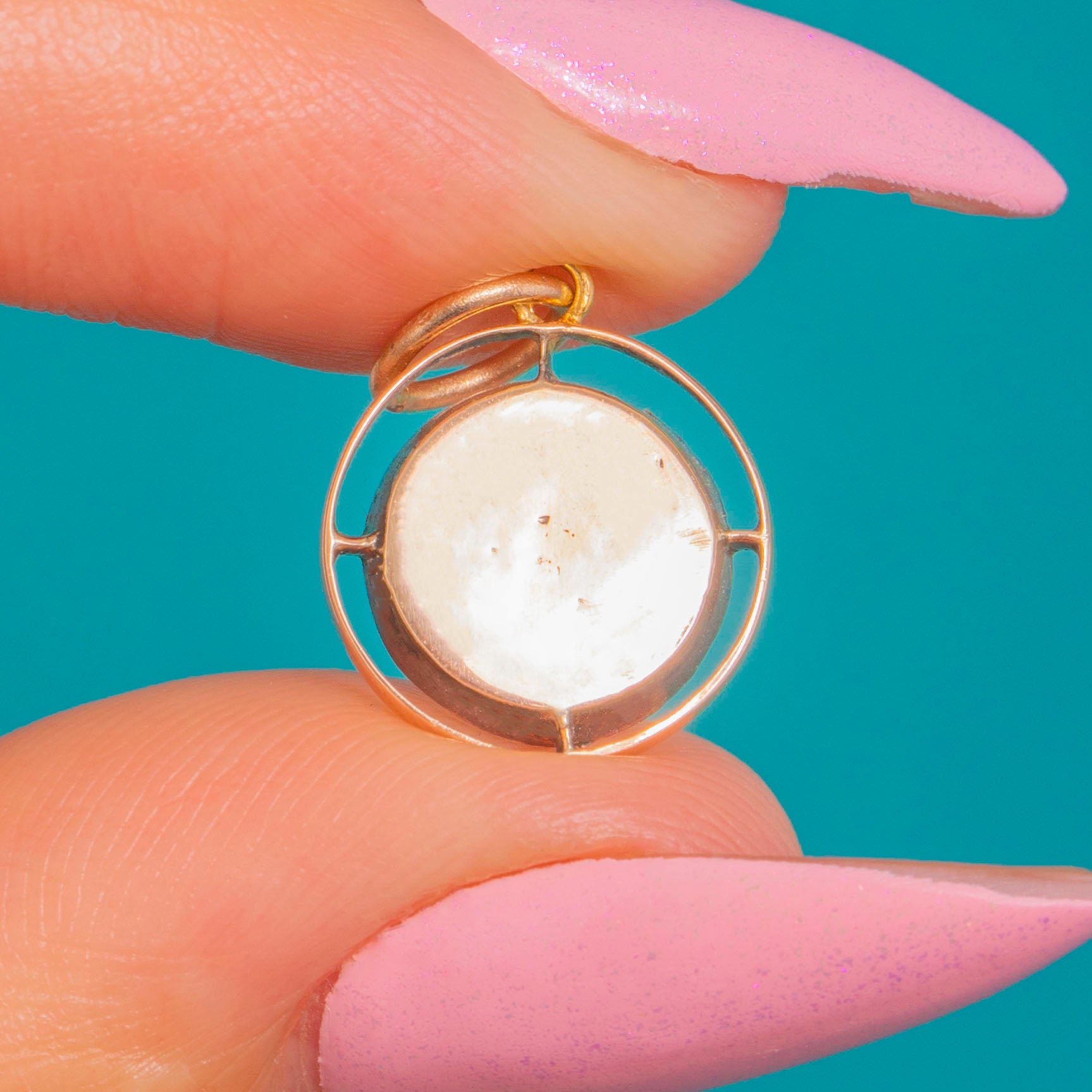 A delicate Victorian Moonstone charm with an ethereal glow. The high-domed Moonstone sits in a fine 9ct Gold collet, cradled within an airy openwork halo defined by four cardinal spokes. Subtle, sculptural and beautifully poised, it’s a refined whisper of light against the skin.