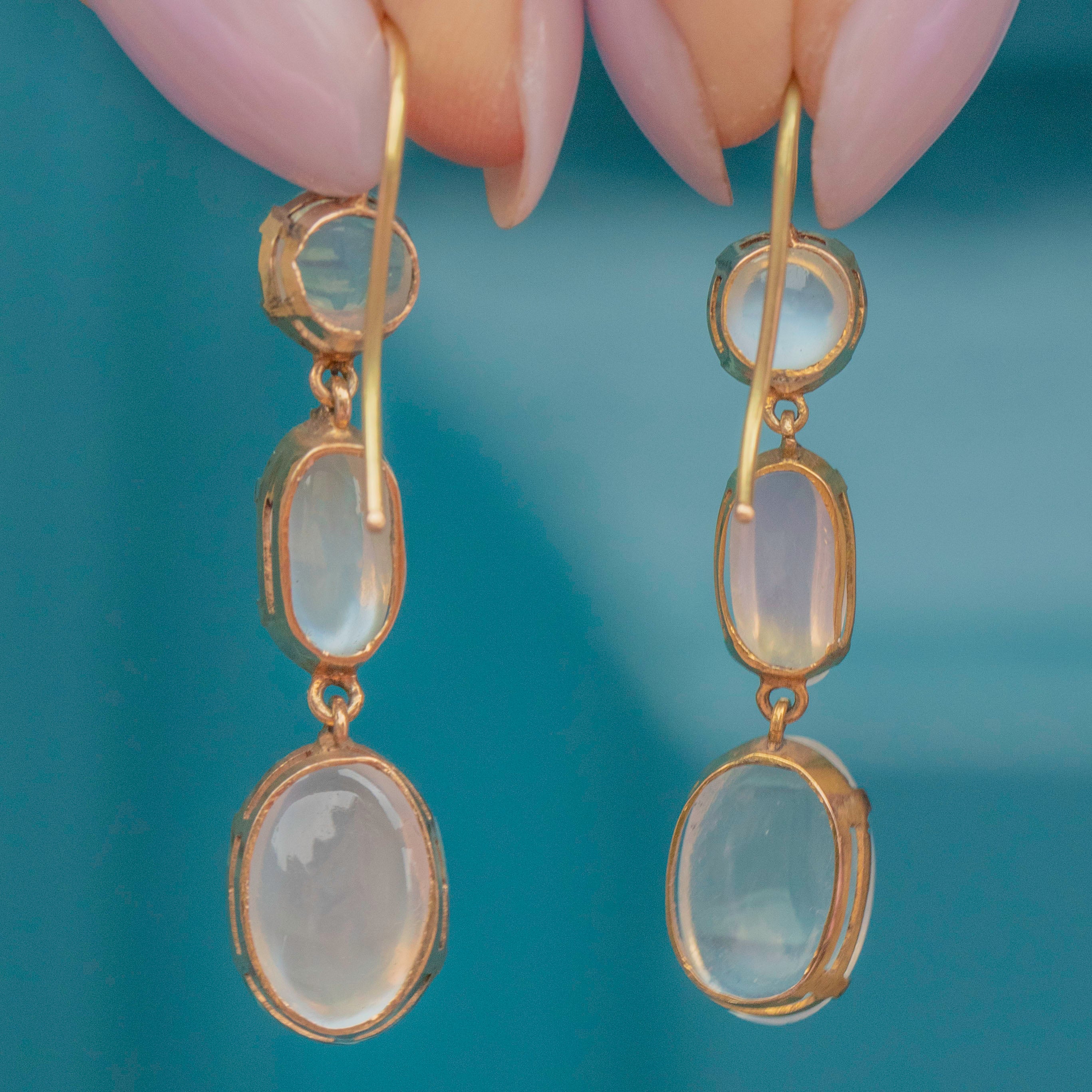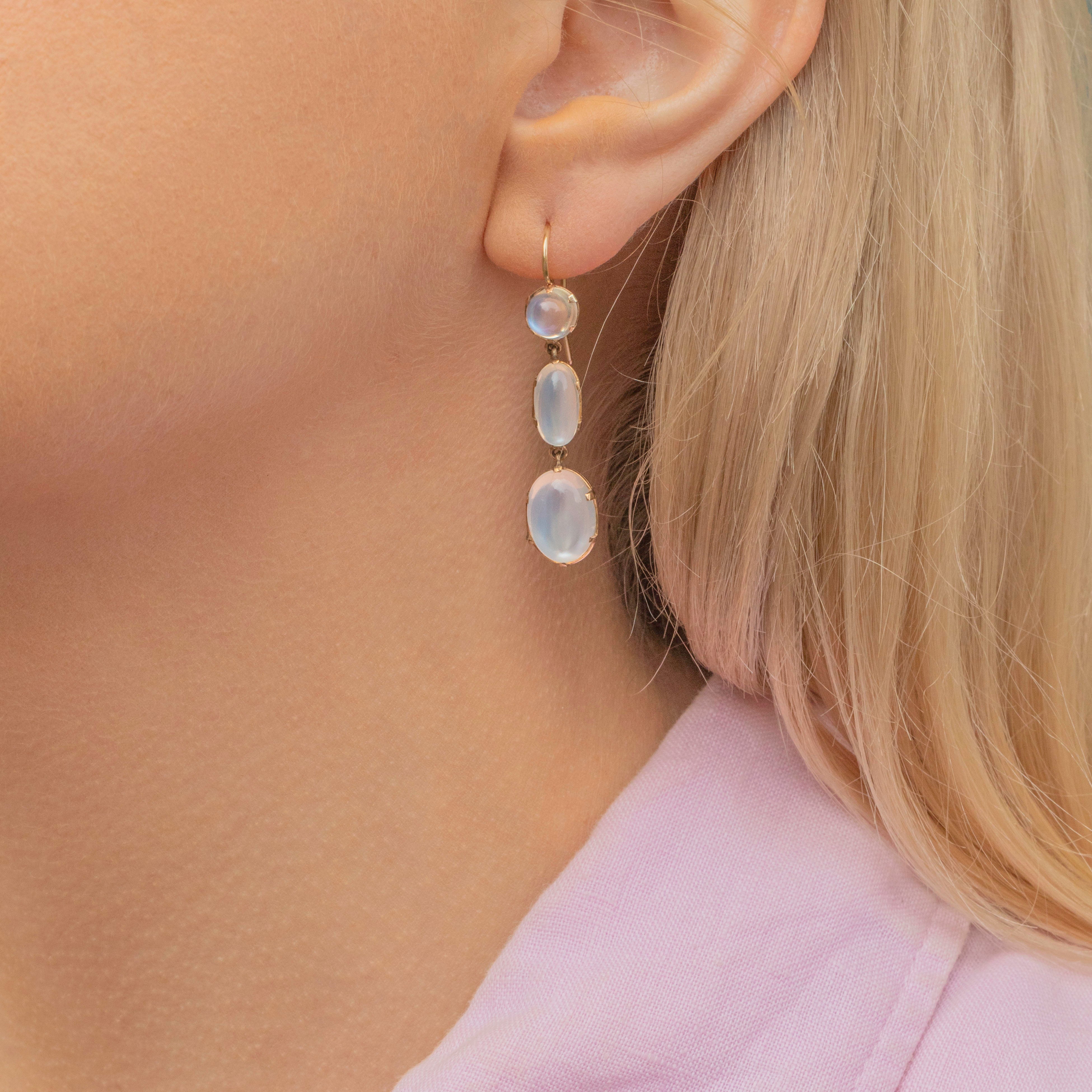 Crafted from buttery 9ct Gold, each earring displays three enchanting Moonstones that suspend elegantly from the lobe, framing your face perfectly. The smoothly cut Moonstone cabochons boast an icy blue adularescence that thrives in the light, hypnotising and mystifying all who catch a glimpse.