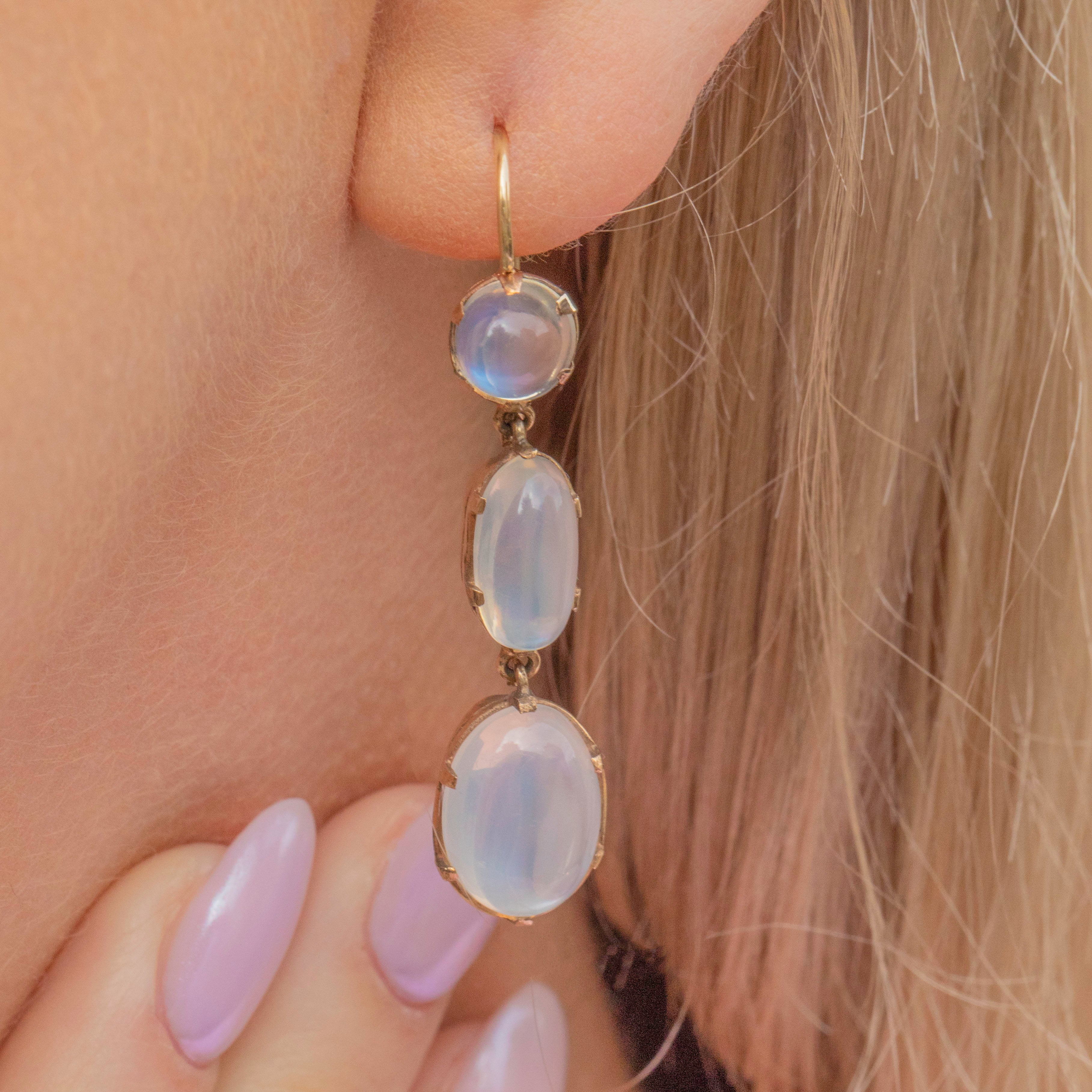 EXCELLENT. These antique 9ct Gold Moonstone drop earrings are in excellent condition throughout. The Moonstones all have a beautiful glow and are held securely in place by their settings. Her 9ct Gold is saturated with a wonderful glow and generously sized earring hooks; these Victorian earrings are ready to be worn with pride for many years to come!