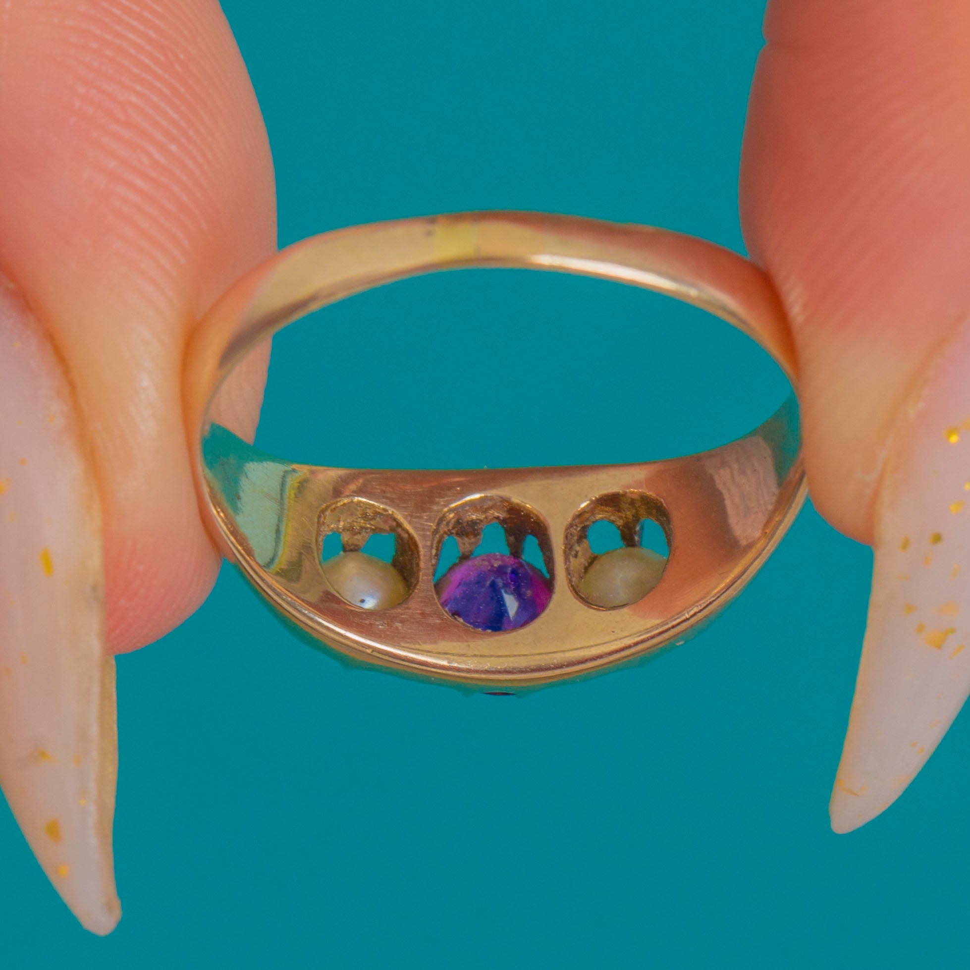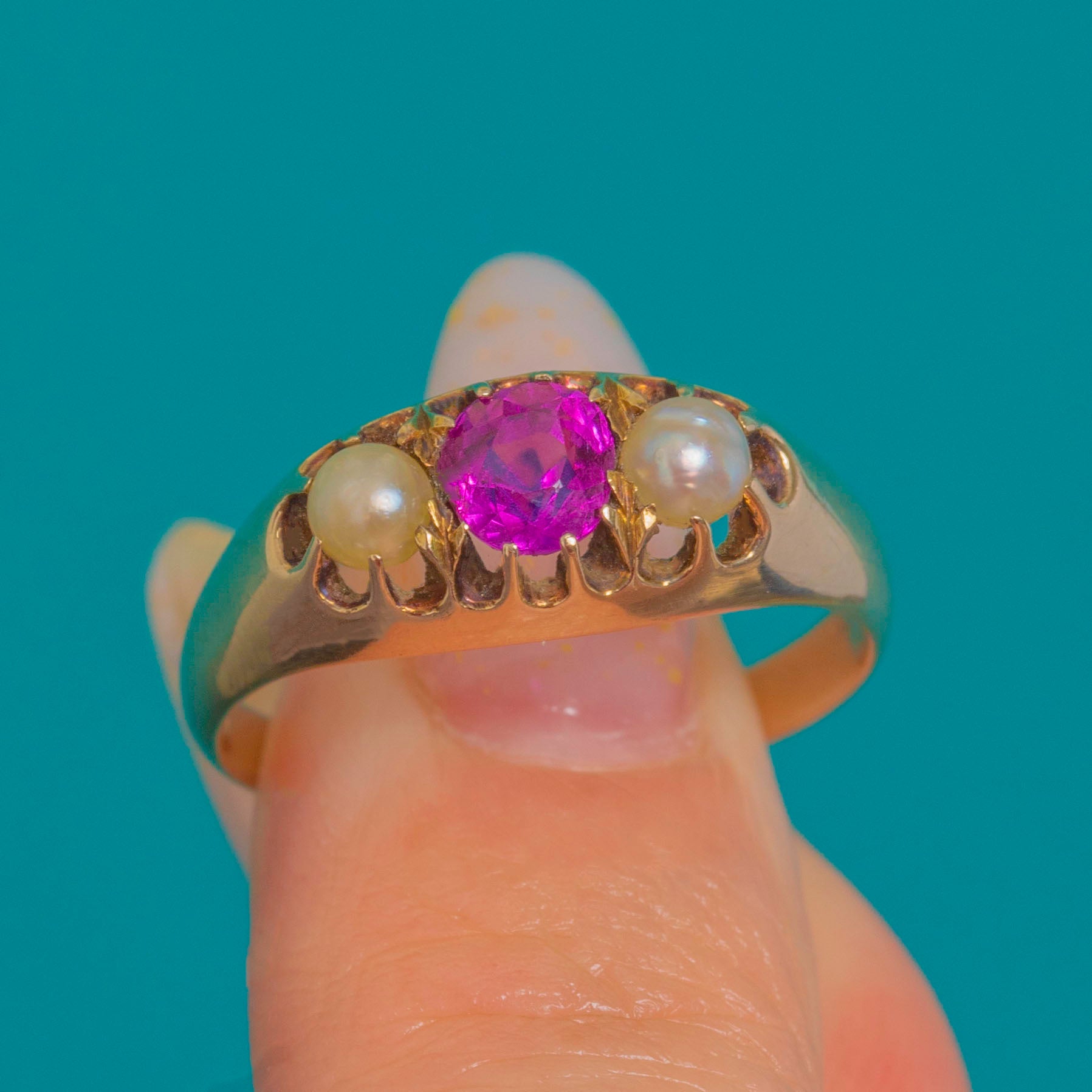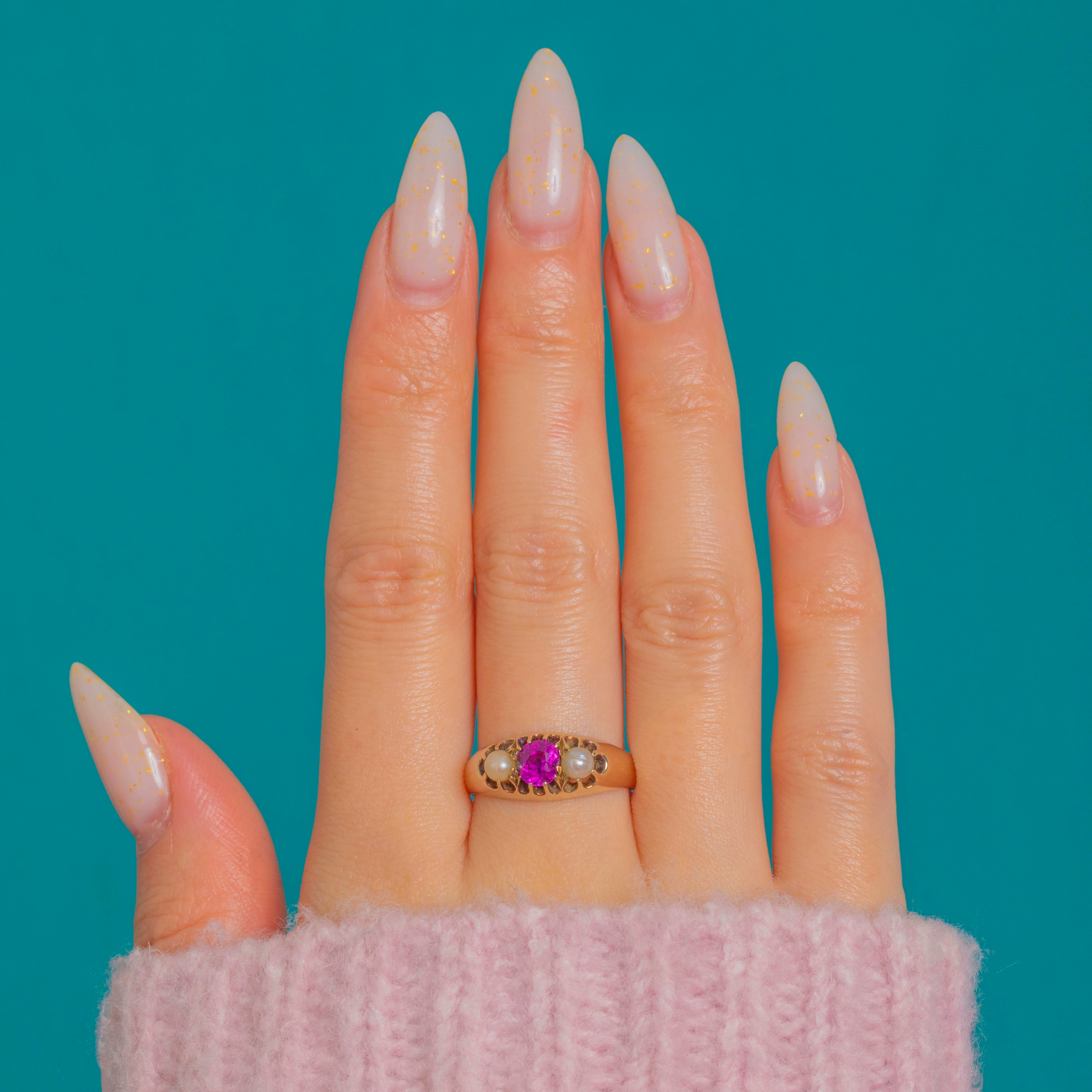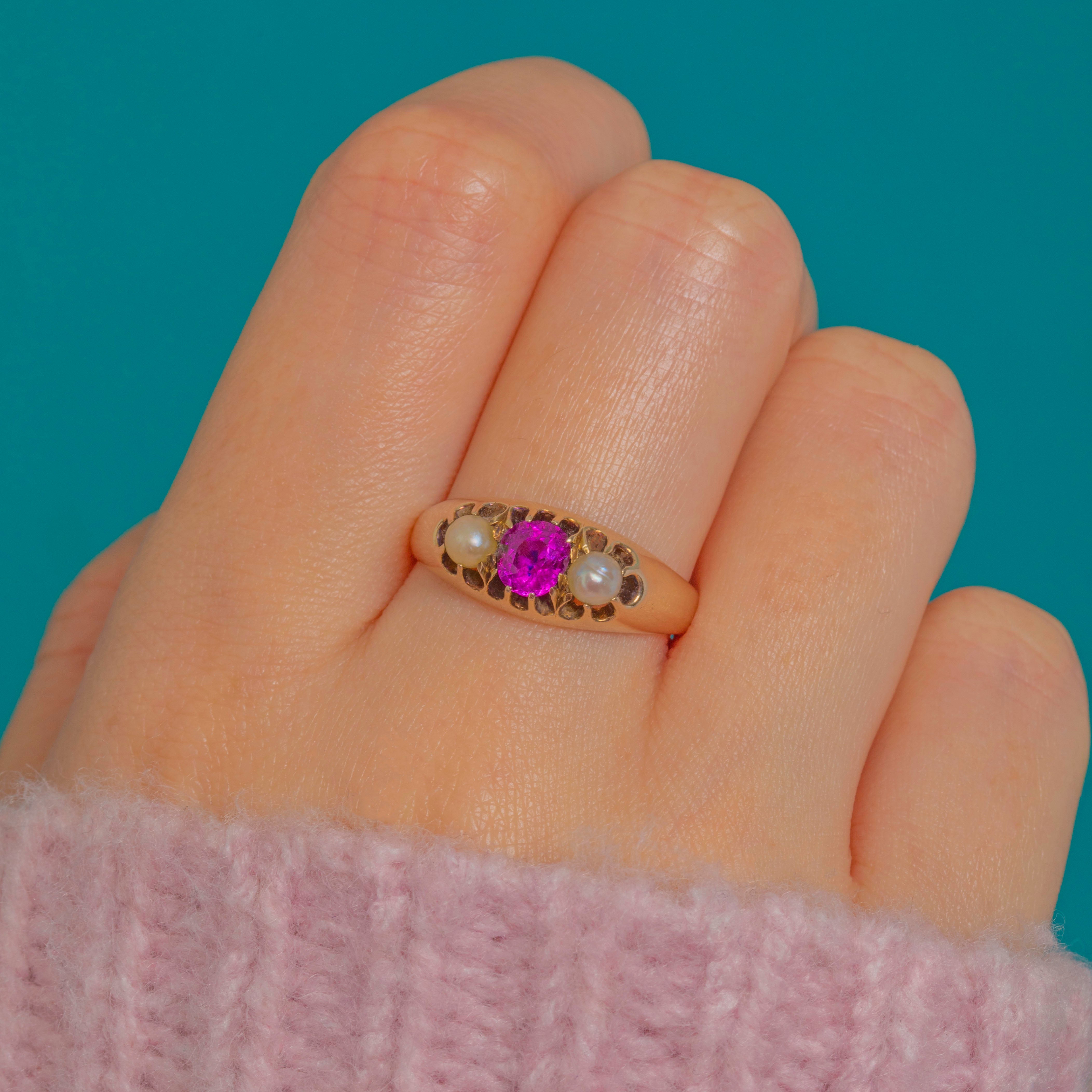 Low-profile and dainty, this romantic three-stone design offers effortless wear while its soft patina tells a century-old story. A timeless Victorian favourite, the Ruby and Pearl pairing brings elegance and a whisper of sentiment to everyday.