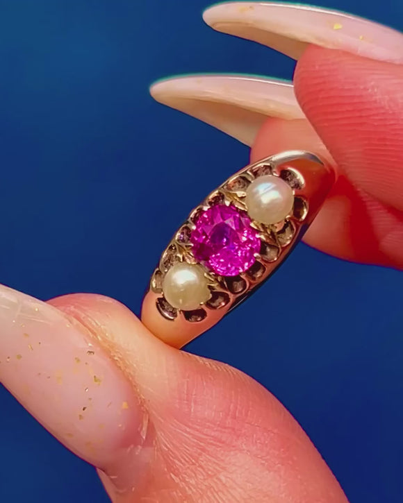 VERY GOOD-EXCELLENT: The Ruby is bright with crisp facets and no noticeable chips or abrasions; the Pearls are secure with natural surface characteristics typical for age. There is some discolouration at the back of the band, possibly from a historic resizing. The Gold settings and tapered shank are smooth and robust.