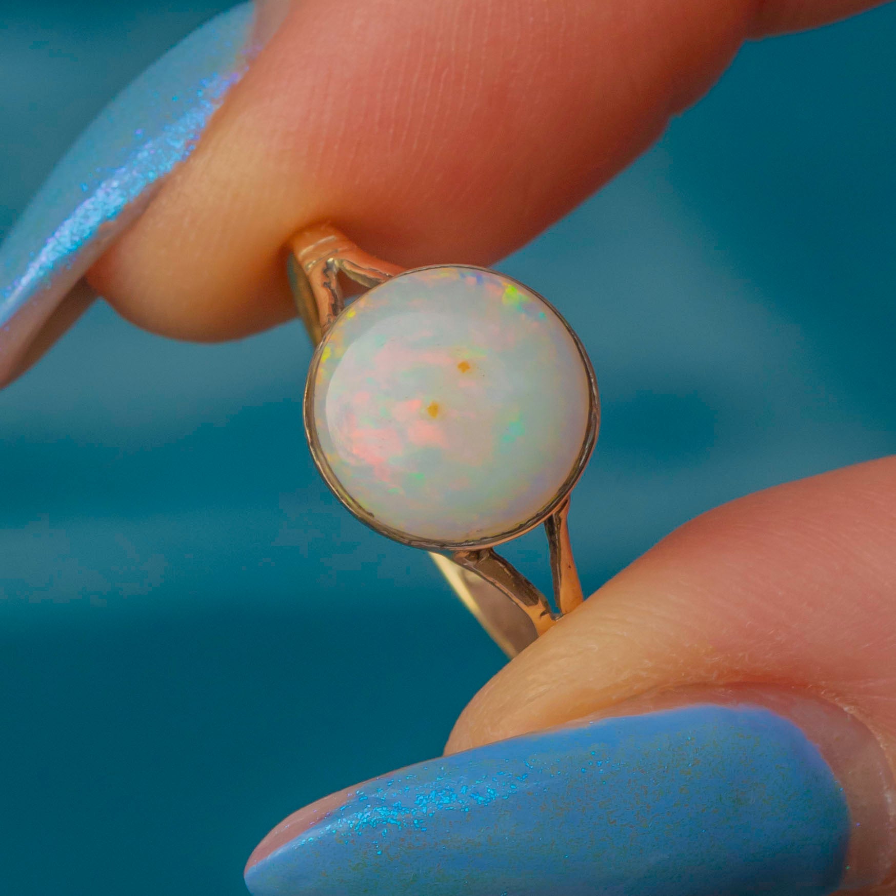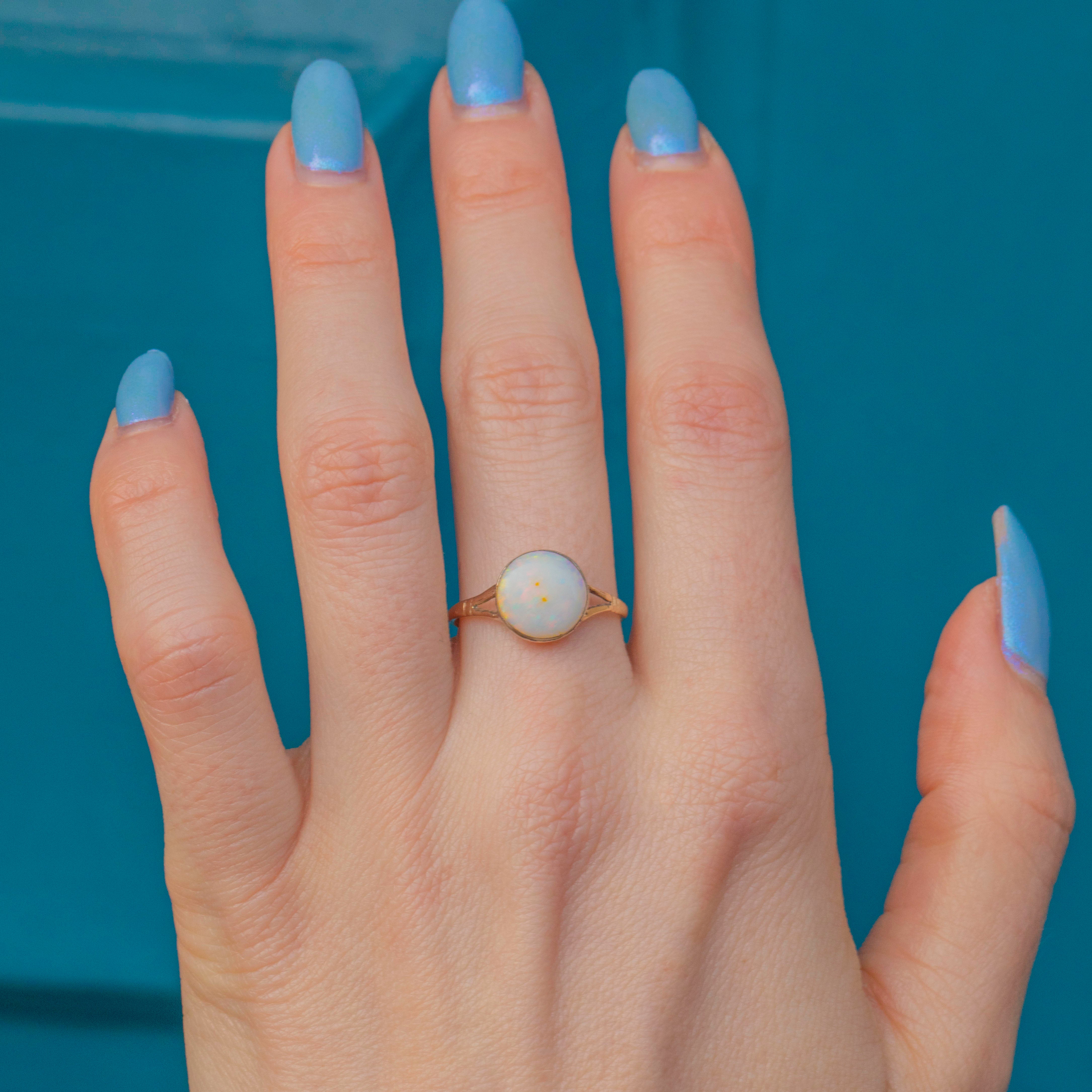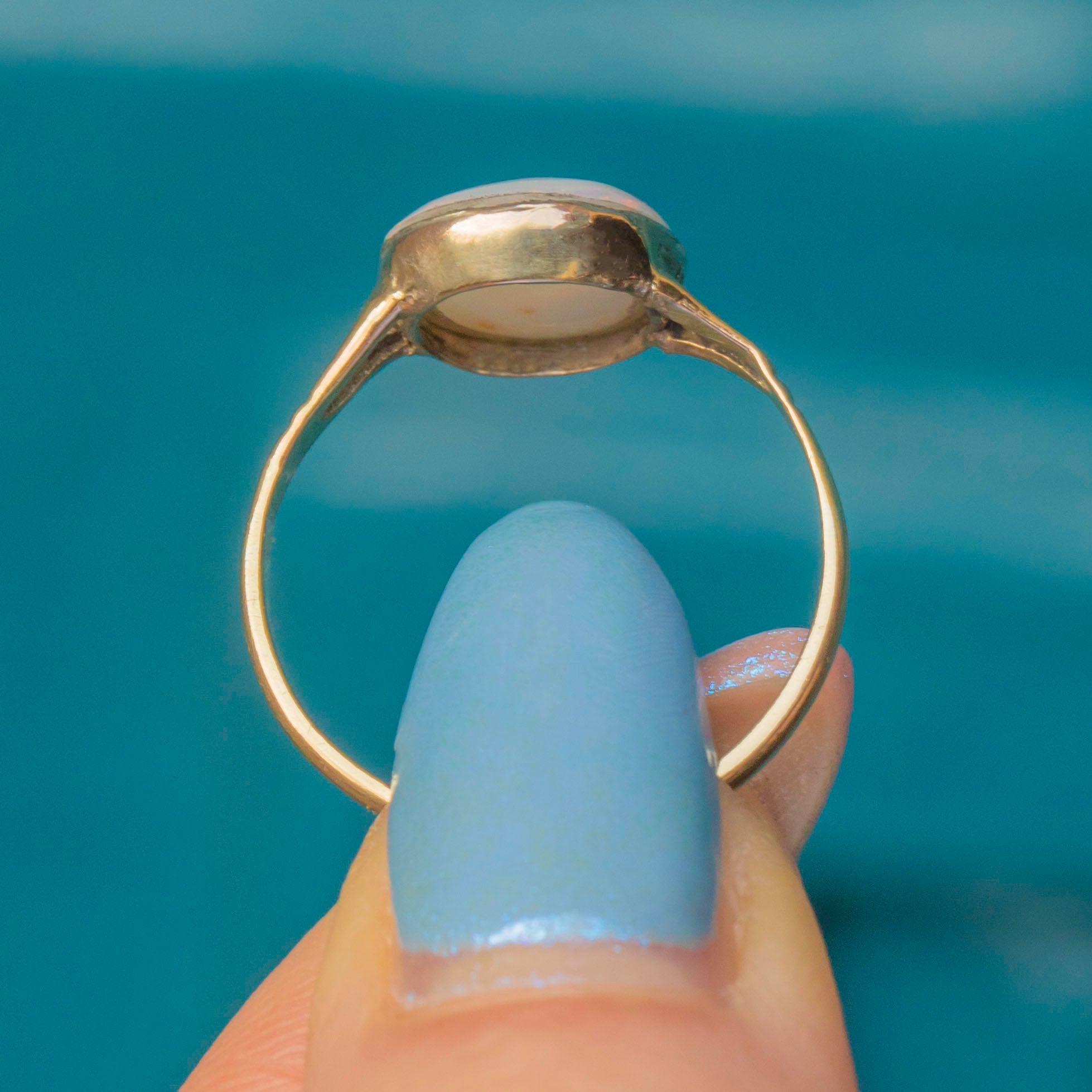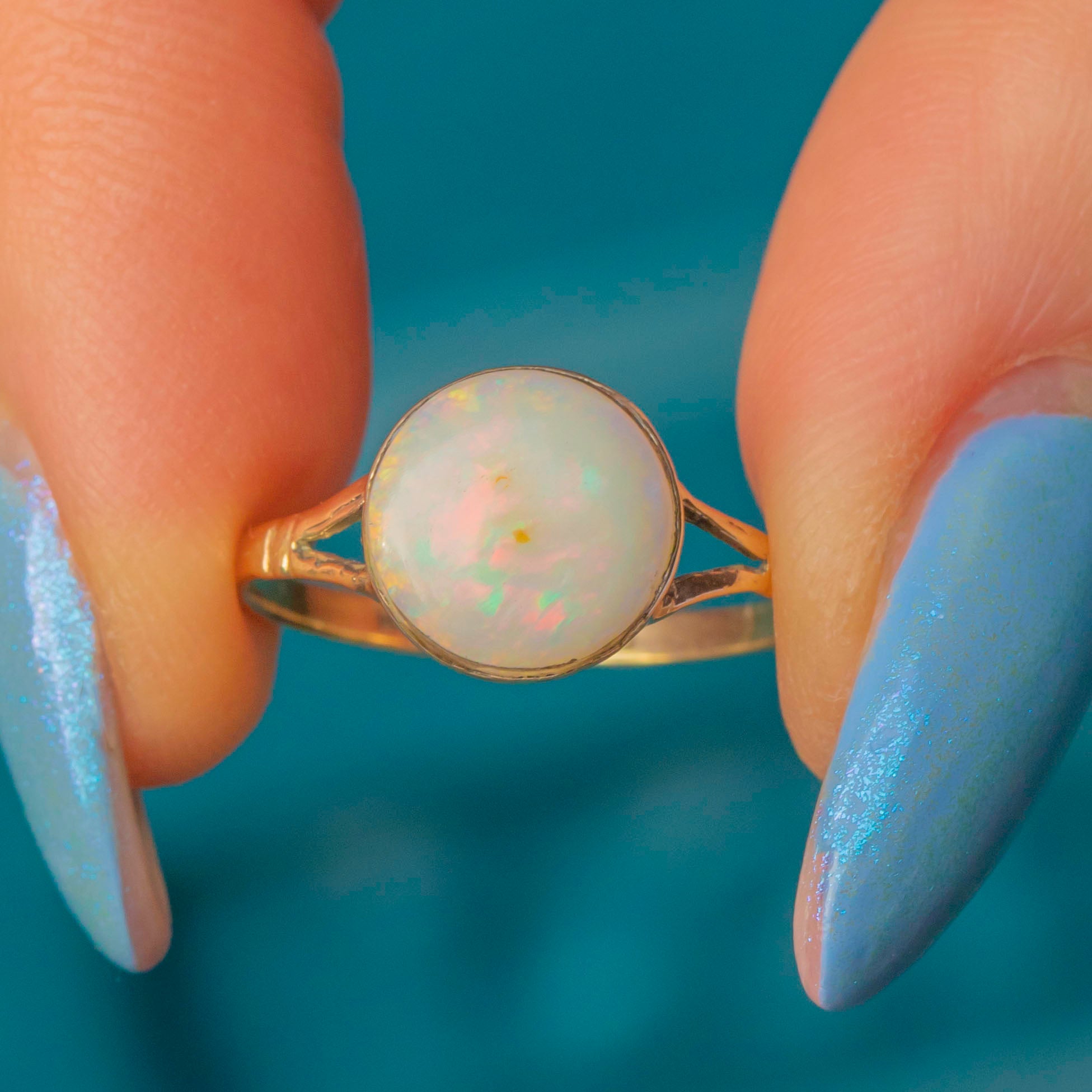 The bold design of this gorgeous antique 9ct Gold Opal cabochon bezel-set ring makes it a striking piece! The 2.30ct cabochon-cut Opal has those highly sought after flecks of orange and pink, with hints of lime and touches of blue, making her a feast for the eyes.