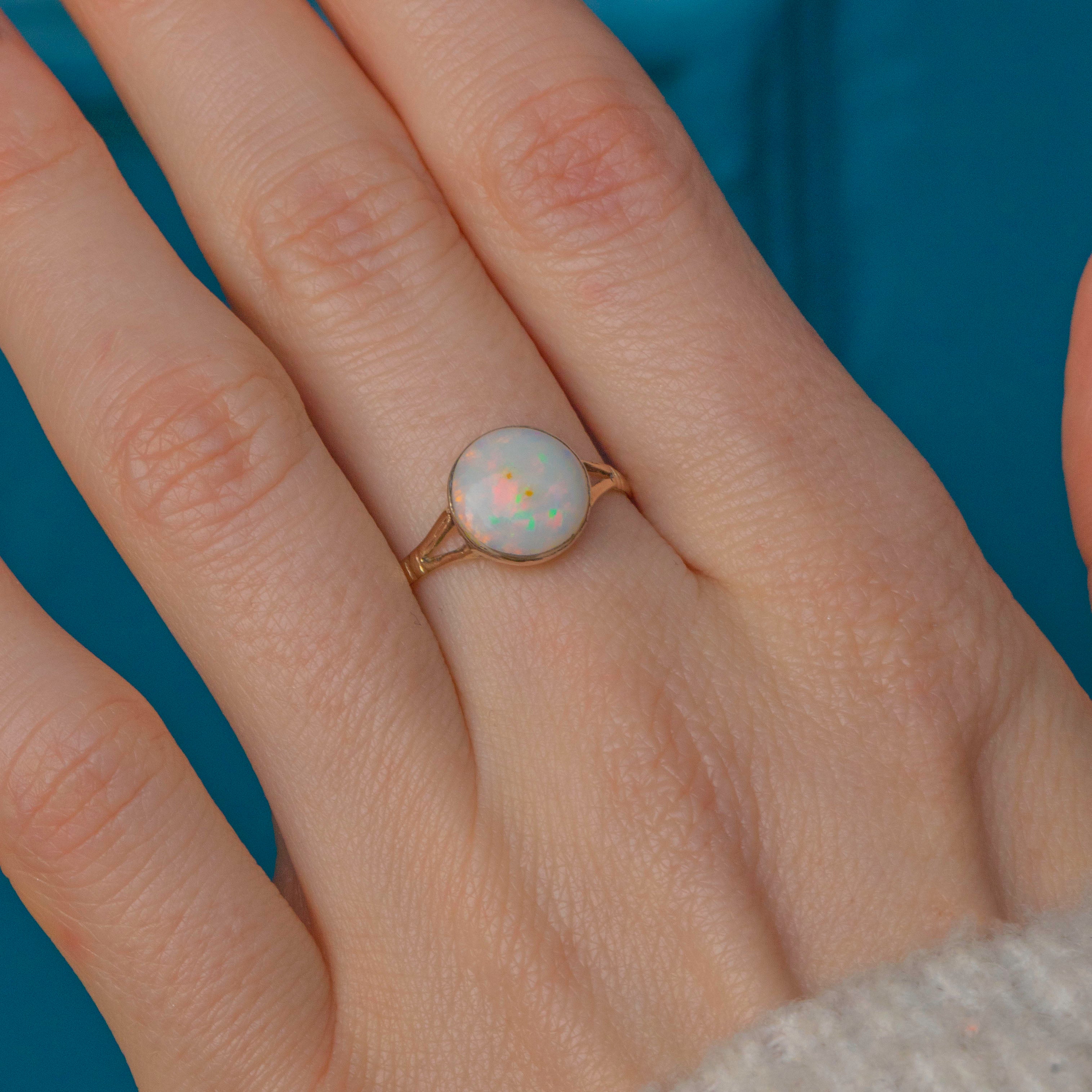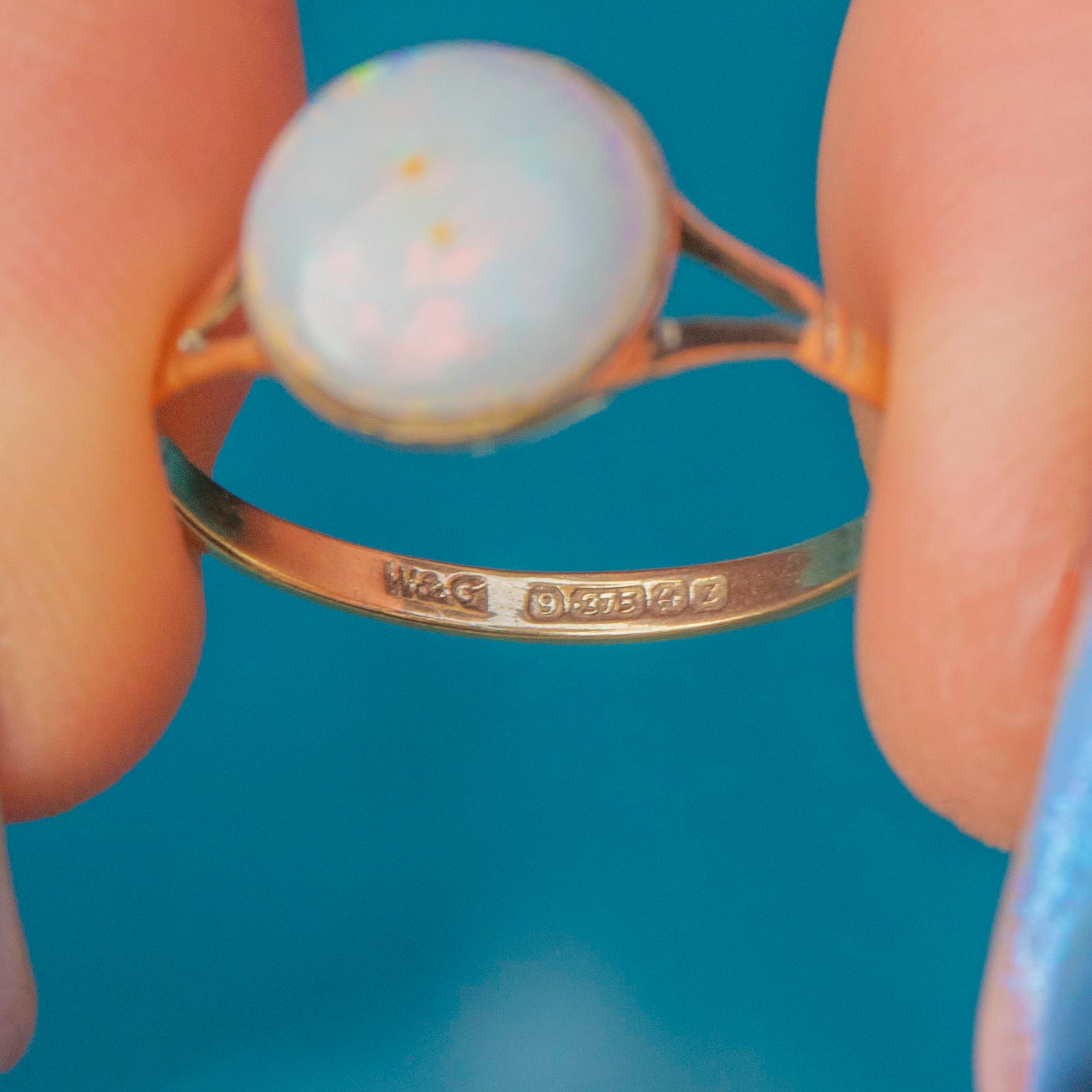 GOOD. This antique 9ct Gold Opal cabochon bezel-set ring is in good condition. This treasure has a lovely cabochon cut Opal at its focal point, secure in its bezel. The split shoulders have some visible joining marks, but when you wear the ring you can't see this. The ring has been resized but this work has been carried out well and the band is smooth and the hallmarks have remained visible.