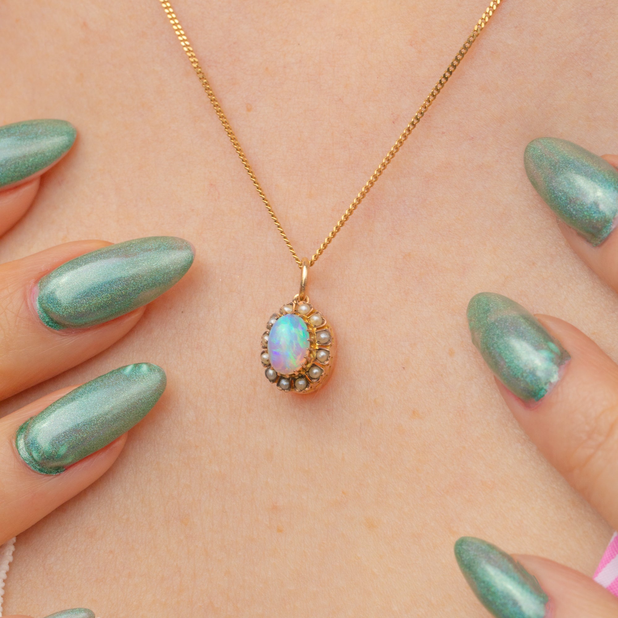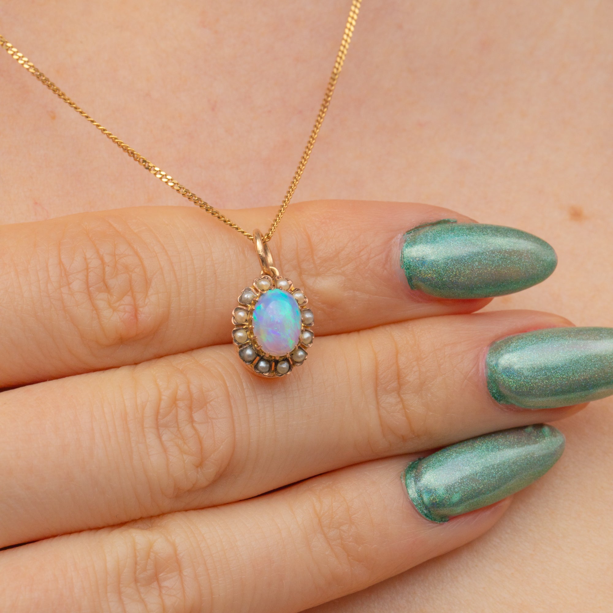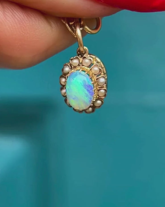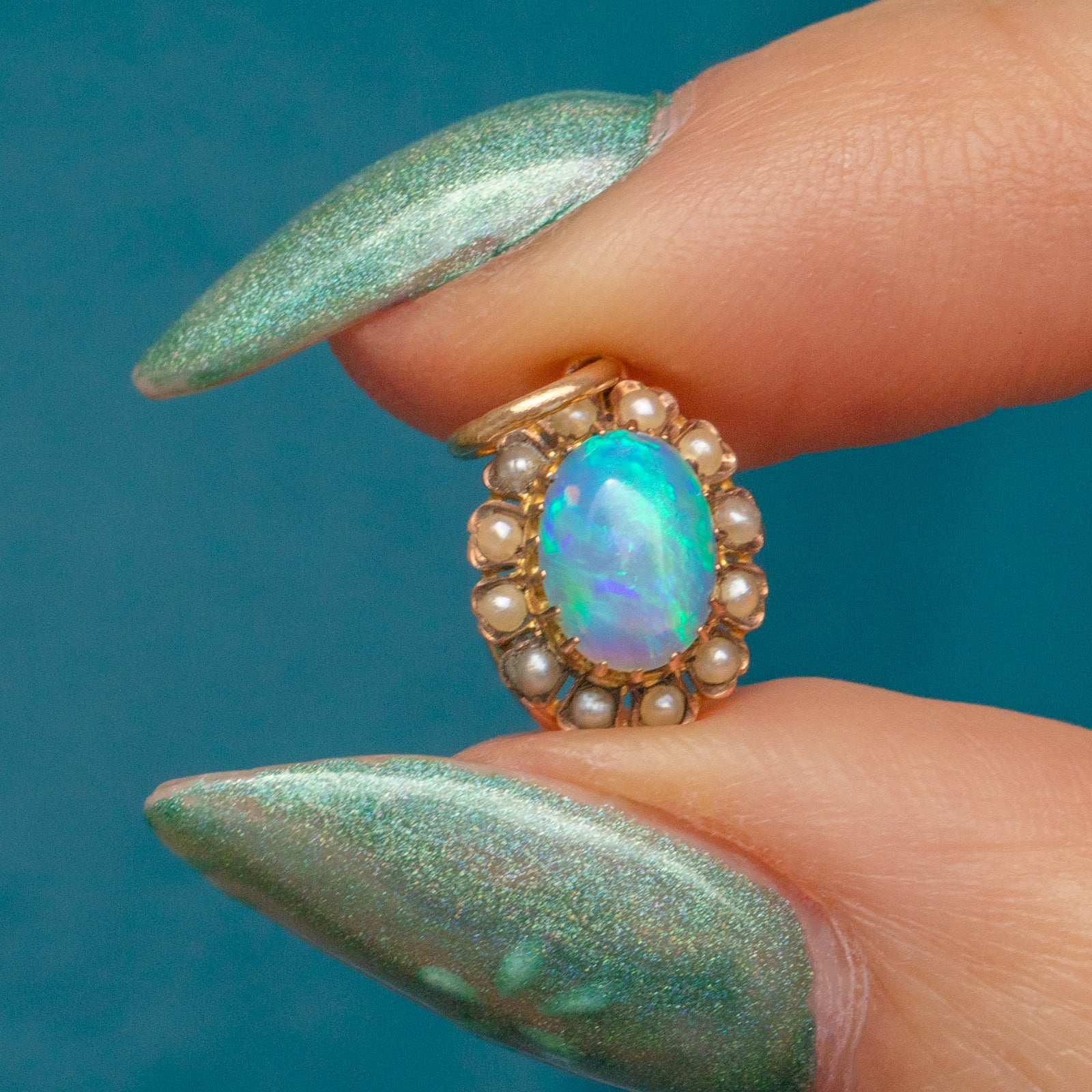 Isn't this antique 9ct Gold Opal Pearl charm just delicious?! A vivacious 0.70ct Opal flaunts intense ethereal hues that could enchant for hours, with a sea of champagne-hued seed Pearls poised around her circumference.