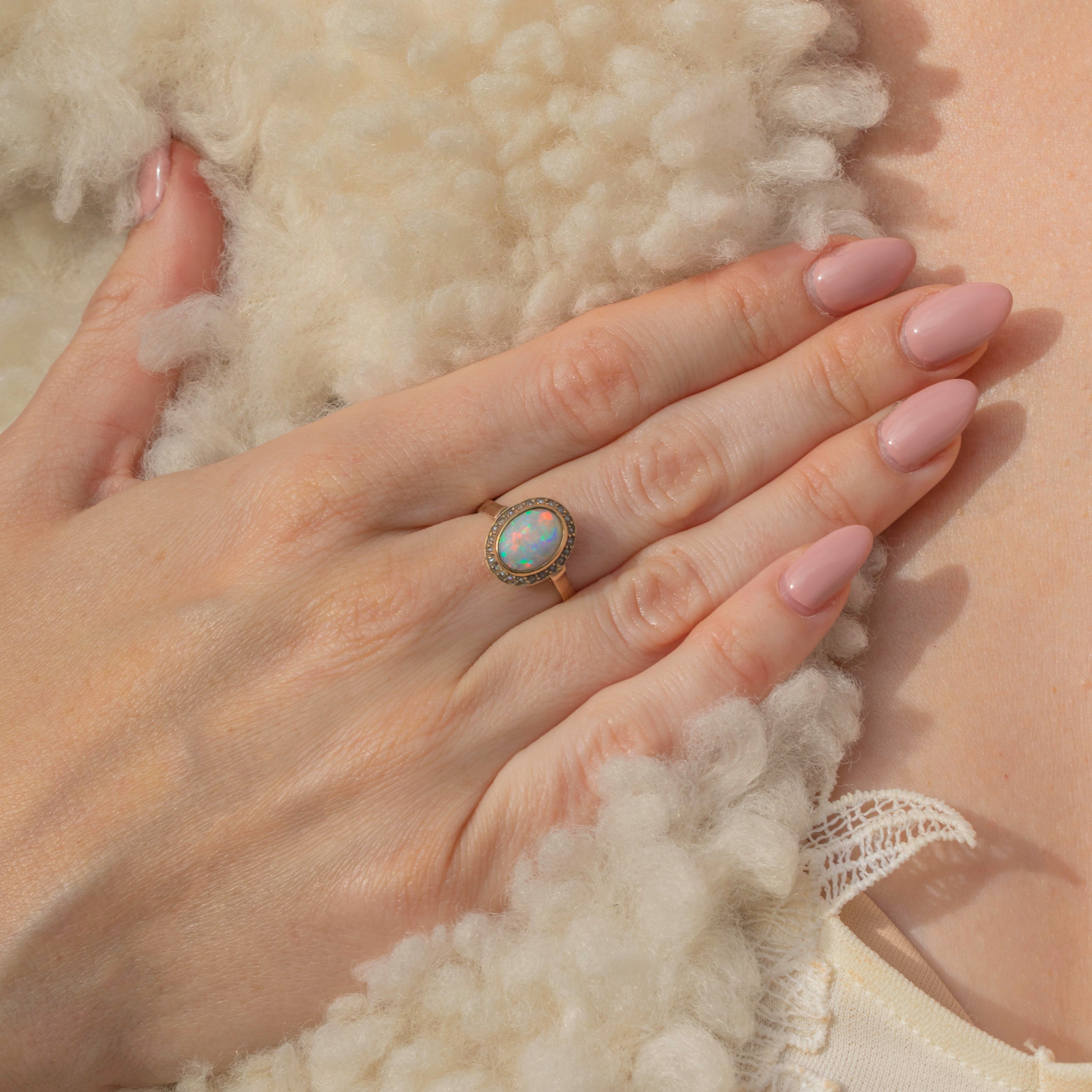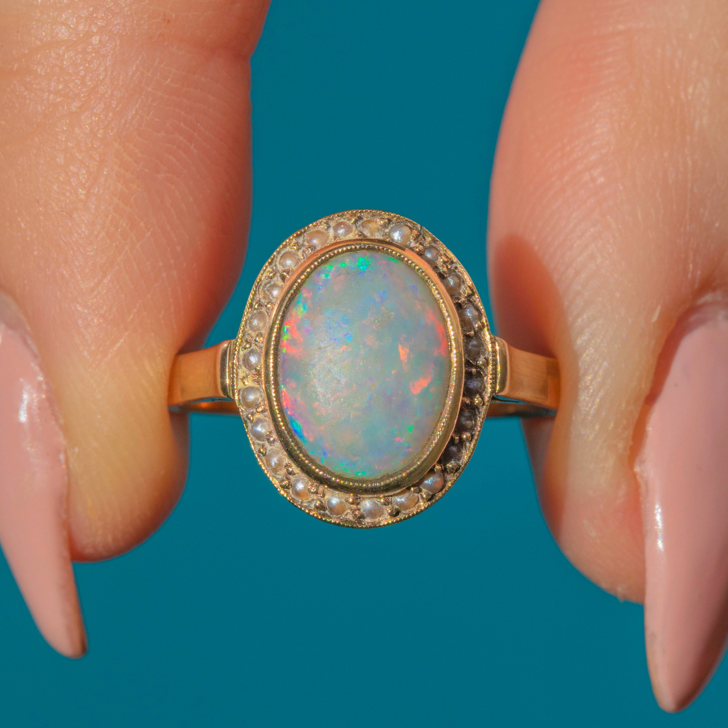 It is impossible to tire of the sheer beauty this antique 9ct Gold Opal Pearl cluster ring exudes! Her Opal has been plucked from outer space, with flashes of green, peach and violet running across her cream core and to make this Edwardian ring even better, she is haloed by a sea of shimmering Pearls.