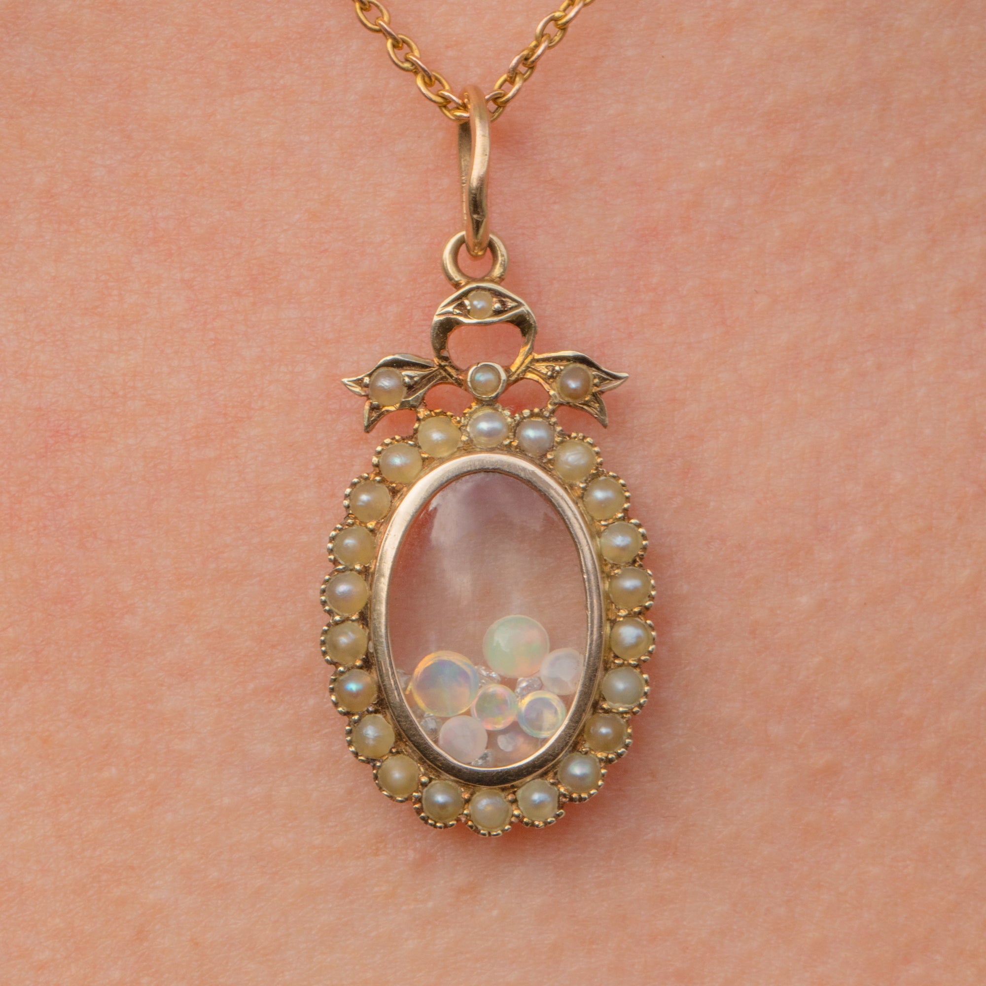 This antique 9ct Gold Pearl shaker locket, with Diamonds, Opals and Moonstones, is the epitome of antique charm! Dating back to the Edwardian era, this sweet locket is haloed by shimmering Pearls, boasting a fancy bow top and was crafted by renowned British jeweller Murrle Bennett.