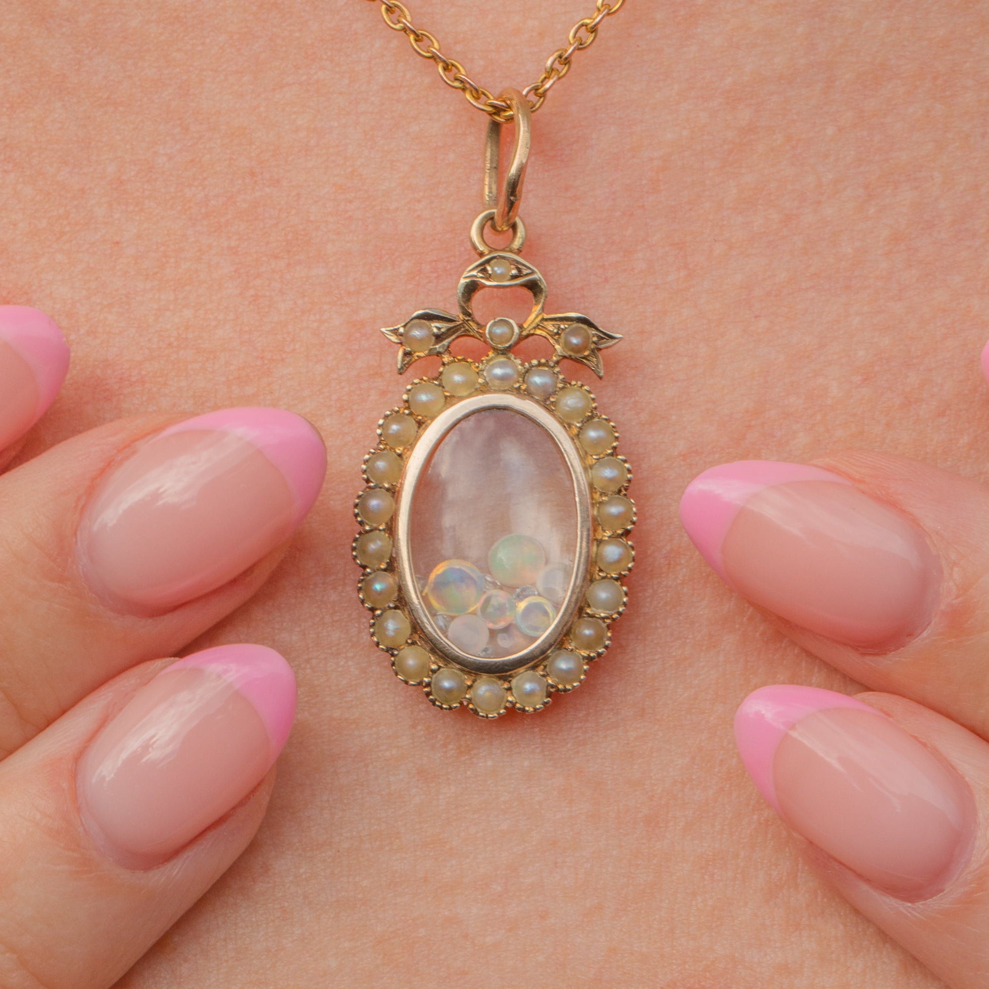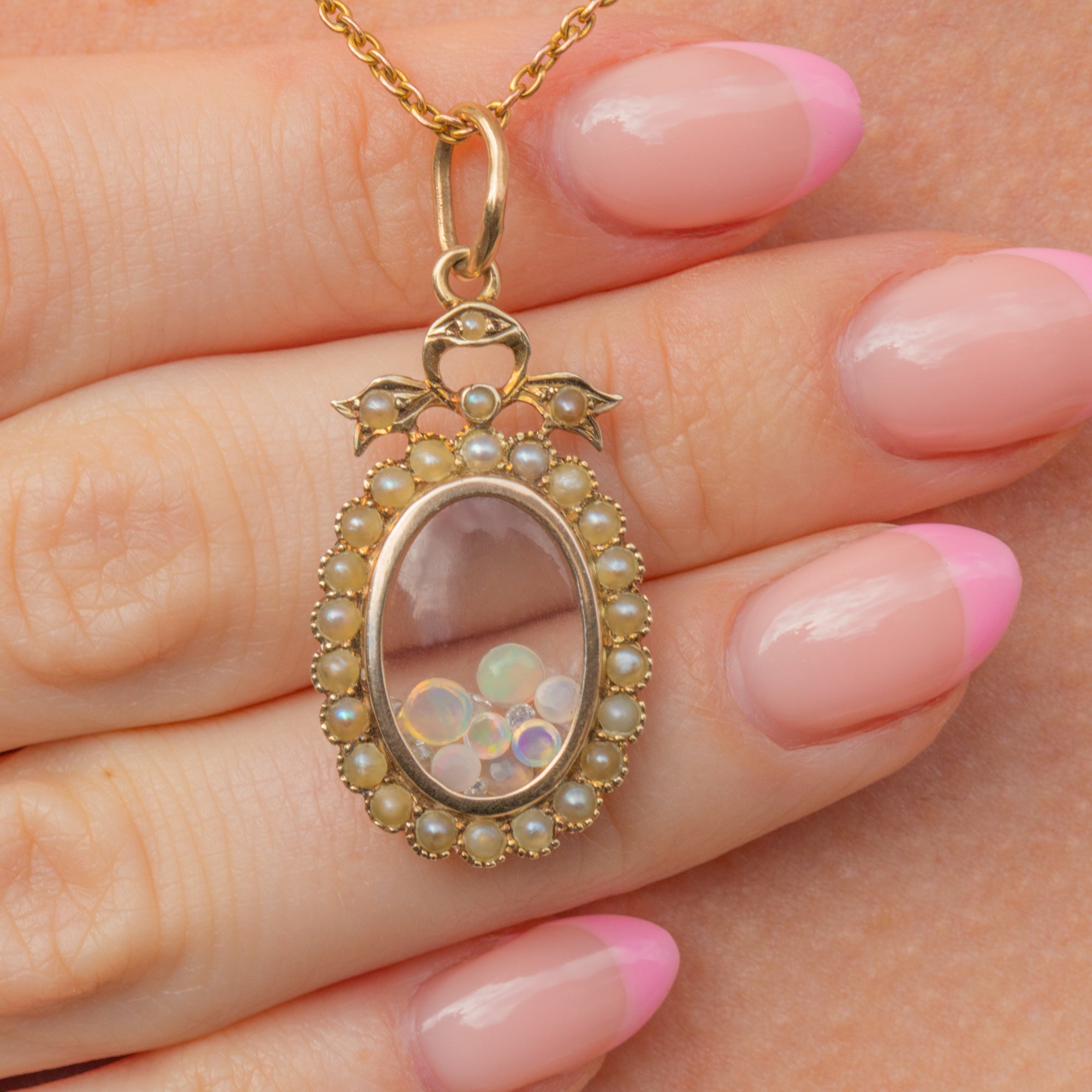 With a party of gems nestled inside her glass, the twinkling Diamonds, iridescent Opals and luminous Moonstones look sublime when they catch in the light. We adore how her plump Pearls brining femininity to this Edwardian locket, she will make a pretty addition to your antique jewellery collection!