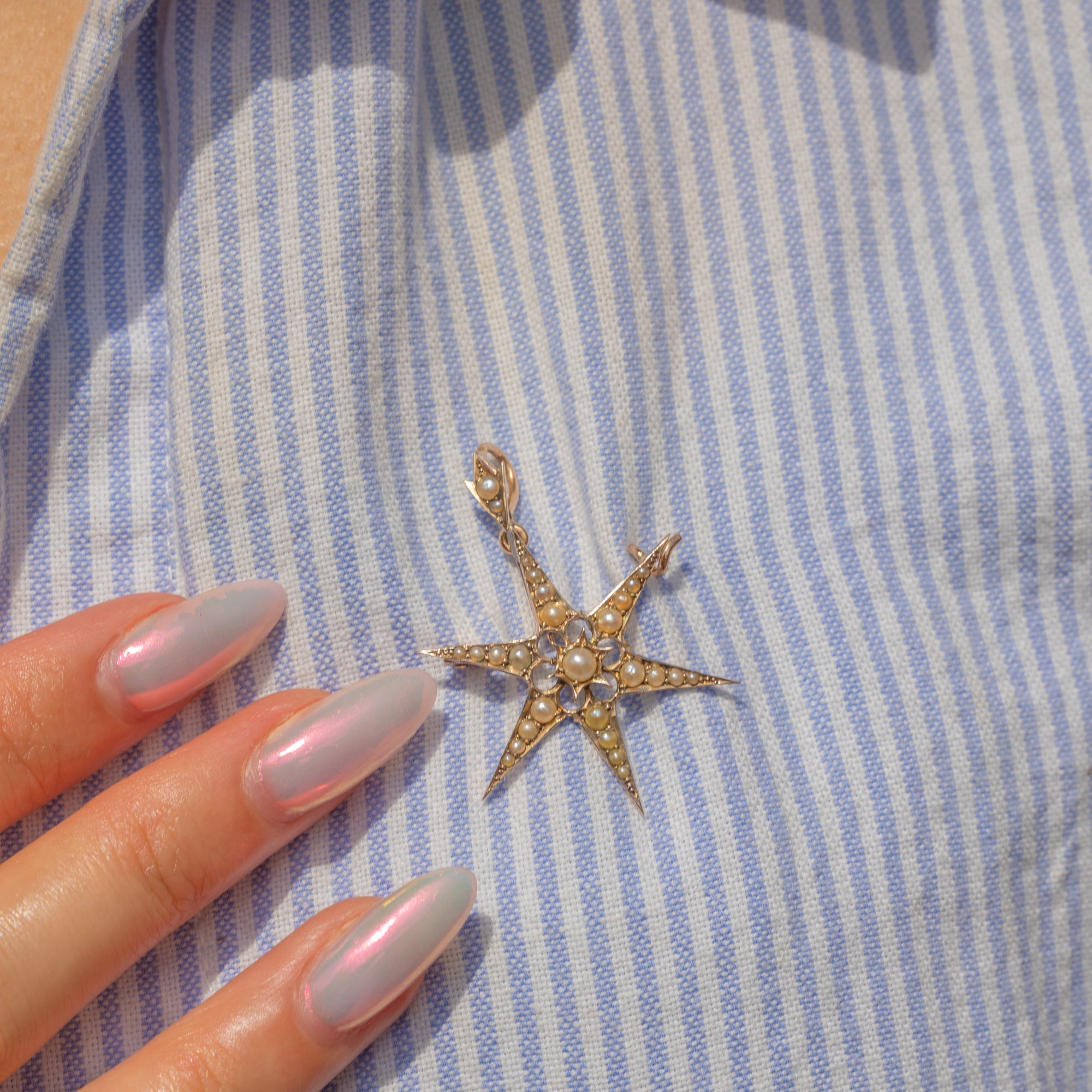 This gorgeous six-pointed star will add bundles of celestial charm to your outfit! Finely crafted from radiant 9ct Gold and studded with shimmering Pearls, this piece of Victorian jewellery can be worn as a pendant suspended from a chain or pinned to your lapel with use of the brooch fittings.