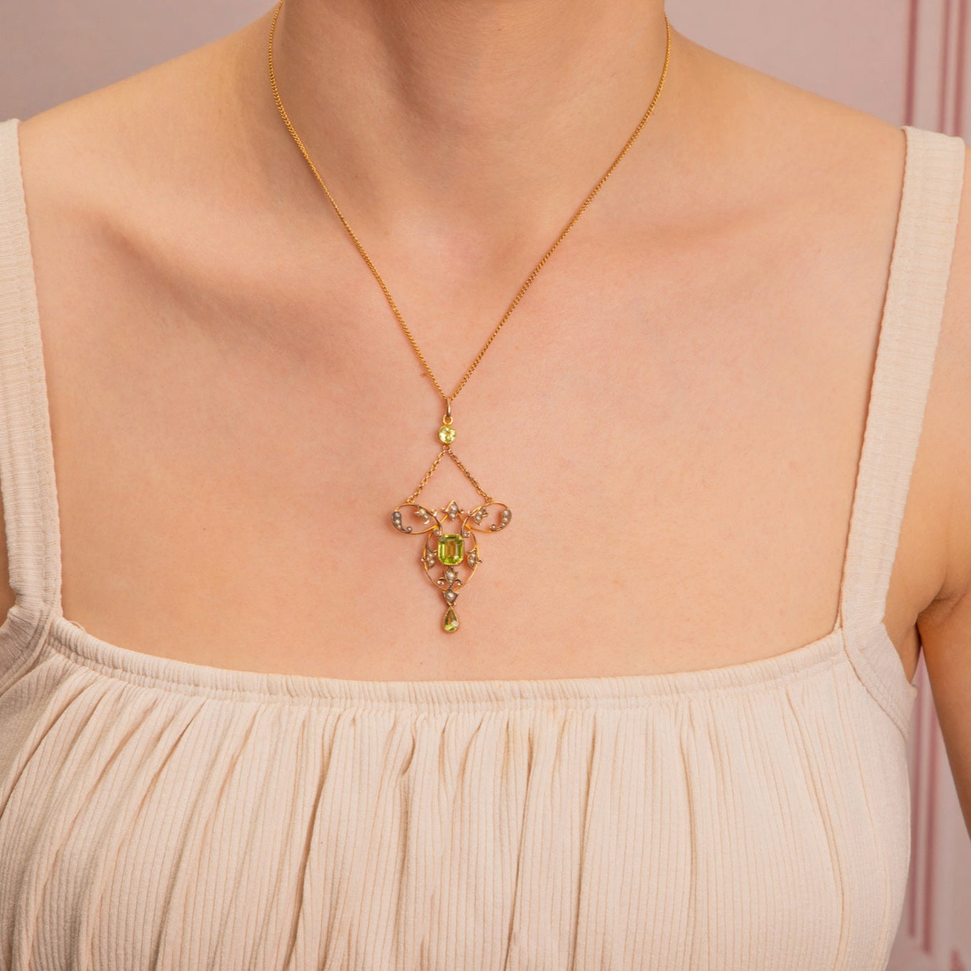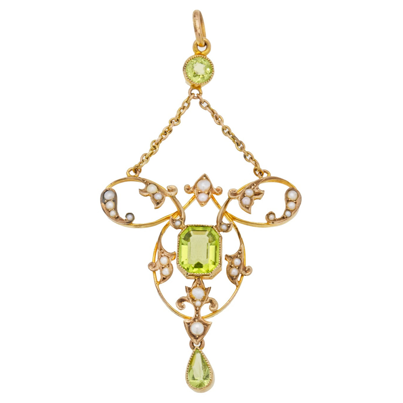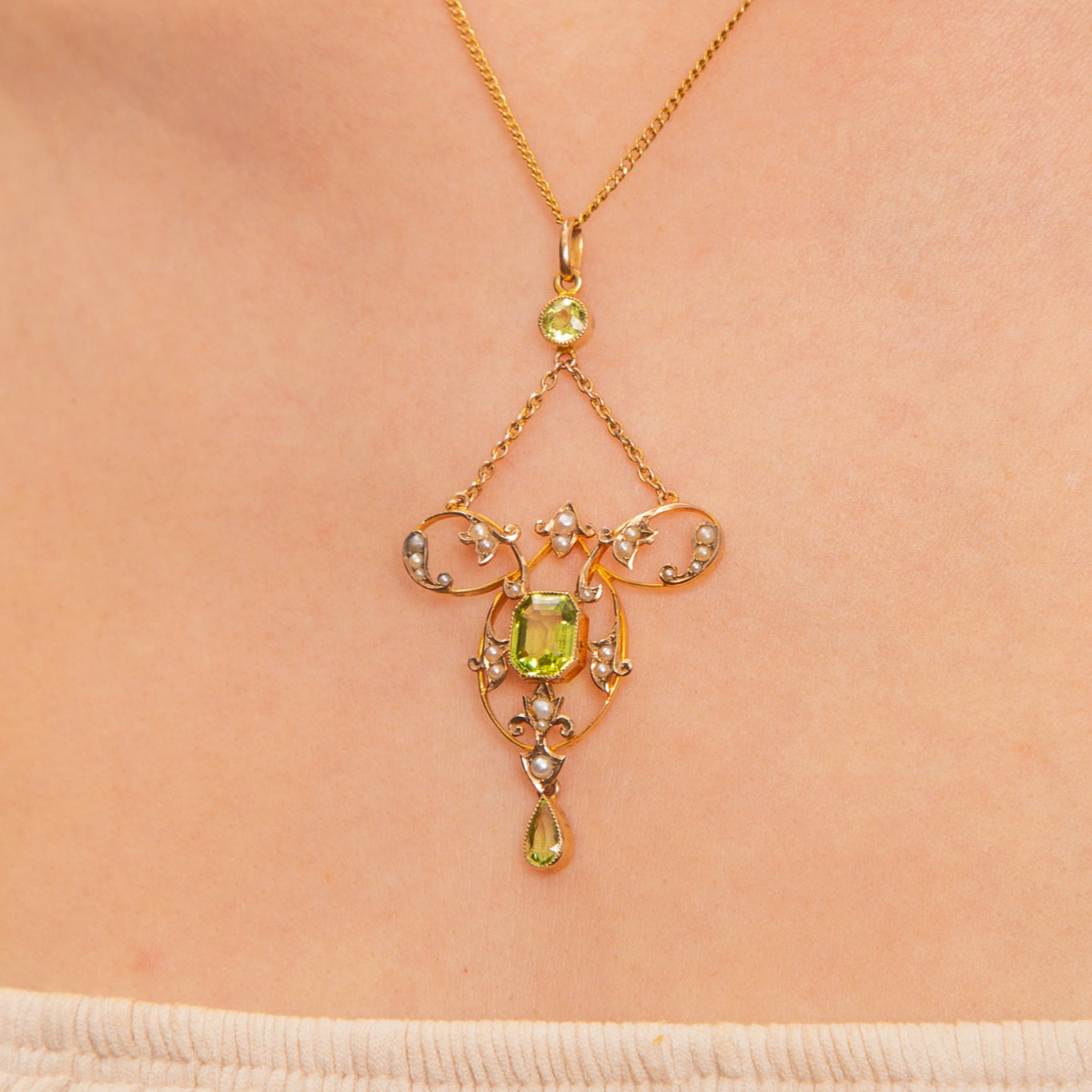 This Art Nouveau pendant will make for a show-stopping adornment on your chest. We love the lime green hues from the Peridot, which is balanced beautifully by the Pearls! This feminine masterpiece will be a sure winner for you, and your collection.