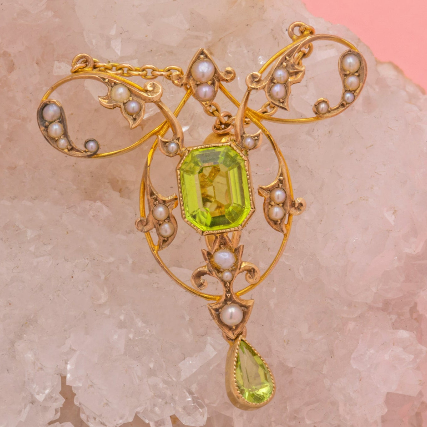 We adore this antique 9ct Peridot Pearl pendant! This treasure is Art Nouveau royalty, epitomising all that the era is adored for, with her fine swooping lines, pretty Pearls and zingy Peridot gems.