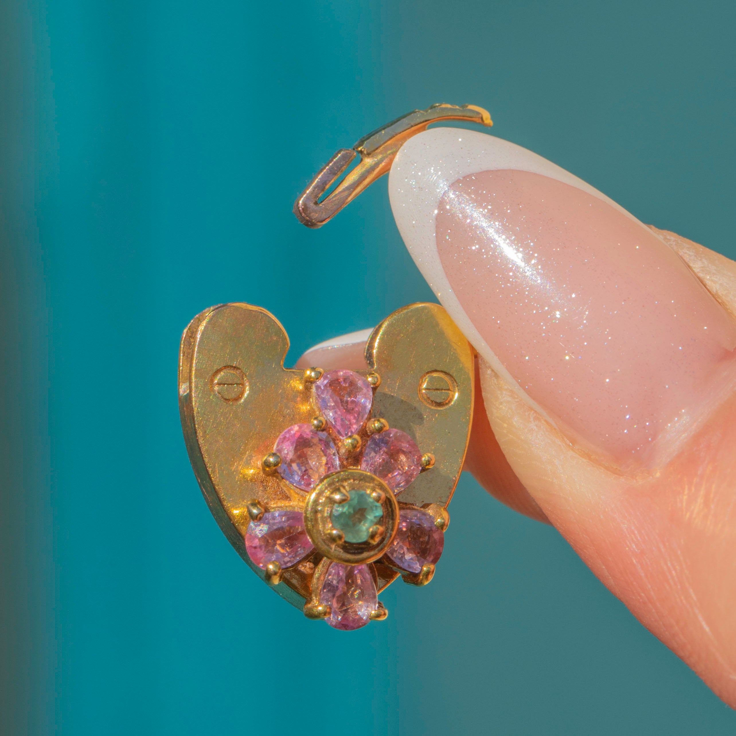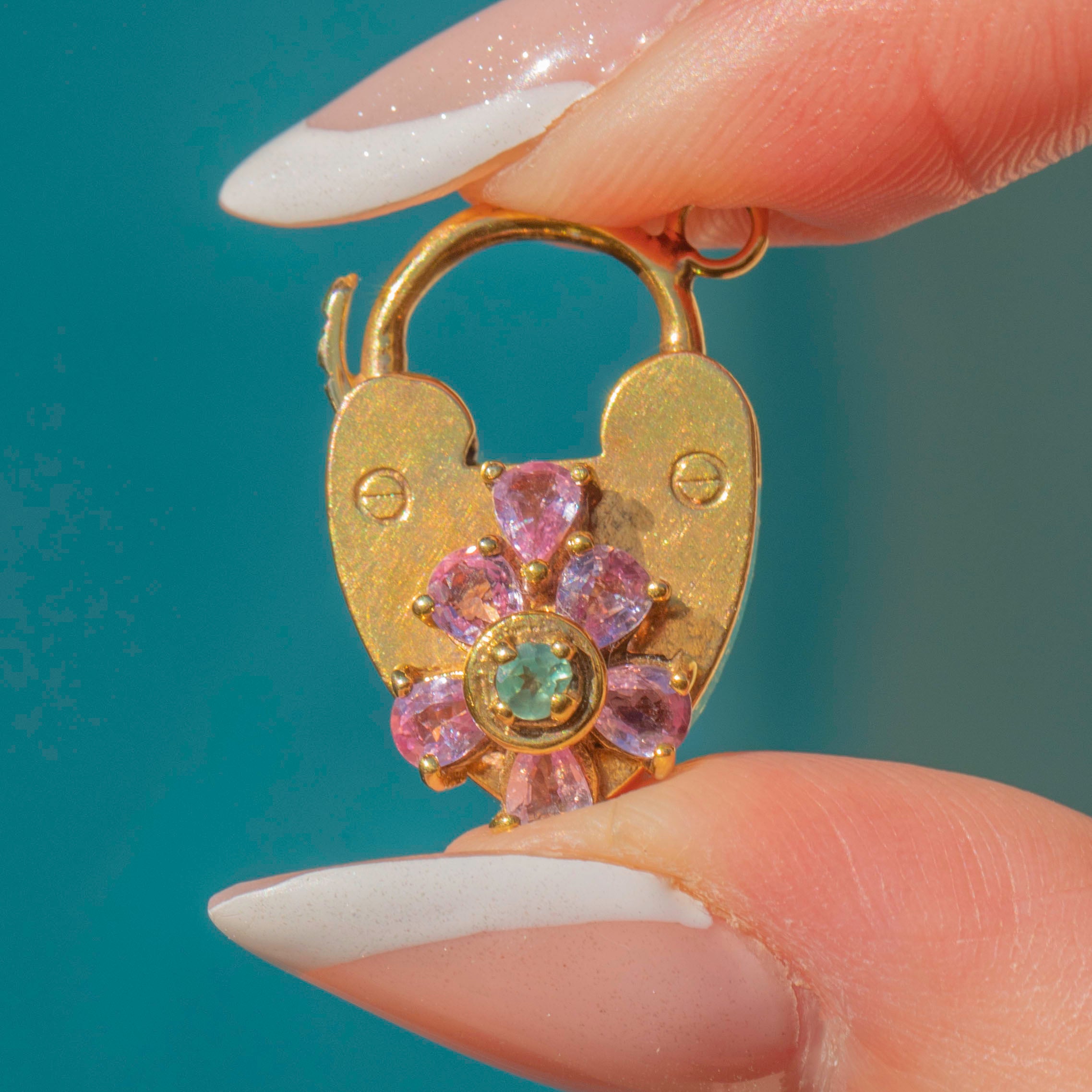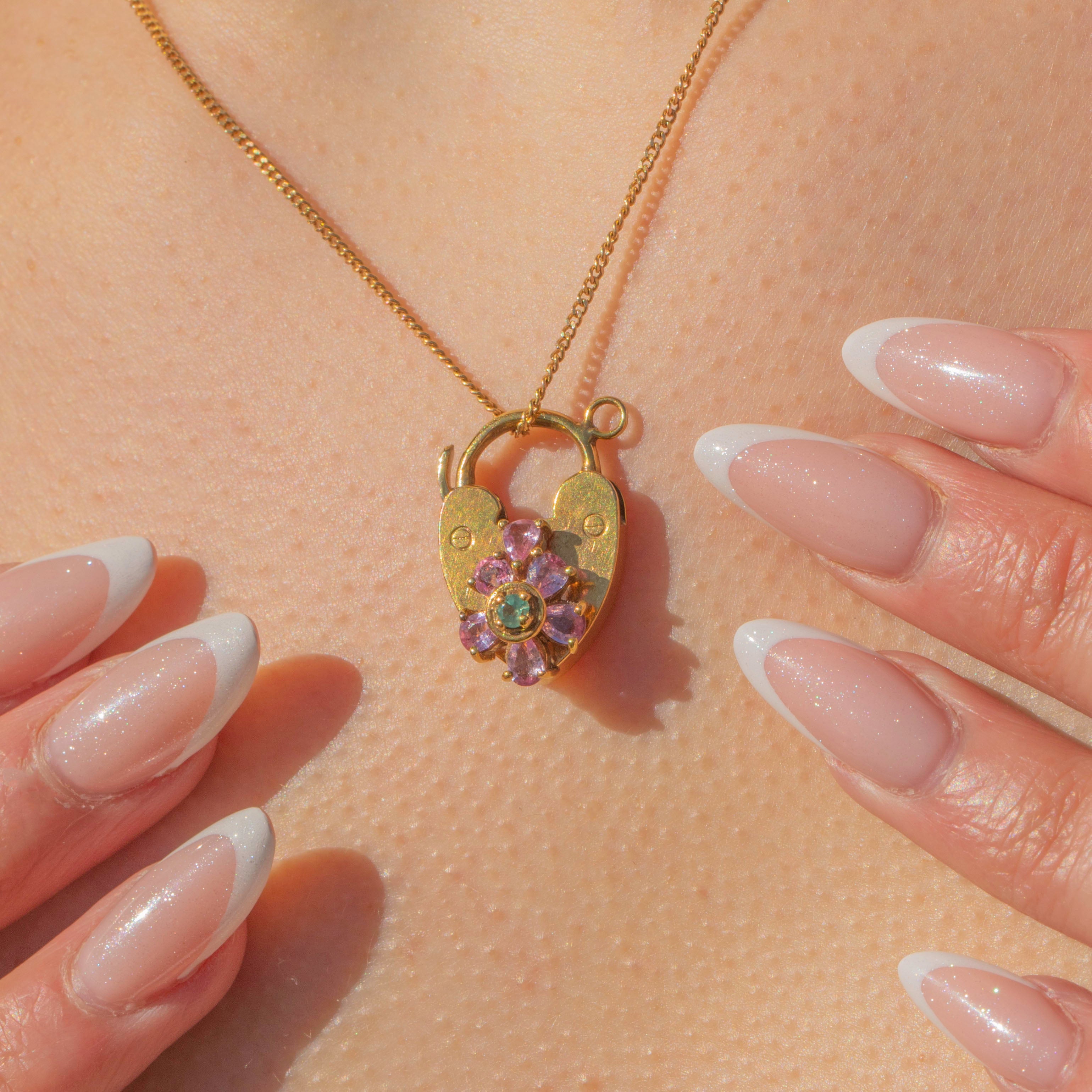 We adore this antique 9ct Gold Pink Topaz Emerald heart padlock pendant! This Victorian treasure is your classic Gold padlock with a twist, boasting pastel pink Topaz gems with an Emerald centre creating a vibrant, floral embellishment.