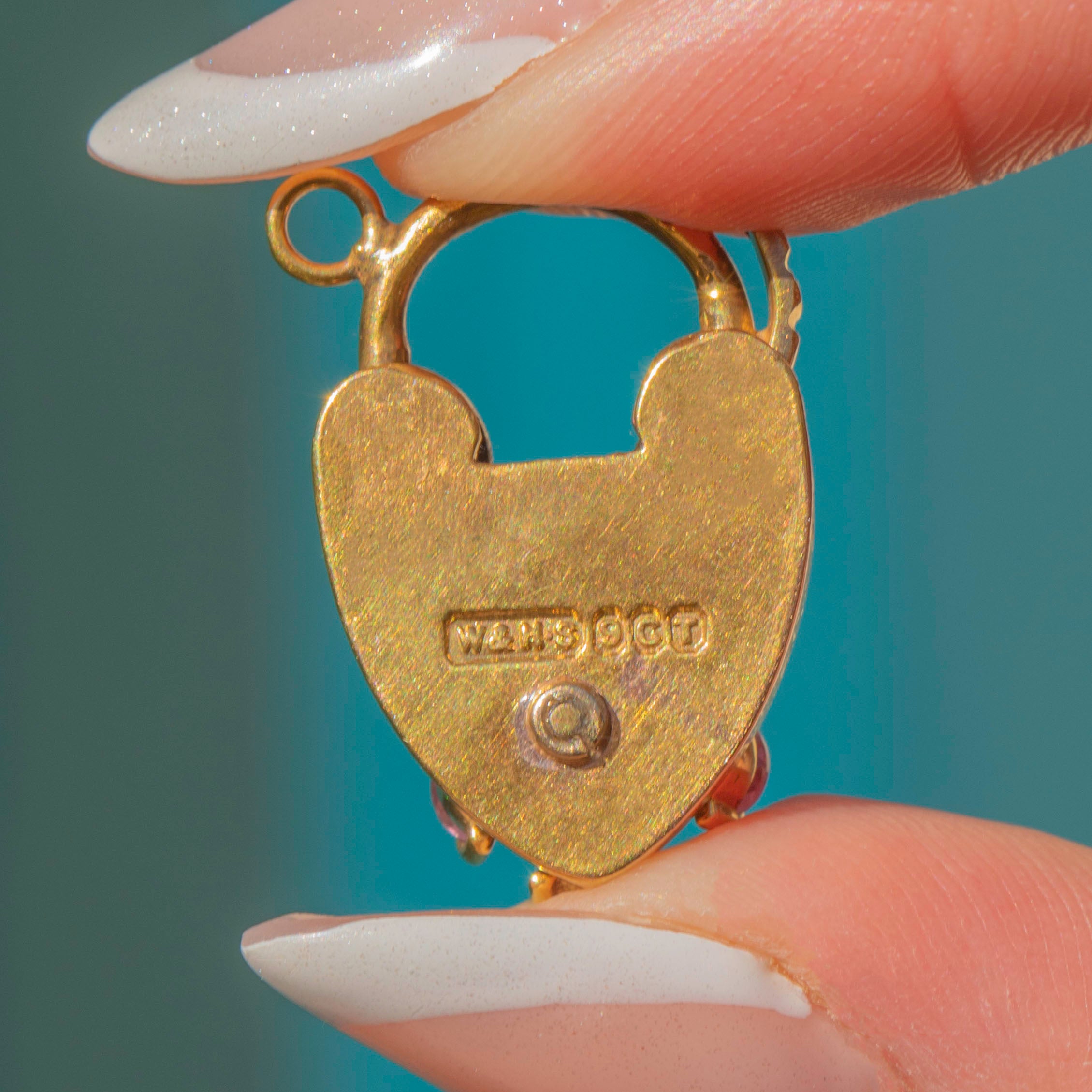 VERY GOOD. This antique 9ct Gold Pink Topaz Emerald heart padlock pendant is in very good condition! The piece is gorgeous on the front, and the gemstones are in fabulous condition. The back of the pendant shows some surface wear, commensurate with age, but the stamps remain clear. There is also some discolouration visible between the two domes of the heart, but this isn't something that you can see unless looking from the top down. With a fully functioning lever, you can wear this Victorian heart padlock with absolute confidence!