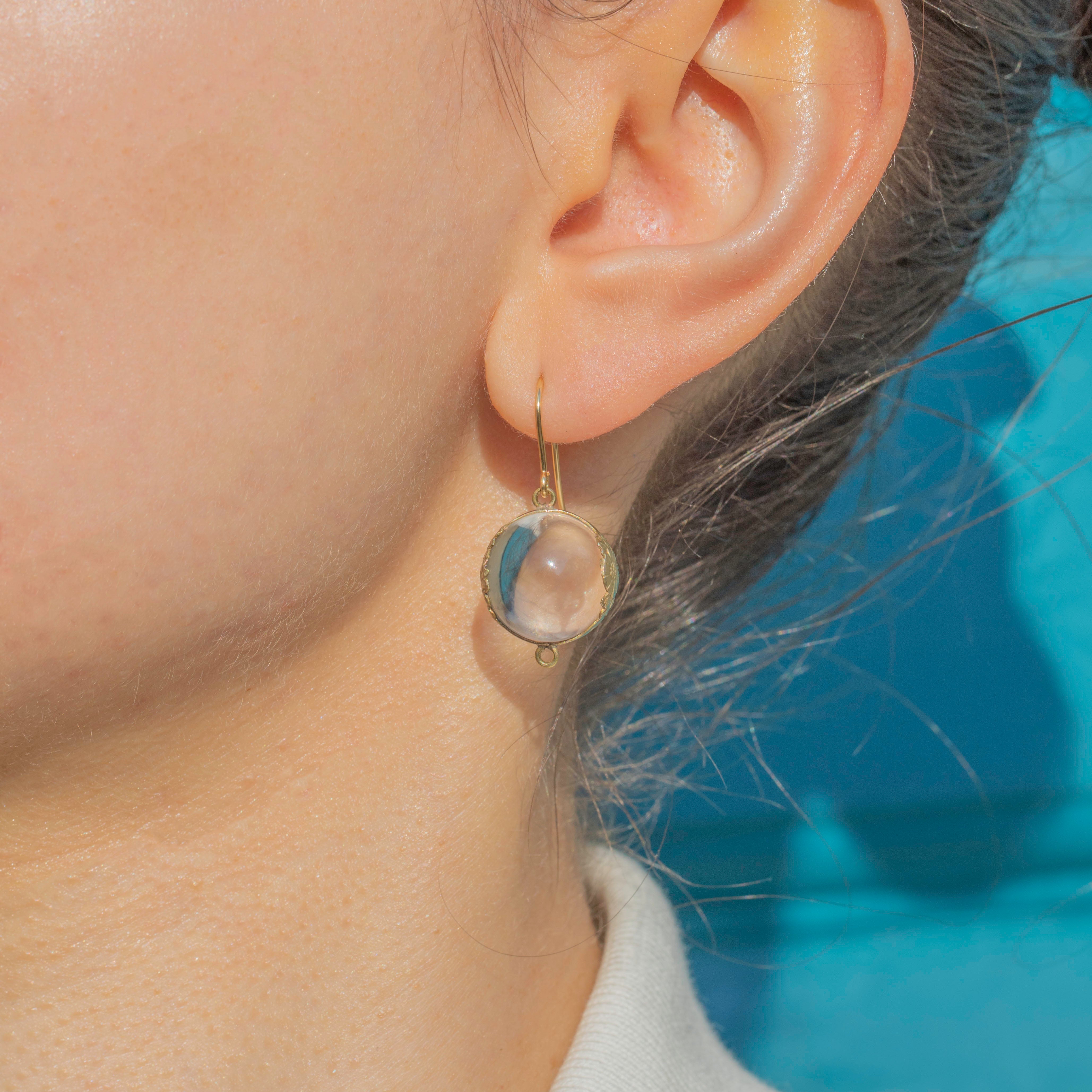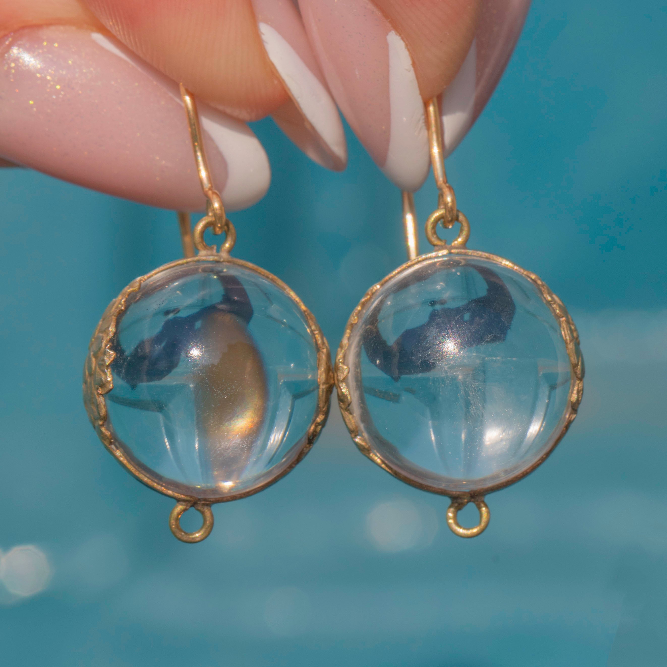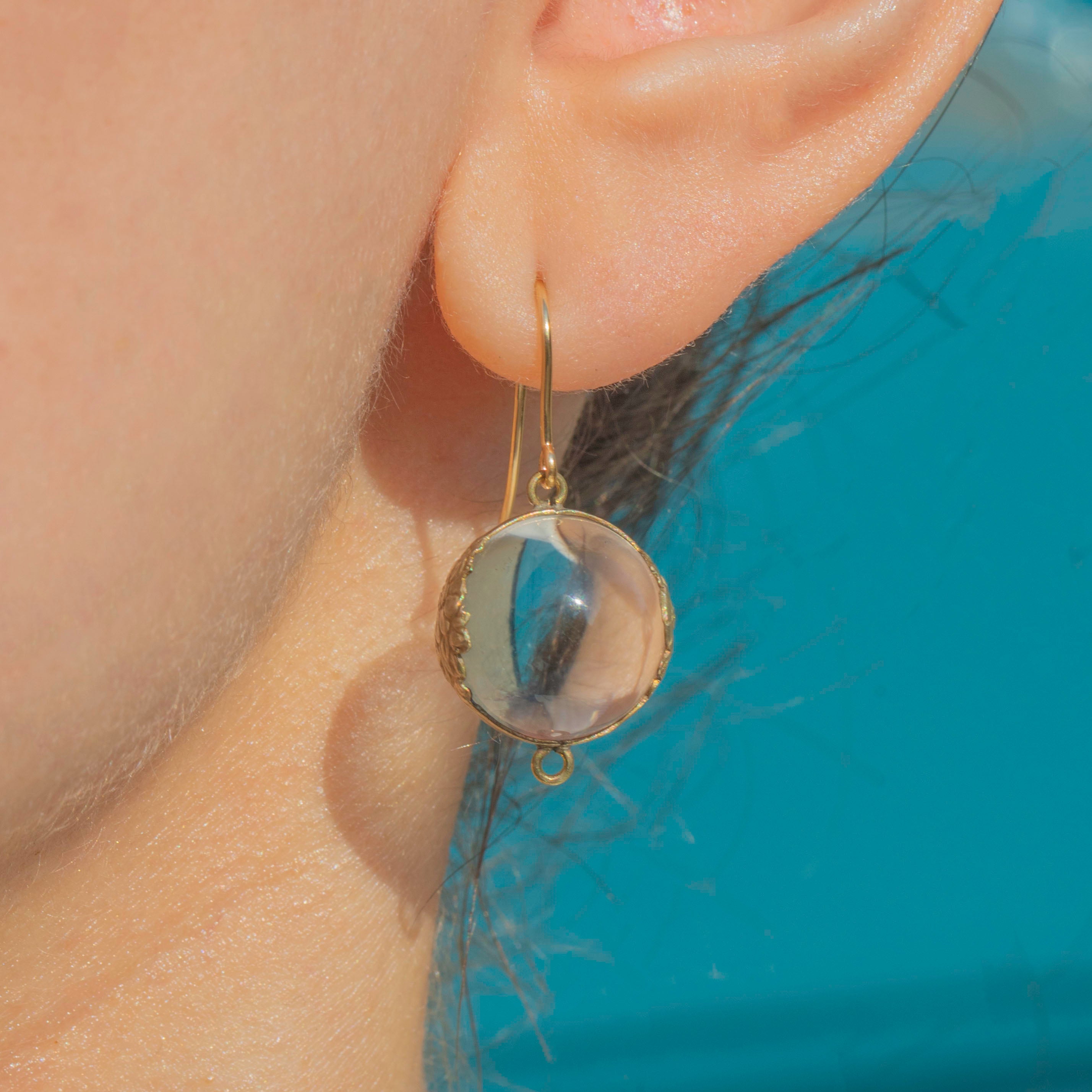 These Antique 9ct Gold Pools of Light Rock Crystal Earrings are a stunning example of timeless beauty. Set in detailed floral Silver mounts, the luminous Rock Crystal orbs hang gracefully from solid 9ct Gold hooks, blending antique craftsmanship with a modern edge.