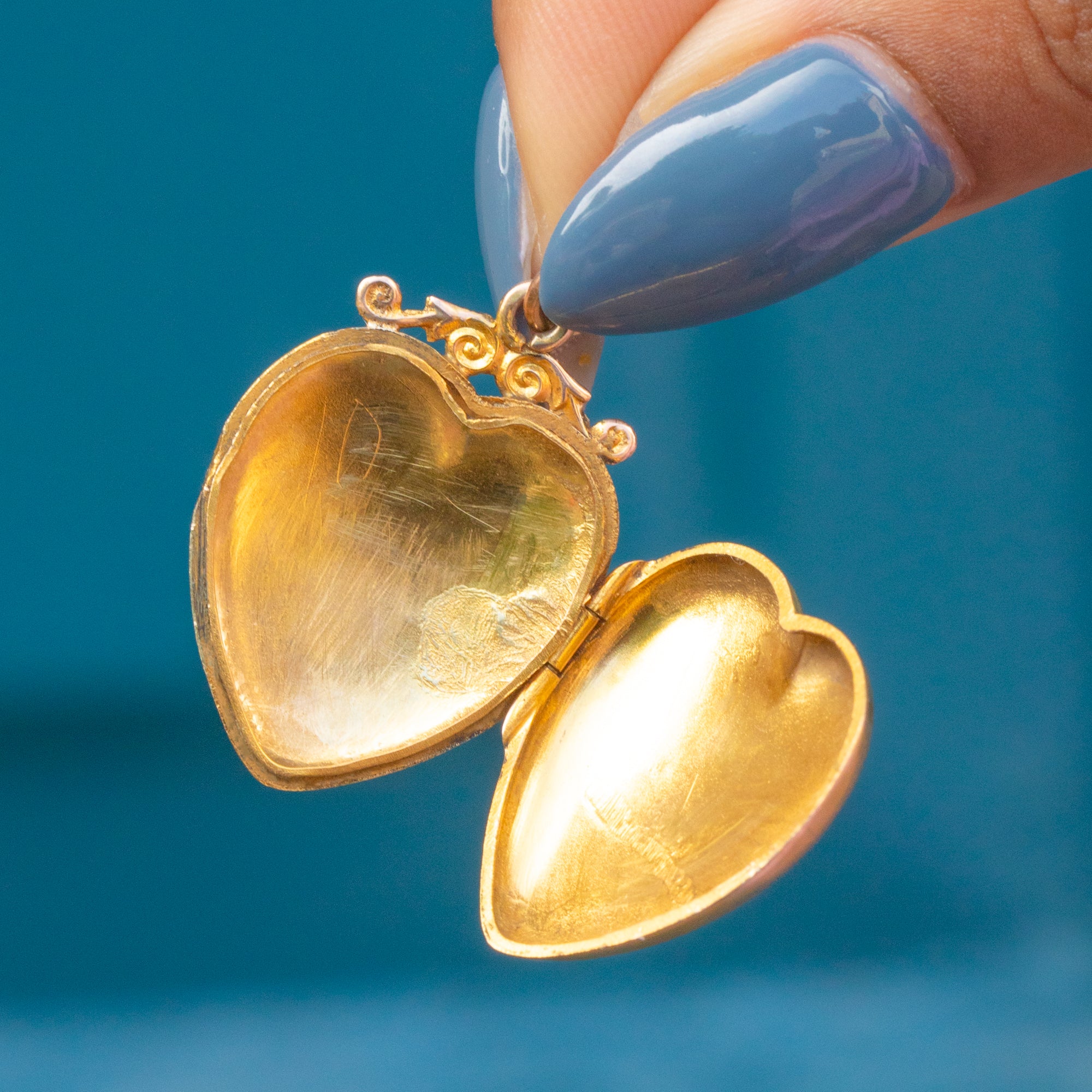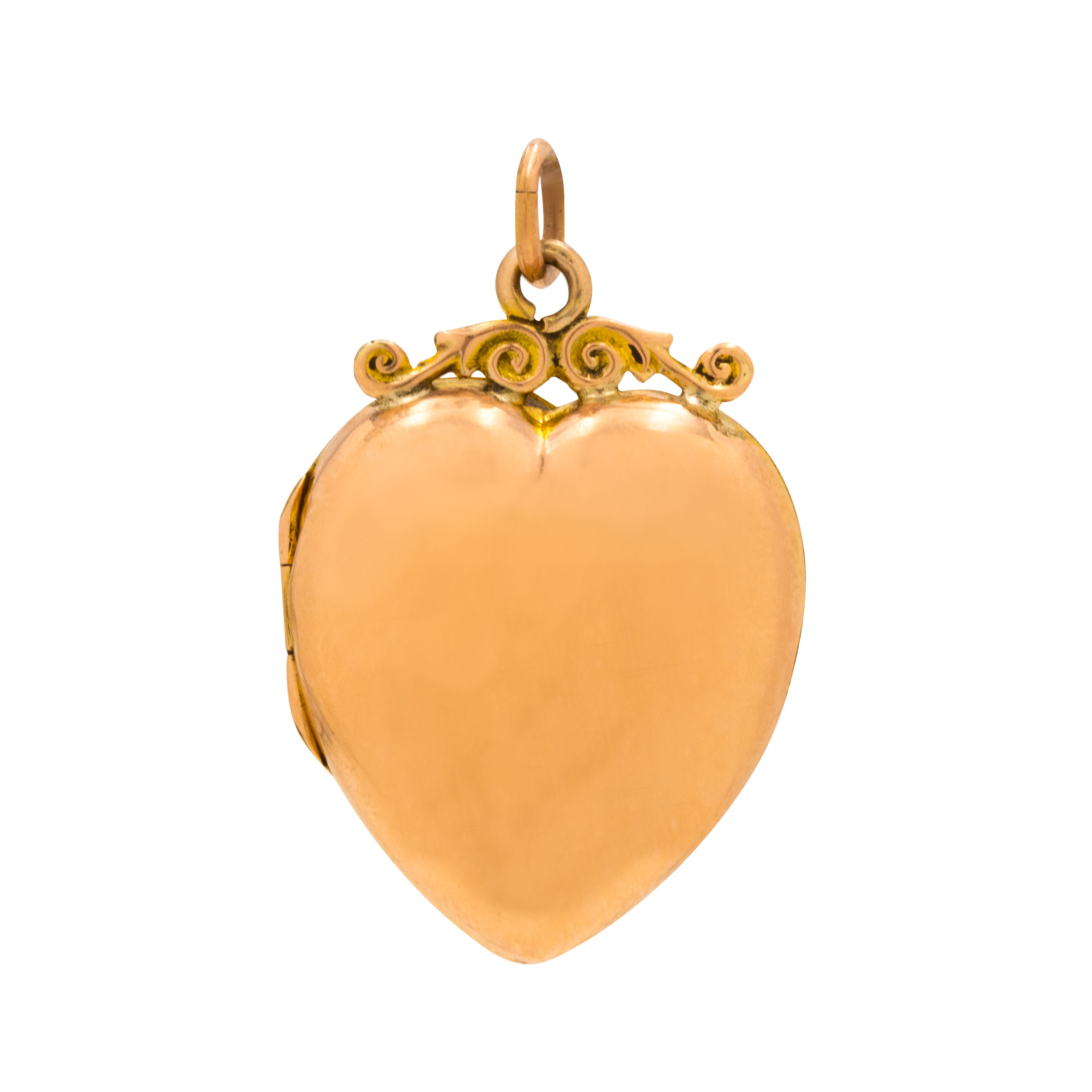 VERY GOOD. This antique 9ct Gold puffy heart locket is offered in very good condition. This Victorian locket is smooth to the touch and has a rosy hue throughout. The front of the locket does have tiny dings and some minor wear on the inside, but nothing major. The locket needs a good push to open as it is a little stiff, and it closes with a click. The jump ring holds the locket securely, allowing you to wear her comfortably and confidently!