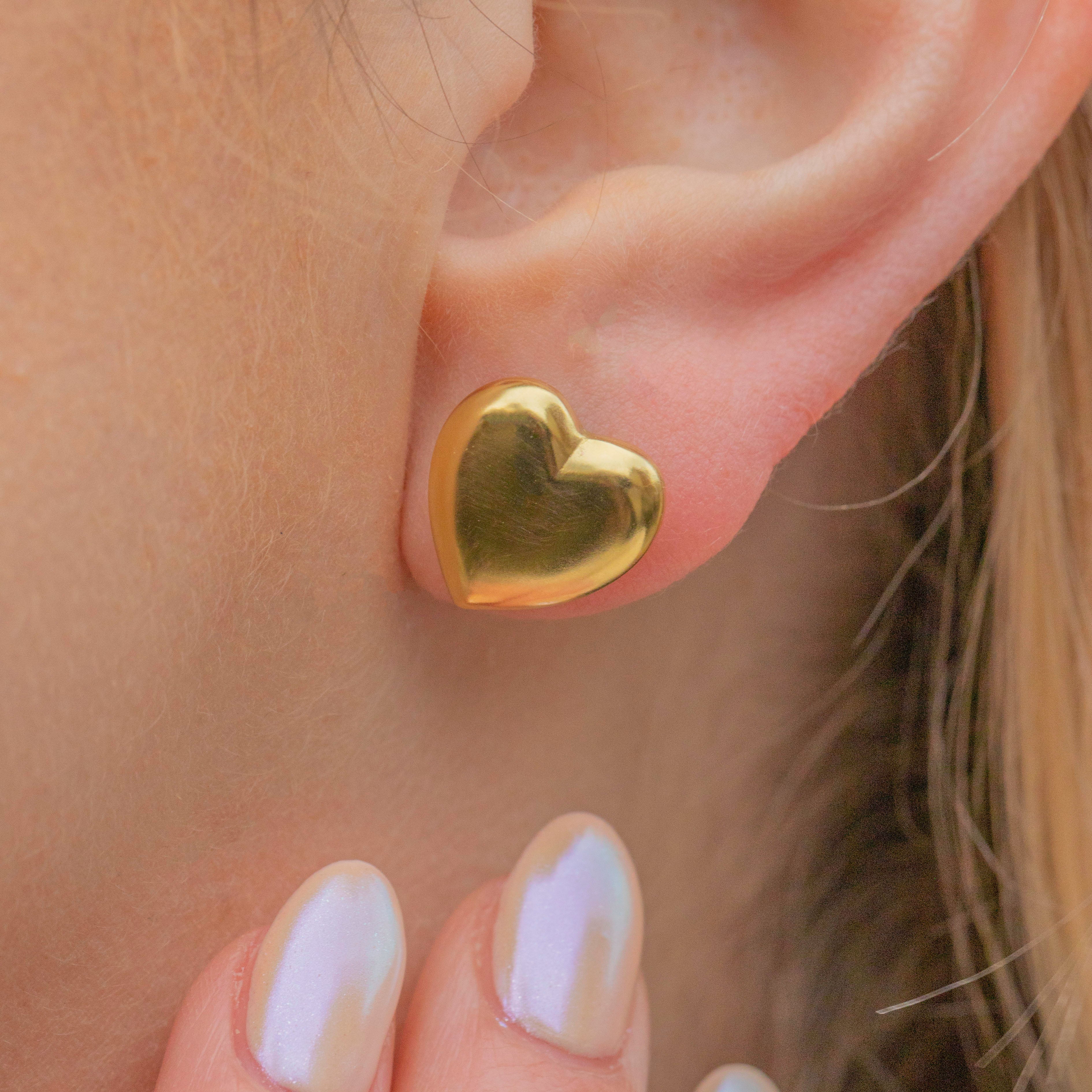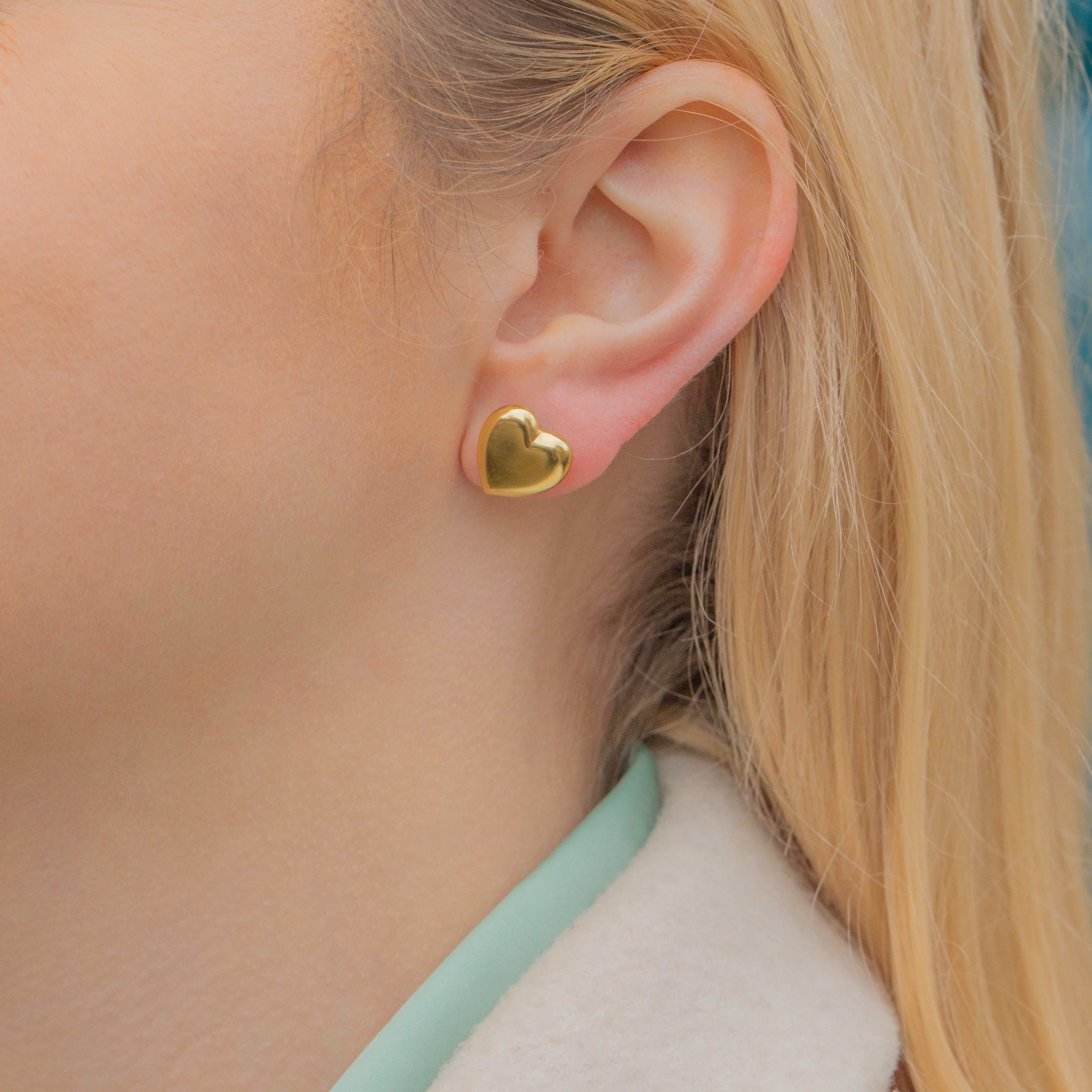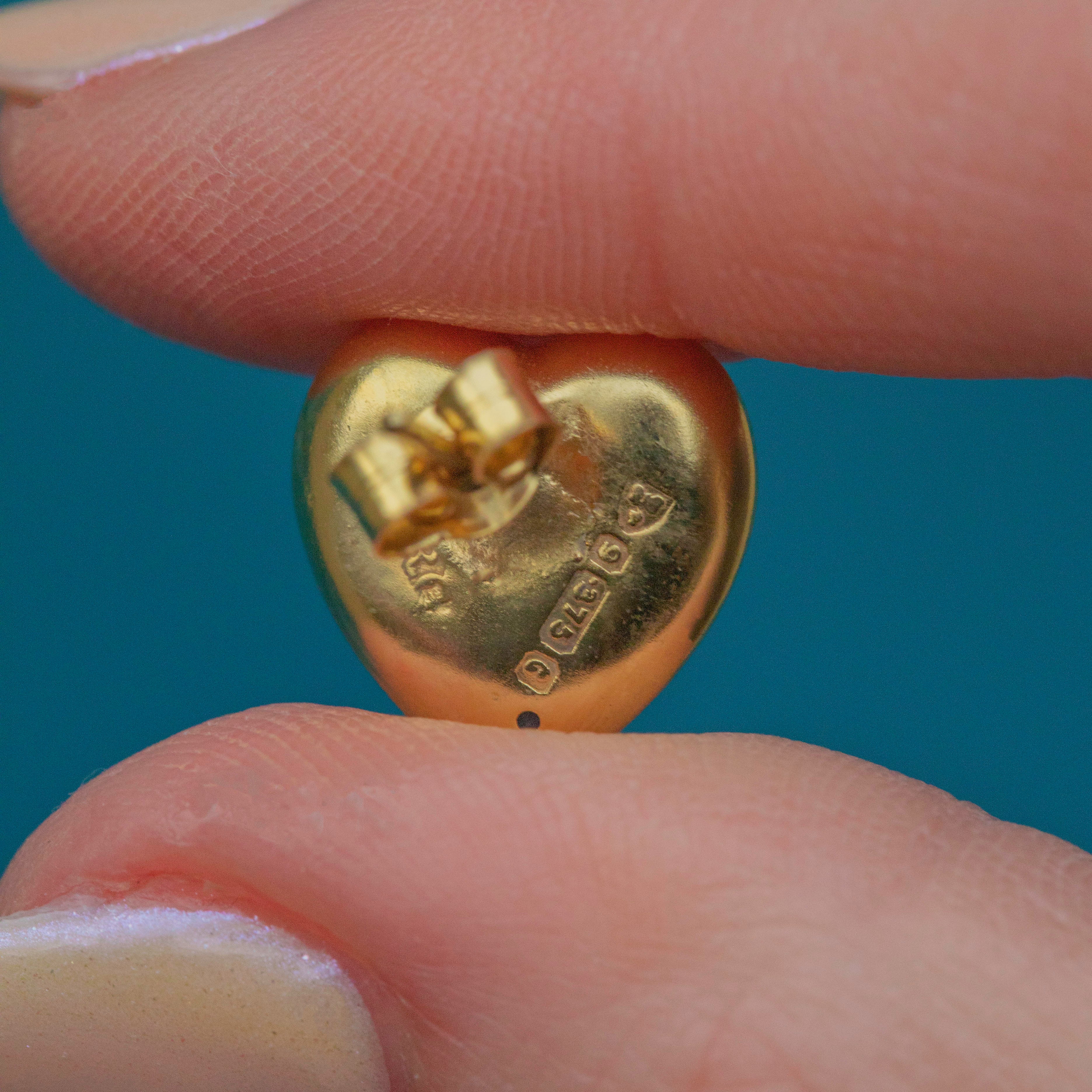 EXCELLENT. These 9ct Gold puffy heart stud earrings are in excellent condition. This pretty pair of earrings are smooth, and have a crisp set of hallmarks to the back. The front of the earrings have a smooth, almost matt finish, and will be ready to wear straight from the box.