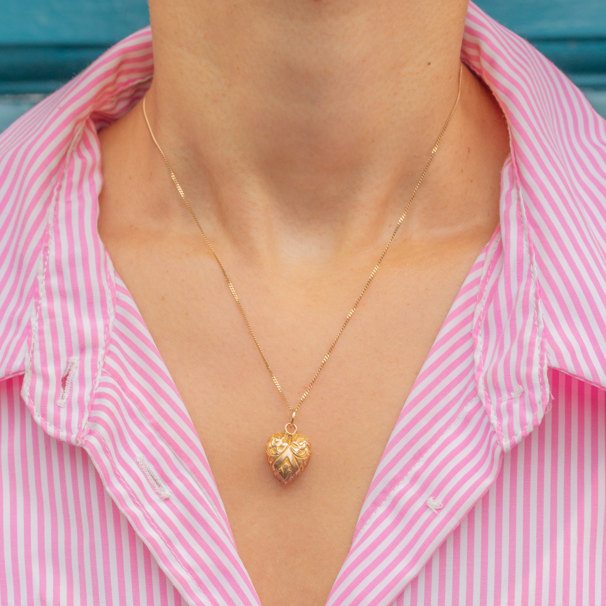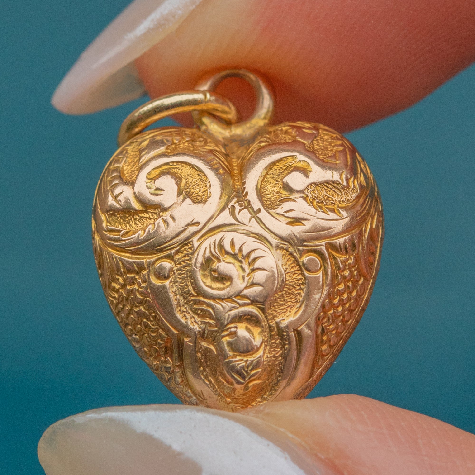 This romantic antique heart pendant is crafted from bright and glossy 9ct Gold, carrying with it ornate repoussé details that can be admired from every angle.