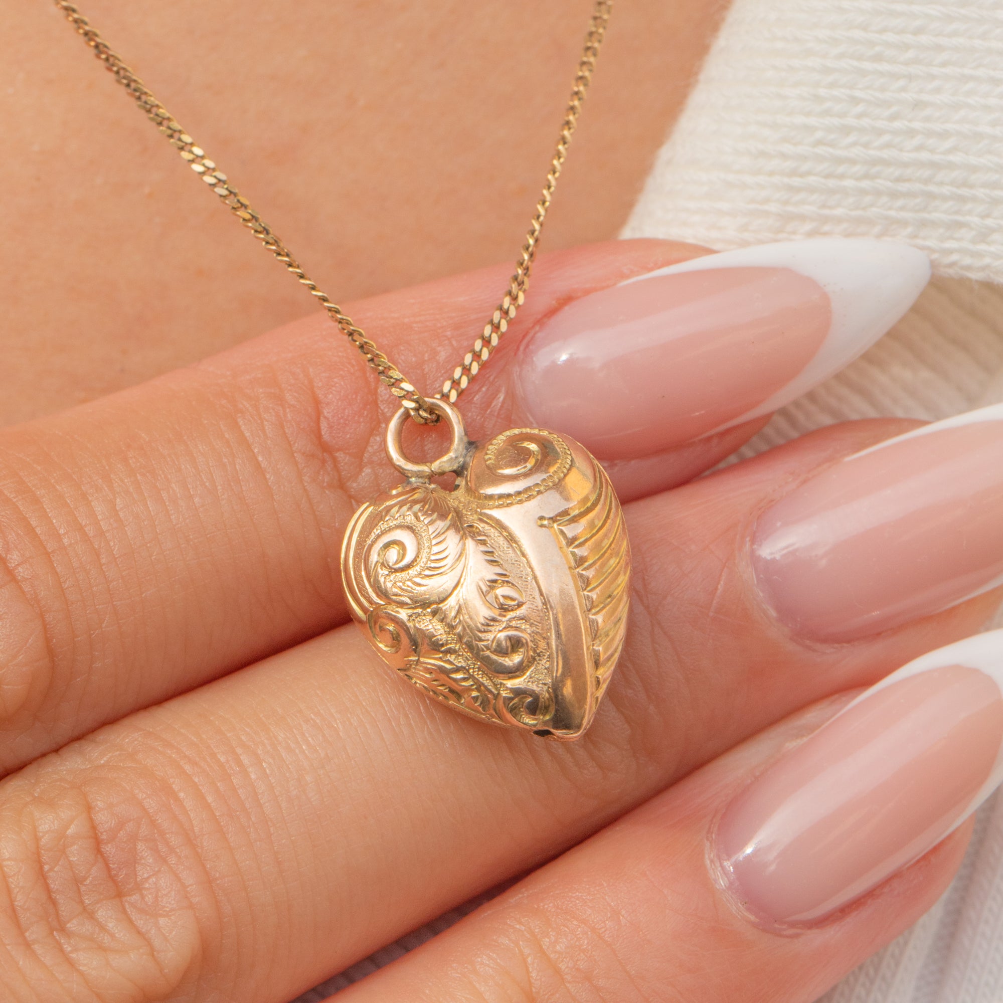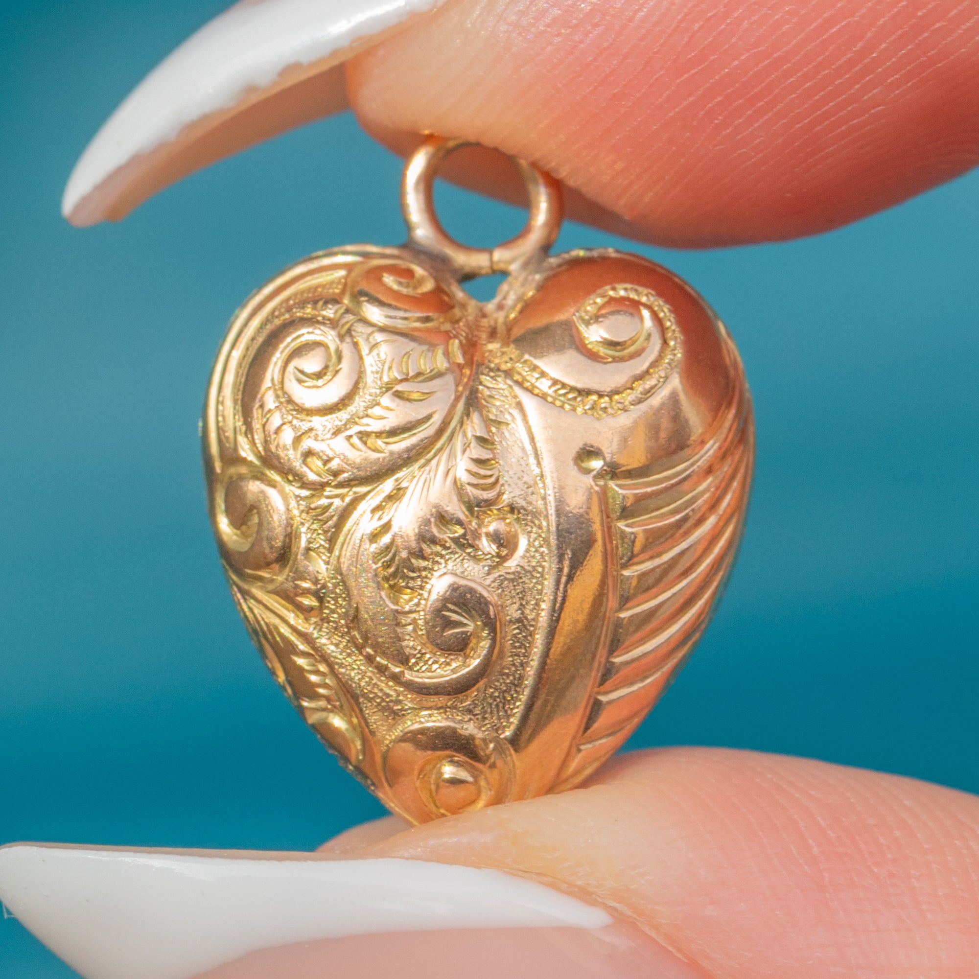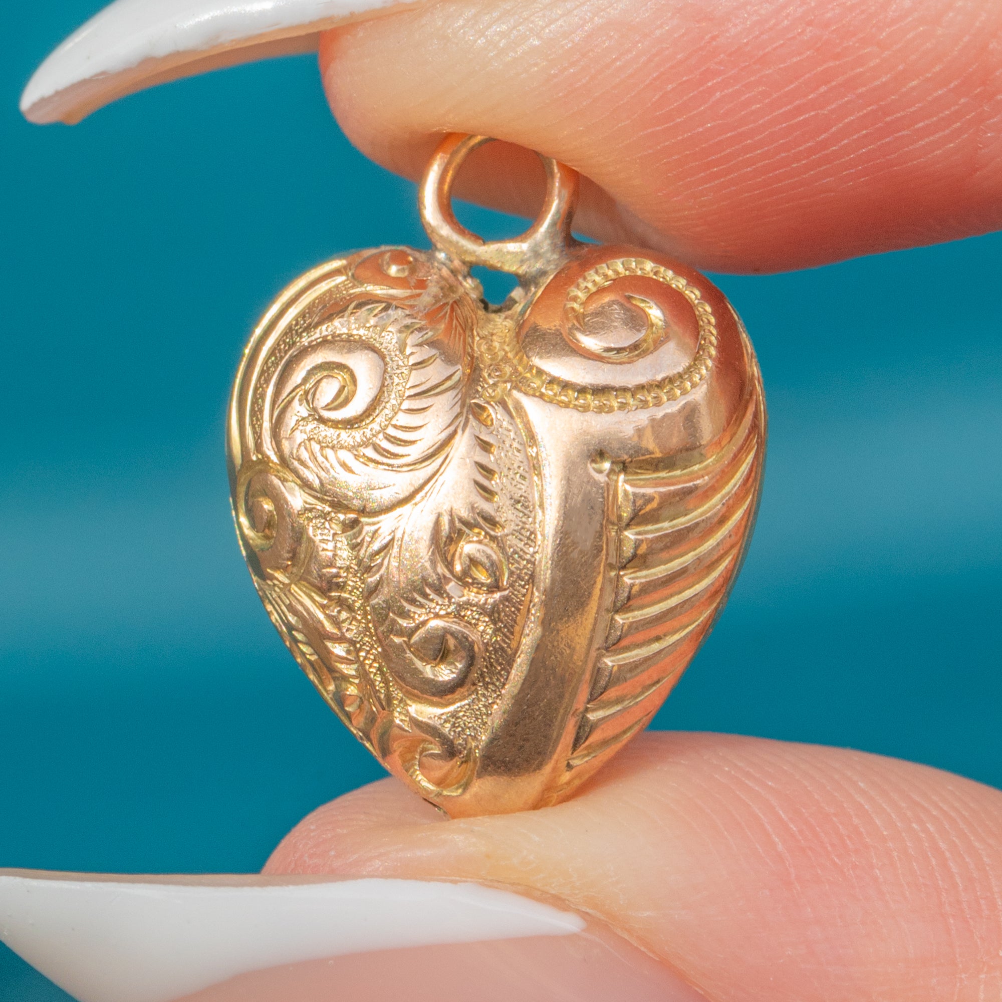 EXCELLENT: The Gold is bright and smooth, with crisp repousse detail and no dents or damage. A lovely example of a Victorian puffy heart pendant in superb condition.