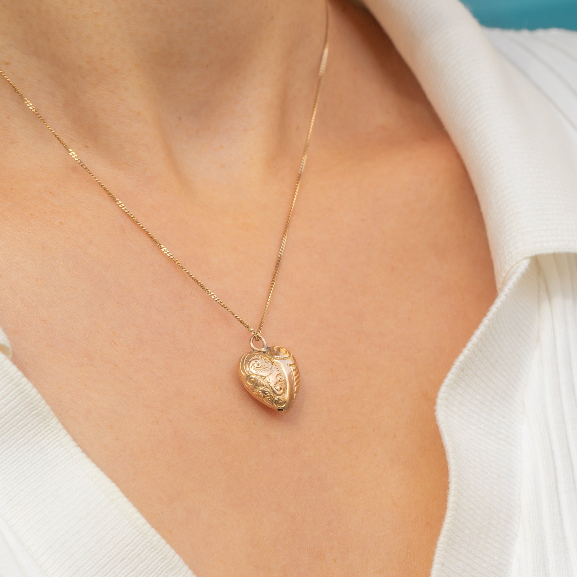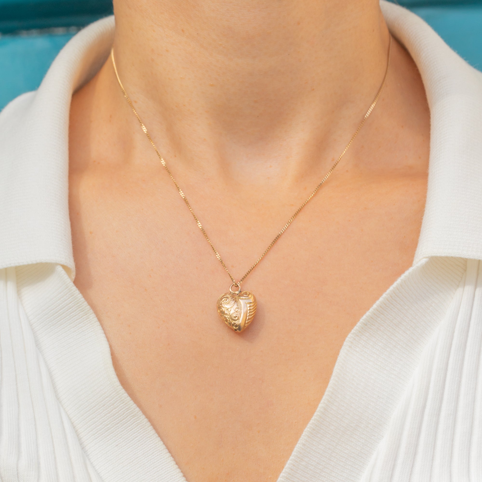 A charming Victorian puffy heart pendant crafted in 9ct Gold, decorated with delicate repousse detail. Lightly domed on both sides, the pendant has a soft, romantic look with a lovely antique glow. A classic symbol of love, this is a timeless piece perfect for wearing alone or layered with other antique charms and pendants.