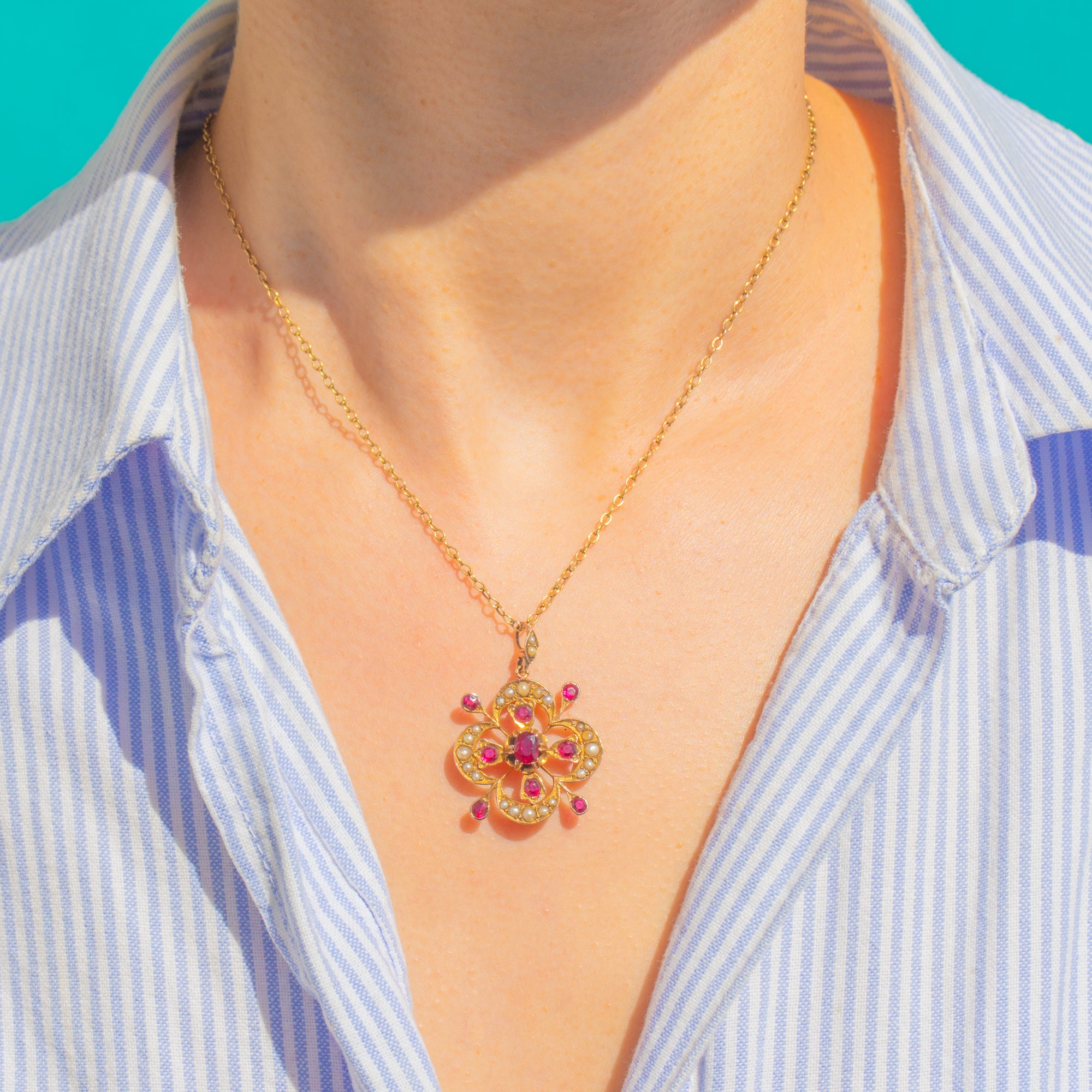 A romantic Victorian treasure, this 9ct Gold clover pendant blooms with vivid Natural Rubies and luminous Natural Pearls. The openwork quatrefoil silhouette is centred by a raised oval Ruby, with further Rubies radiating like petals and delicate Pearls tracing the curves for a softly glowing halo. Its warm Gold tone and fine detailing give the piece a graceful, heirloom presence.