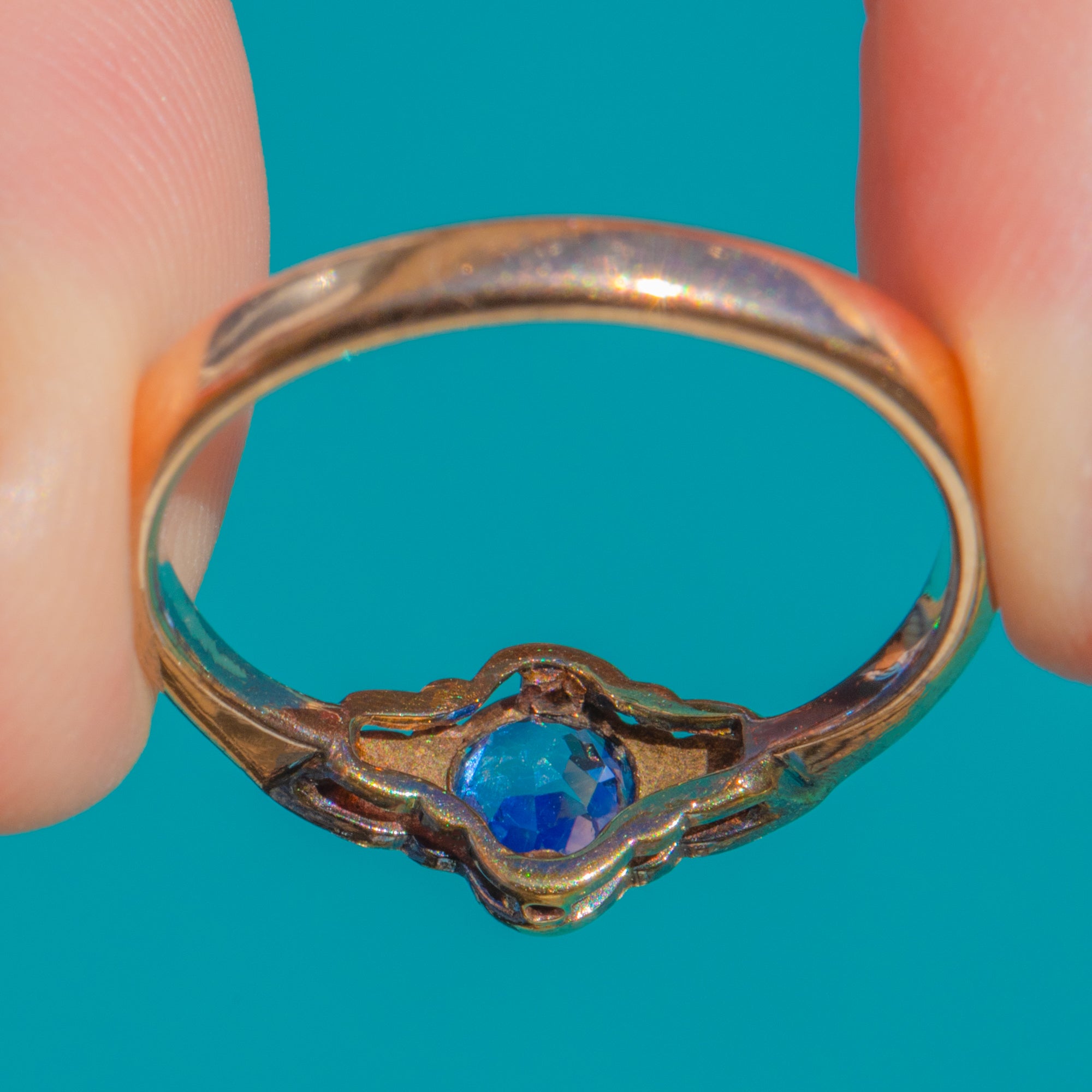 MATERIALS: Tests as 9ct Gold, Sapphire (0.40ct), Rose-Cut Diamonds.