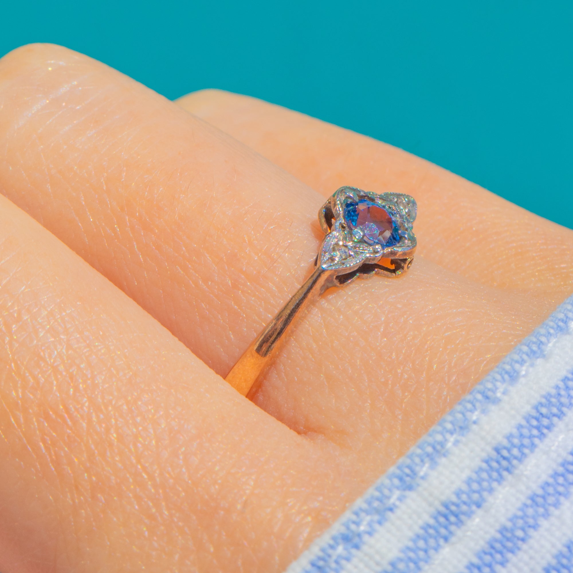 A delicate early 20th-century beauty, this antique ring centres a vivid, cornflower-blue Sapphire framed by a white-toned, milgrained head and flanked by twinkling rose-cut Diamond accents. The low, hand-finished collet and pierced gallery lend wonderful finesse, while the slender warm Gold shank creates an elegant two‑tone look that feels timeless on the hand.