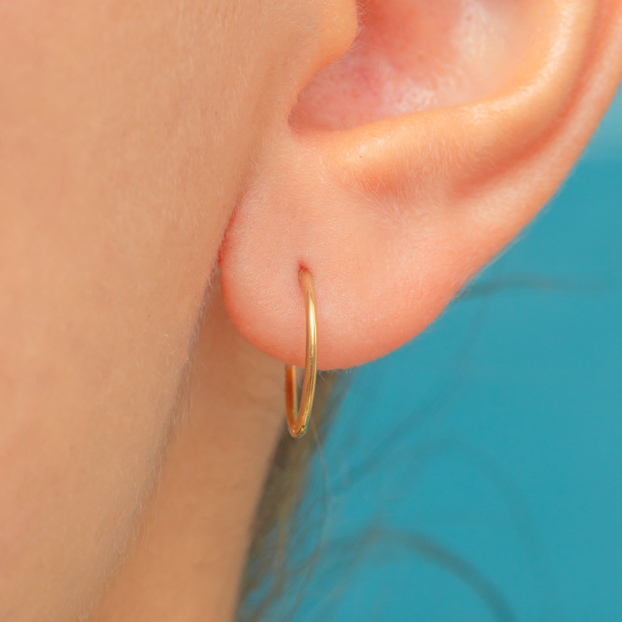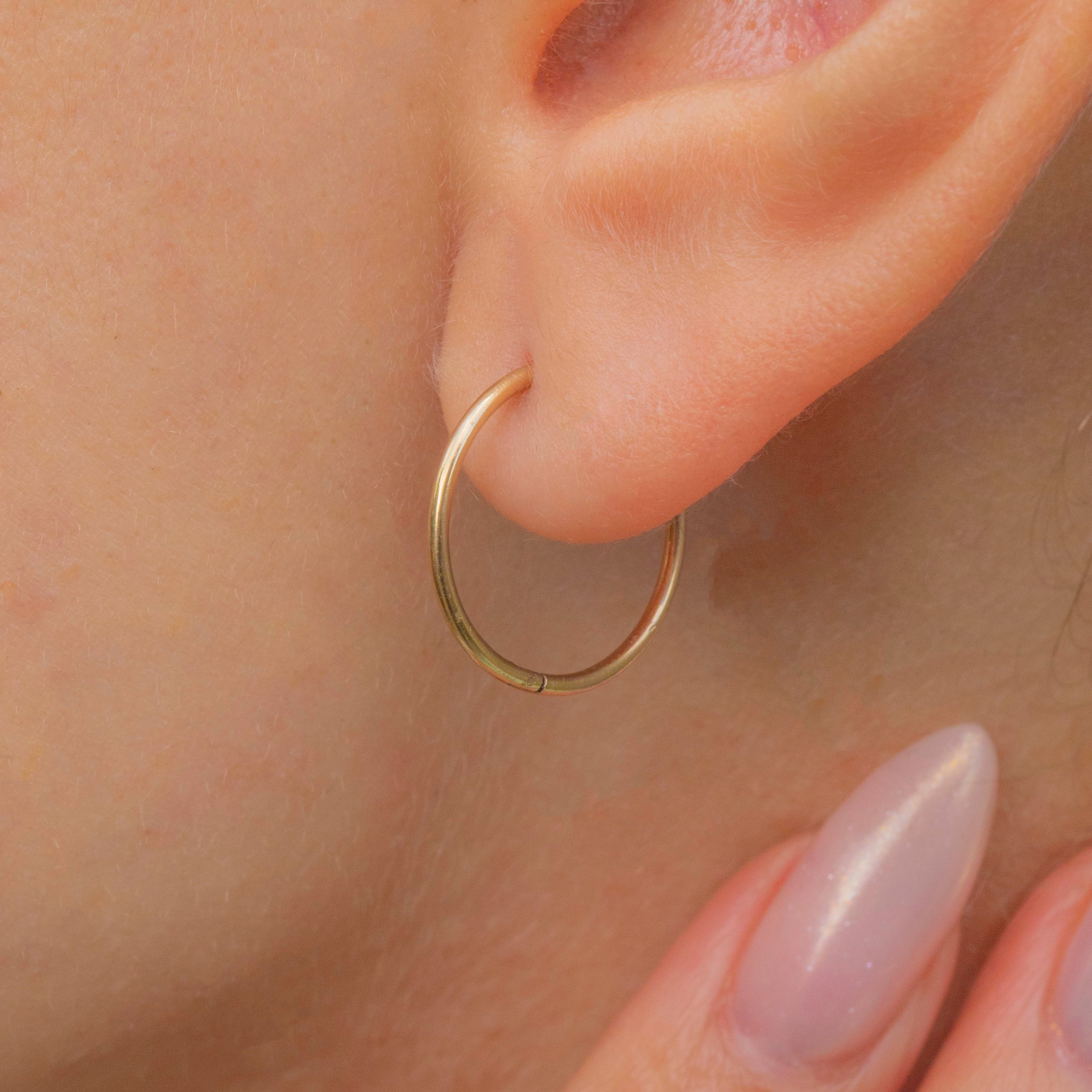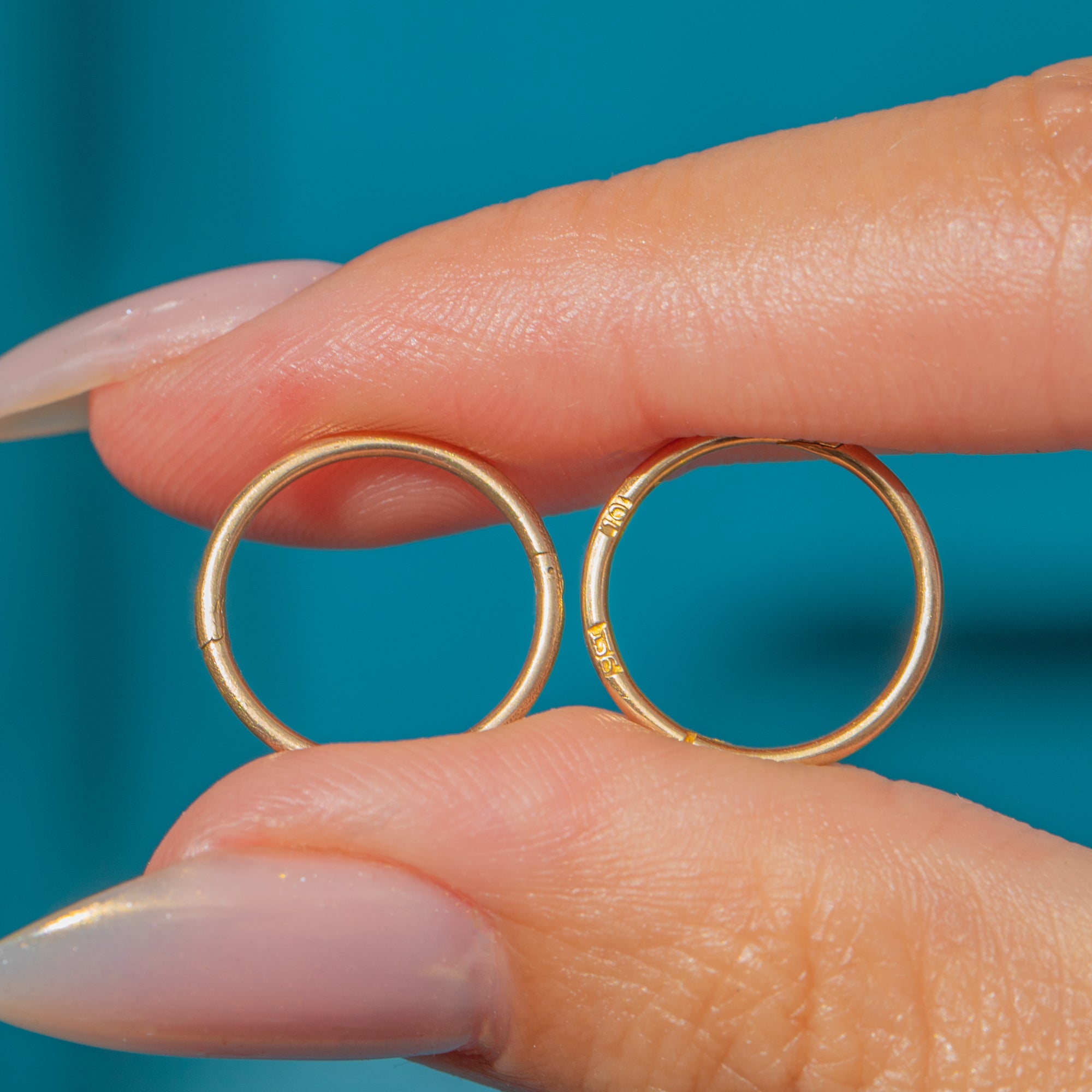 A charming Antique 9ct Gold sleeper hoop earring, petite in size at 14mm in diameter. Crafted in warm 9ct Gold, this subtle hoop carries the simple, elegant design typical of antique sleepers, perfect for everyday wear or as a subtle accent in a curated ear stack.